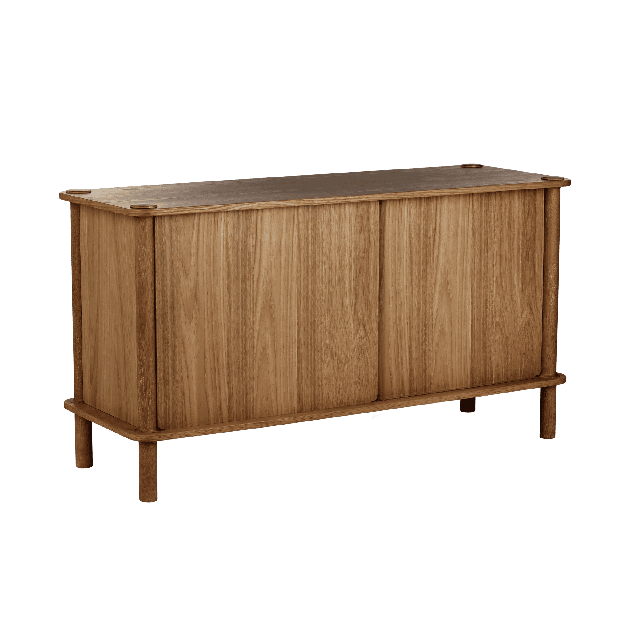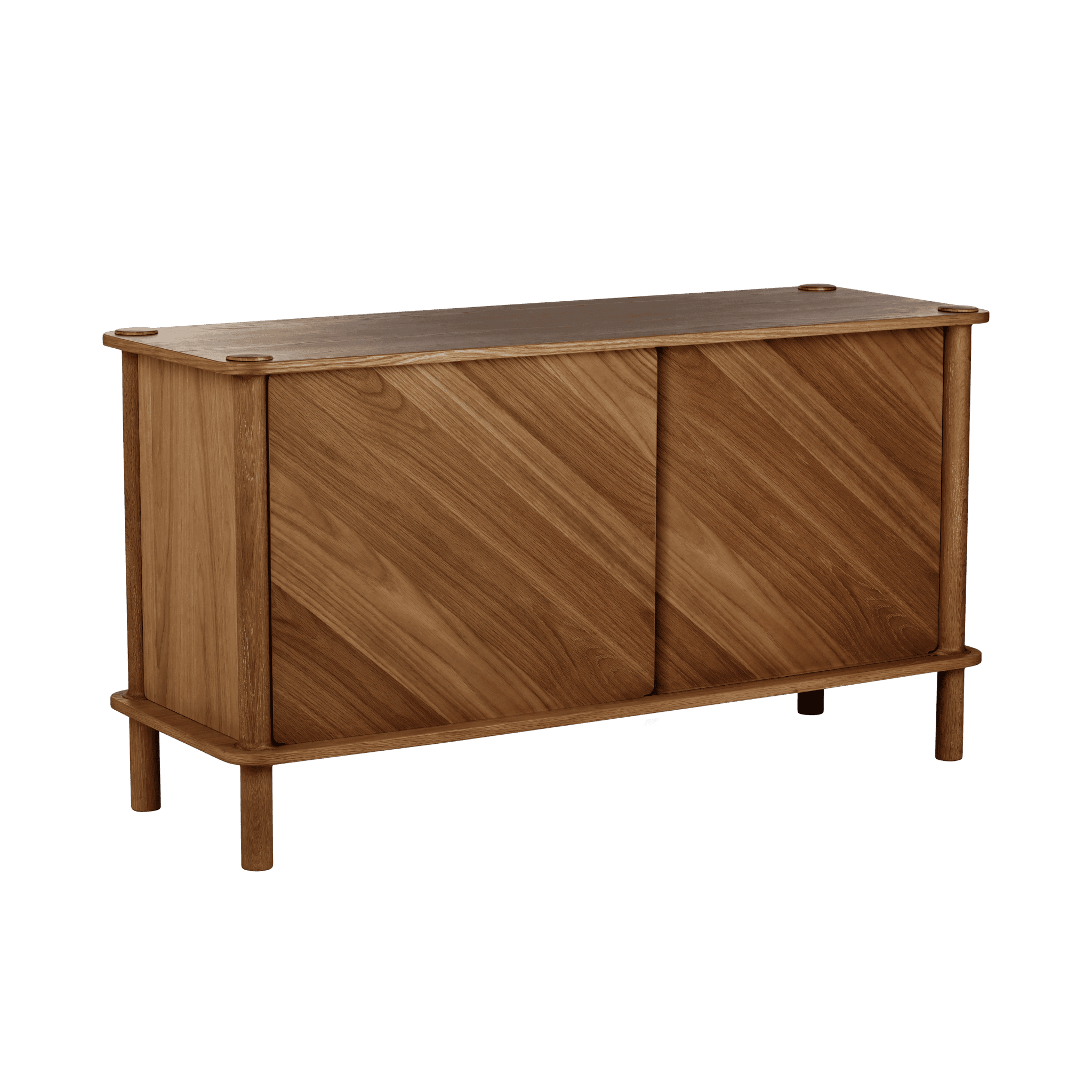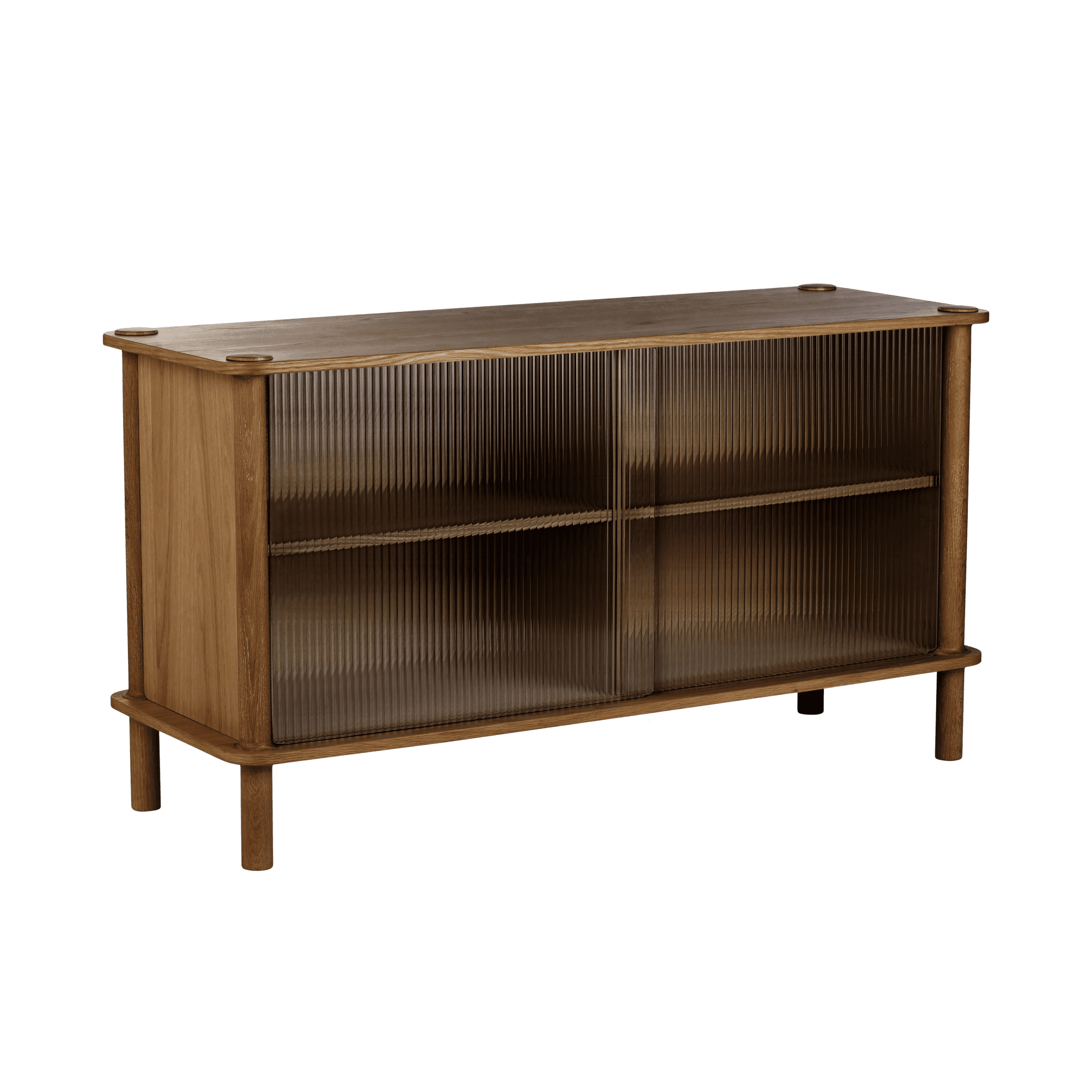 Dzięki drzwiom komody wykonanym z ryflowanego szkła lub drewna dębowego, można spersonalizować i podnieść poziom estetyki wnętrza. Drzwi można wymieniać i dopasowywać, tworząc efekt harmonizujący z każdym stylem. Drewniane drzwi posiadają dwustronne wykończenie: jedna strona z fornirowanym panelem ukośnym, nadająca meblowi wyjątkowy charakter, a druga strona z okleiną pionową, zapewniająca ponadczasowy wygląd.