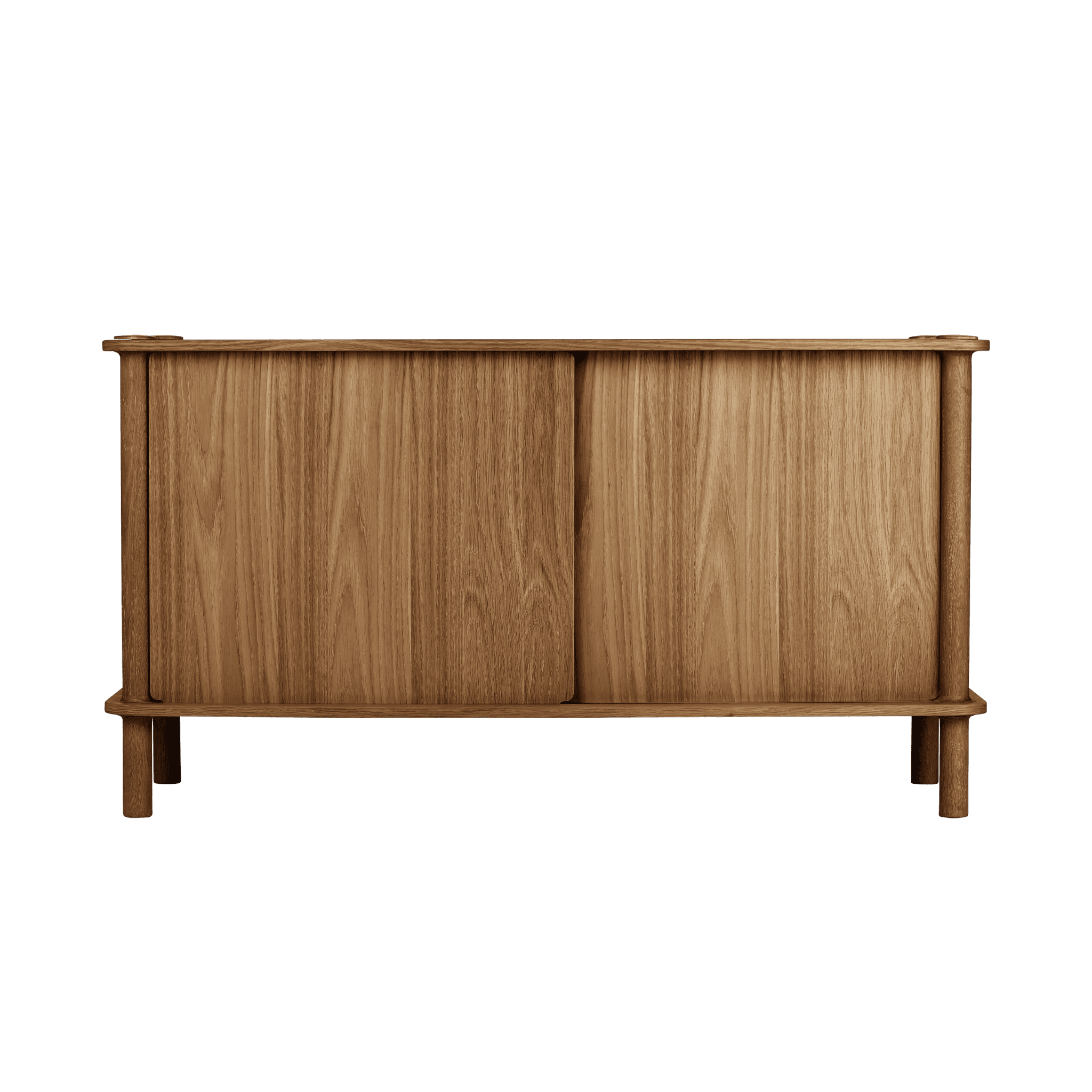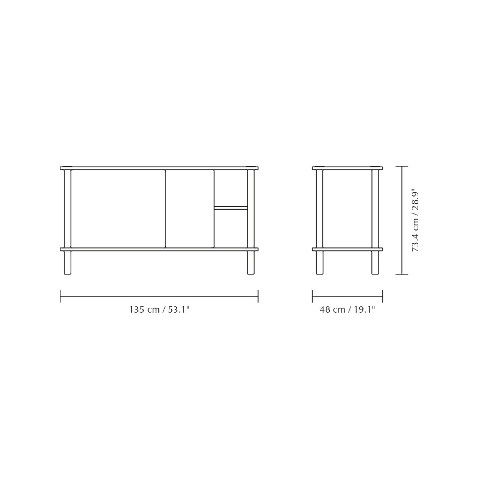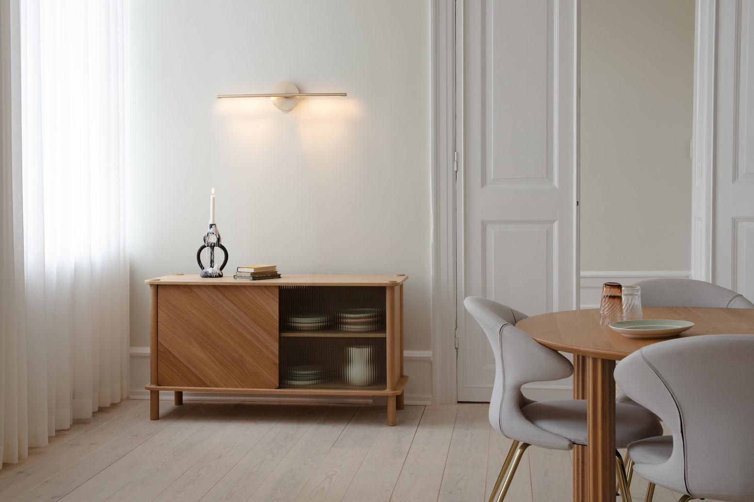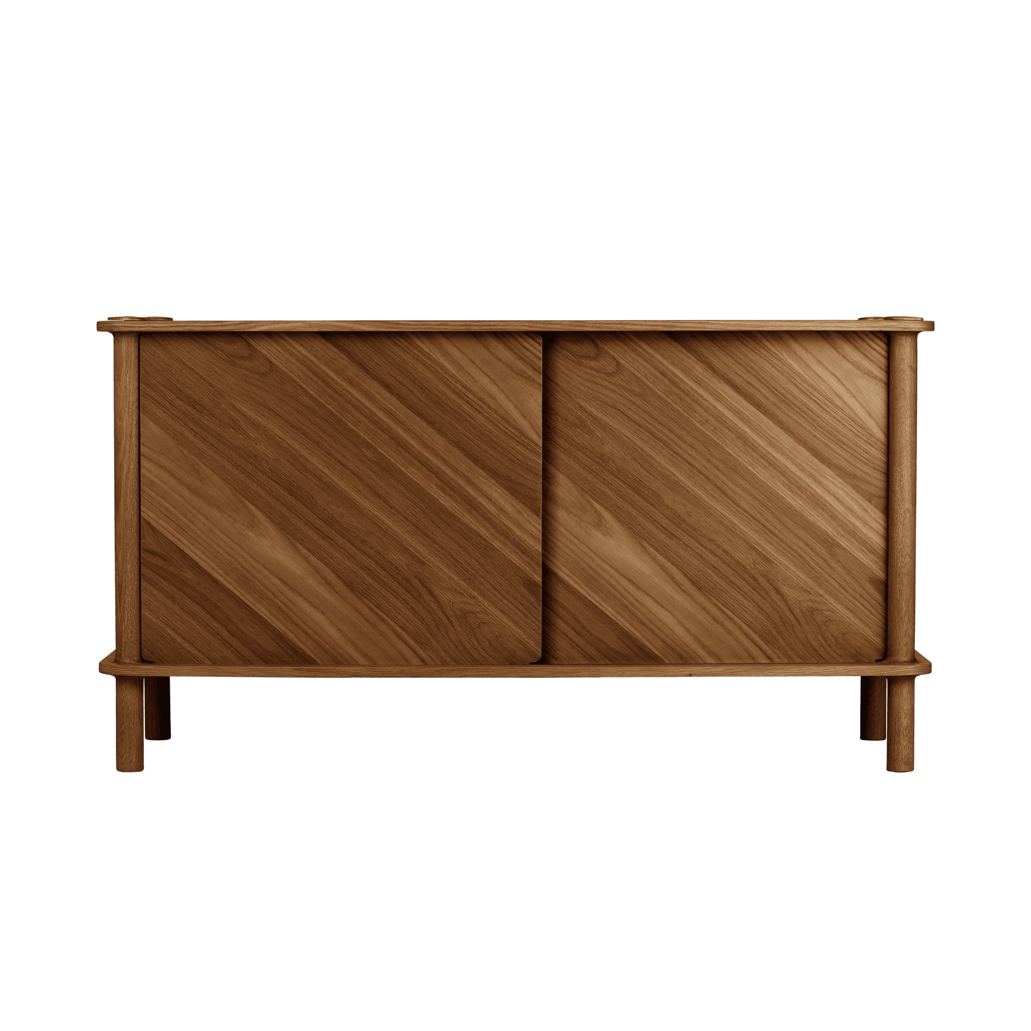 Dzięki drzwiom komody wykonanym z ryflowanego szkła lub drewna dębowego, można spersonalizować i podnieść poziom estetyki wnętrza. Drzwi można wymieniać i dopasowywać, tworząc efekt harmonizujący z każdym stylem. Drewniane drzwi posiadają dwustronne wykończenie: jedna strona z fornirowanym panelem ukośnym, nadająca meblowi wyjątkowy charakter, a druga strona z okleiną pionową, zapewniająca ponadczasowy wygląd.