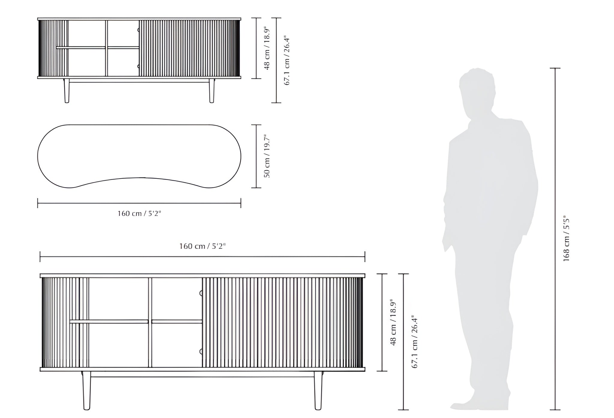 Charakterystyczne przesuwane drzwi tambour wykonane z tkaniny nie tylko przyciągają wzrok, ale również nadają meblowi subtelnego, luksusowego wyrazu. Regulowane półki i dyskretnie ukryte otwory w tylnej ściance umożliwiają przechowywanie sprzętu RTV bez zakłócania estetyki wnętrza. Co więcej, drzwi tambour można łatwo wymieniać, nadając komodzie nowy wygląd bez konieczności wymiany całego mebla - to rozwiązanie przyjazne środowisku i trwałe w czasie.