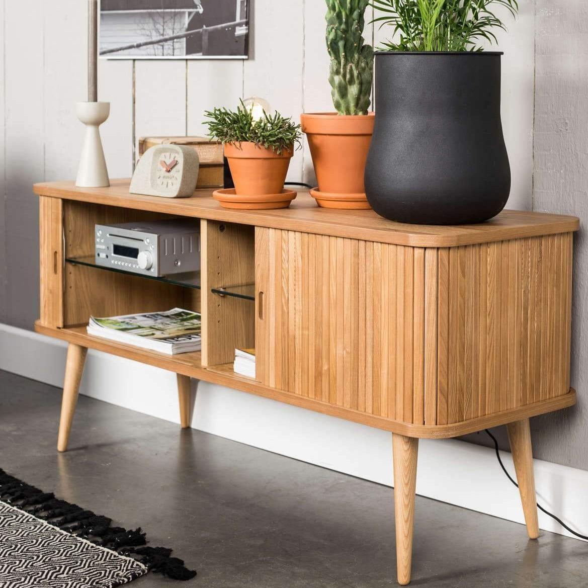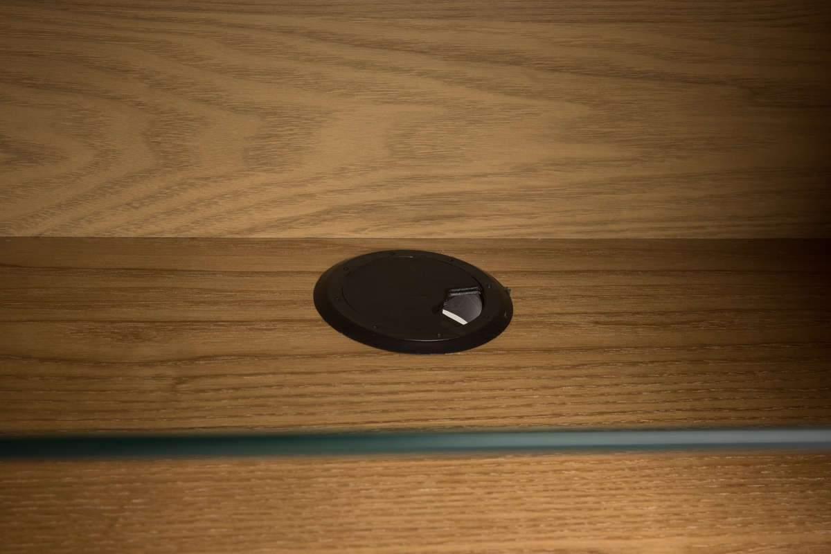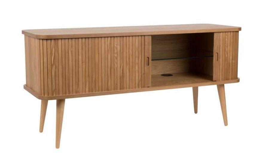 Górna i dolna część z forniru z jesionu MDF 18 mm. Solidne nogi i drzwi z jesionu, PU-lakierowane. Wewnątrz znajdują się dwie półki 6 mm ze szkła hartowanego, których wysokość można regulować. W obu przedziałach zamontowano otwór wentylacyjny