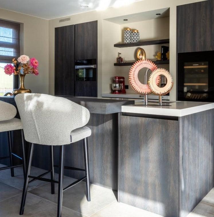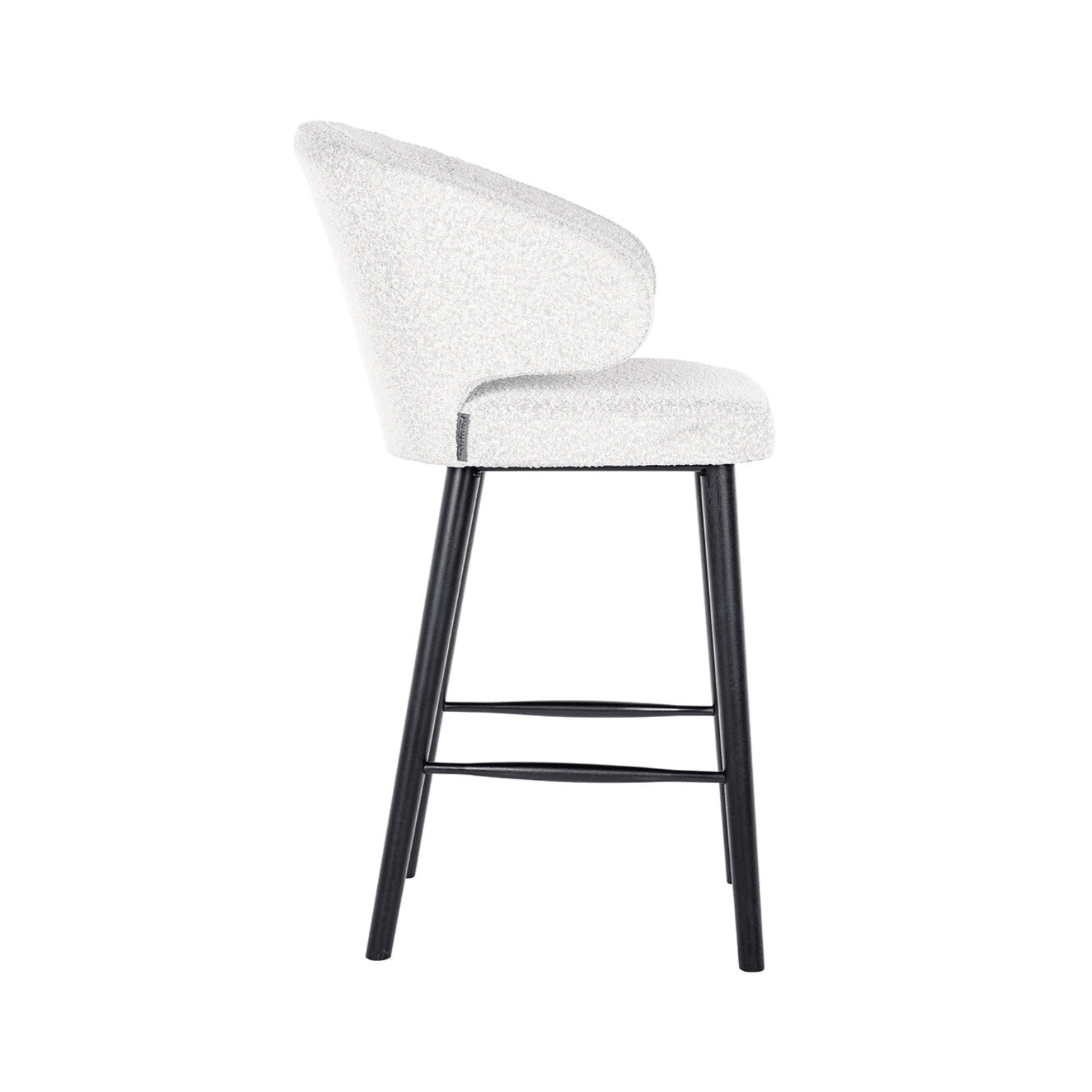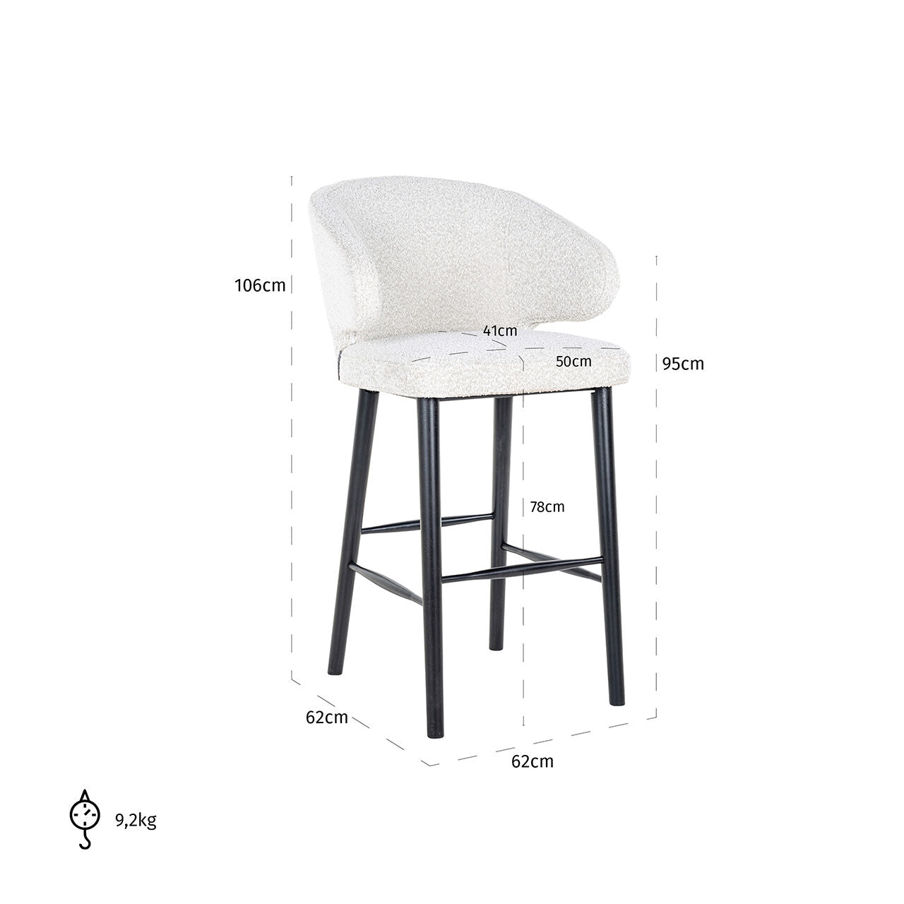 Krzesło barowe Indigo to wyjątkowy mebel, który wyróżnia się luksusowym i ponadczasowym wyglądem. Jego kształtne oparcie zostało starannie wykonane z pięknej tkaniny Bouclé o eleganckim białym odcieniu, nadając mu wyjątkowy charakter. Tkanina Bouclé to produkt o niezwykłym wzornictwie, doskonale harmonizujący z nadchodzącymi trendami w dziedzinie wnętrz.