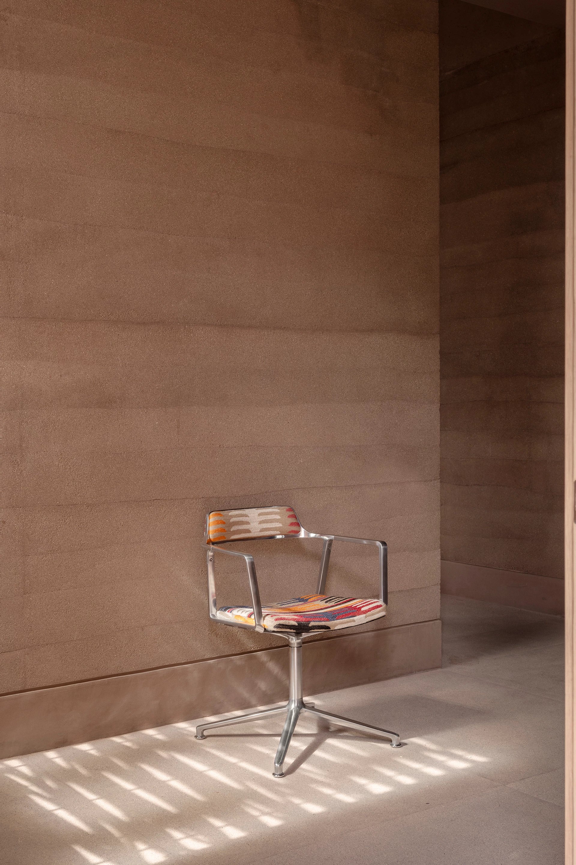 Krzesło biurowe 452 to wyjątkowa propozycja stworzona pierwotnie dla Vipp Todos Santos w Meksyku, łącząca industrialną konstrukcję z wyrazistą tkaniną Pierre Frey. To krzesło biurowe przyciąga uwagę intensywnymi kolorami i bogatą fakturą, które nadają wnętrzu indywidualny charakter, a jednocześnie zapewniają wysoki komfort codziennego użytkowania. Obrotowa podstawa i doskonale wyprofilowane siedzisko sprzyjają ergonomii, dzięki czemu krzesło biurowe sprawdzi się zarówno w przestrzeni roboczej, jak i w eleganckiej strefie spotkań.