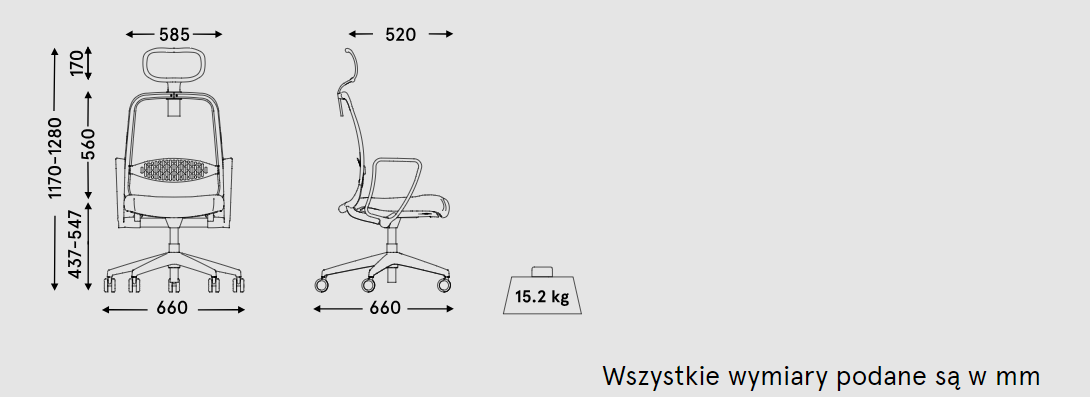 Podstawa - 5-cio ramienna, tworzywowa, Ø=680 mm, h=124 mm; opcja z dopłatą - 5-cio ramienna, aluminium polerowane, Ø=680 mm, h=124 mm;