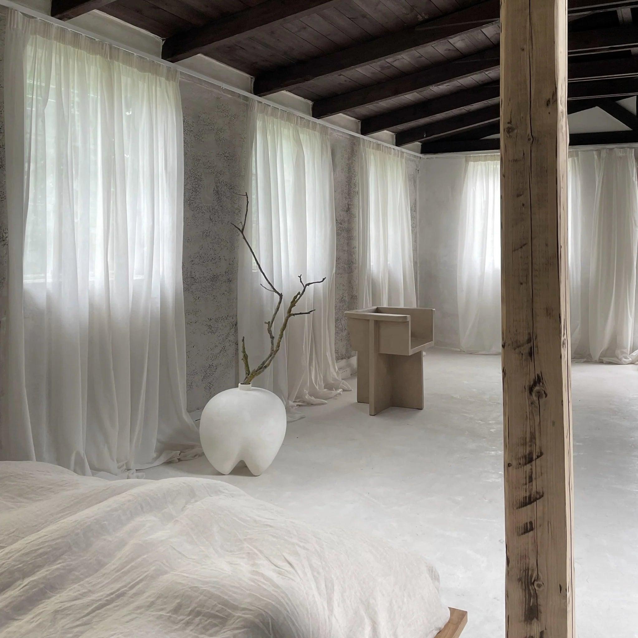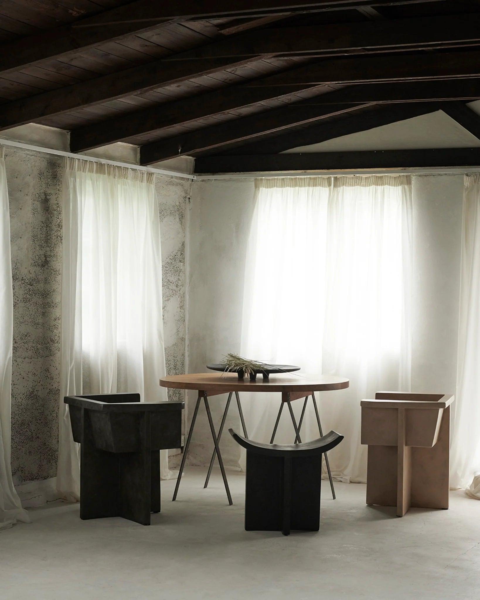 Nawiązujące do tradycyjnych japońskich drewnianych stołków, zakrzywione siedzisko i charakterystyczne skrzyżowane nogi stanowią idealne dodatkowe miejsce do siedzenia wokół stołu. Każdy element jest ręcznie malowany, aby stworzyć teksturowaną, niepowtarzalną powierzchnię. Kładąc nacisk na delikatną równowagę pomiędzy ostrymi liniami architektonicznymi i nieco łagodniejszą krzywizną oparcia i podłokietnika, kolekcja Brutus to wyraziste rzeźbiarskie elementy zapewniające zniewalający komfort siedzenia.