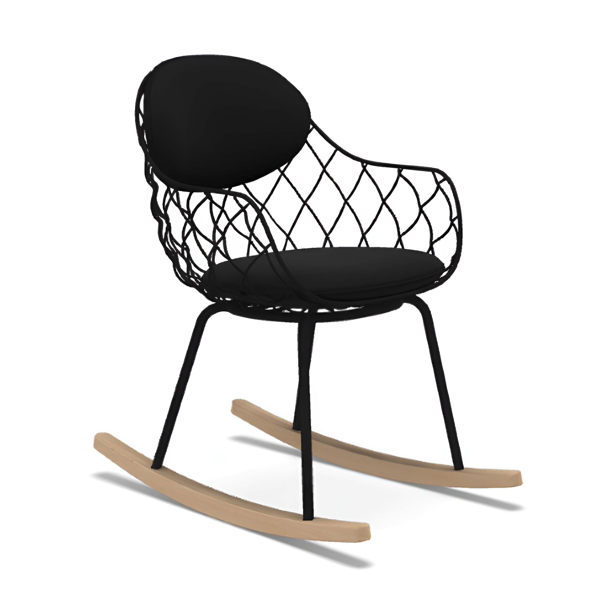 Krzesło bujane Piña, zaprojektowane przez Jaime'go Hayóna dla marki Magis, to wyjątkowe połączenie współczesnego designu z ponadczasową formą. Ażurowa konstrukcja oparcia wykonana ze stalowego pręta malowanego proszkowo nawiązuje do struktury ananasa – znaku rozpoznawczego całej kolekcji. Charakterystyczne, łukowate płozy z litego drewna jesionowego nadają krzesłu lekkości wizualnej i umożliwiają delikatne bujanie, wprowadzając element relaksu do codziennego użytkowania.