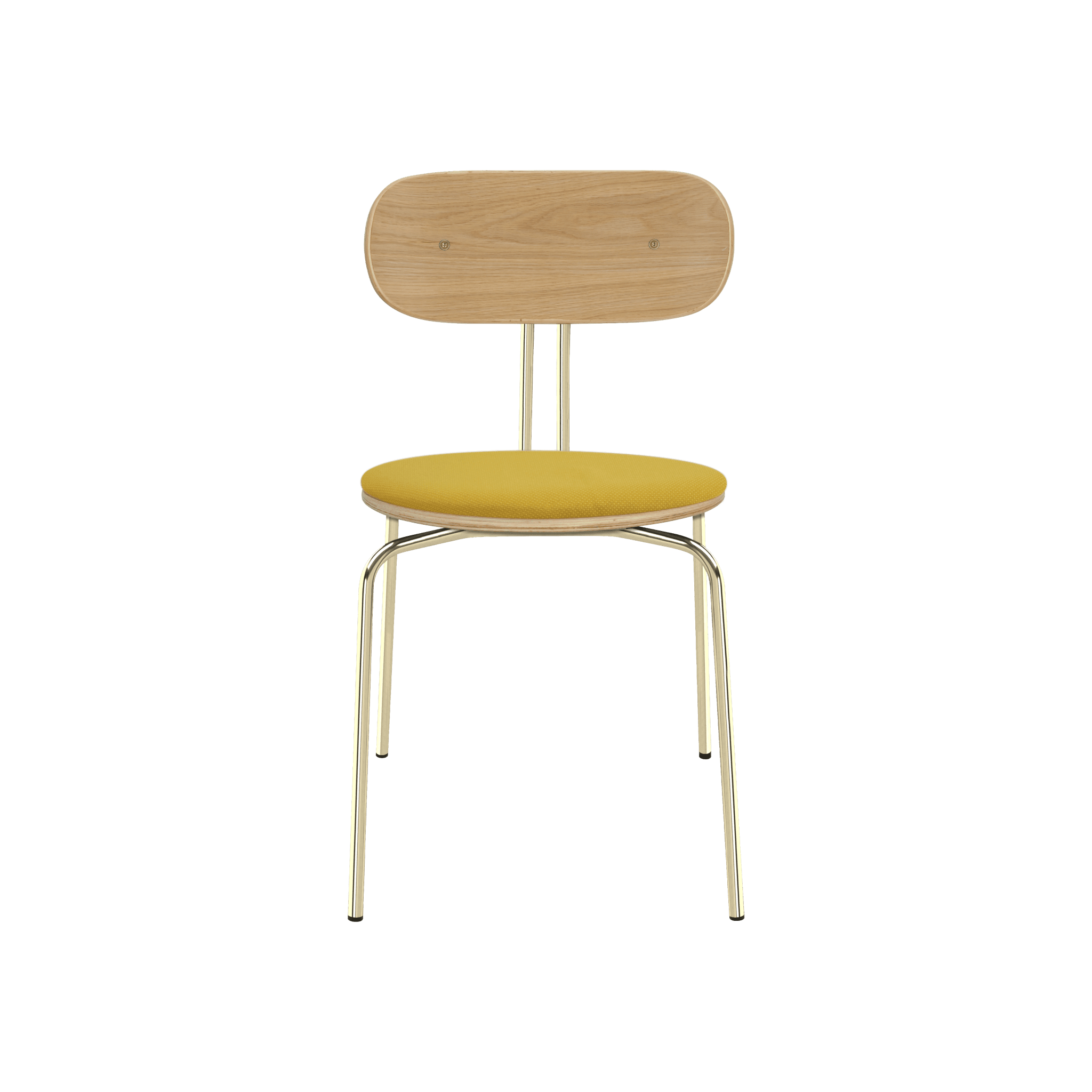 Krzesło Curious to eleganckie, lekkie i minimalistyczne meble, wykonane z forniru dębowego. Jest dostępne z mosiężnymi lub czarnymi nogami, a opcjonalna poduszka siedziska zapewnia dodatkowy komfort. Można wybrać poduszkę spośród 17 kolorów tkaniny Horizons, wykonanej w 100% z recyklingu, a także w brązowym lub białym odcieniu tkaniny Teddy Bear.