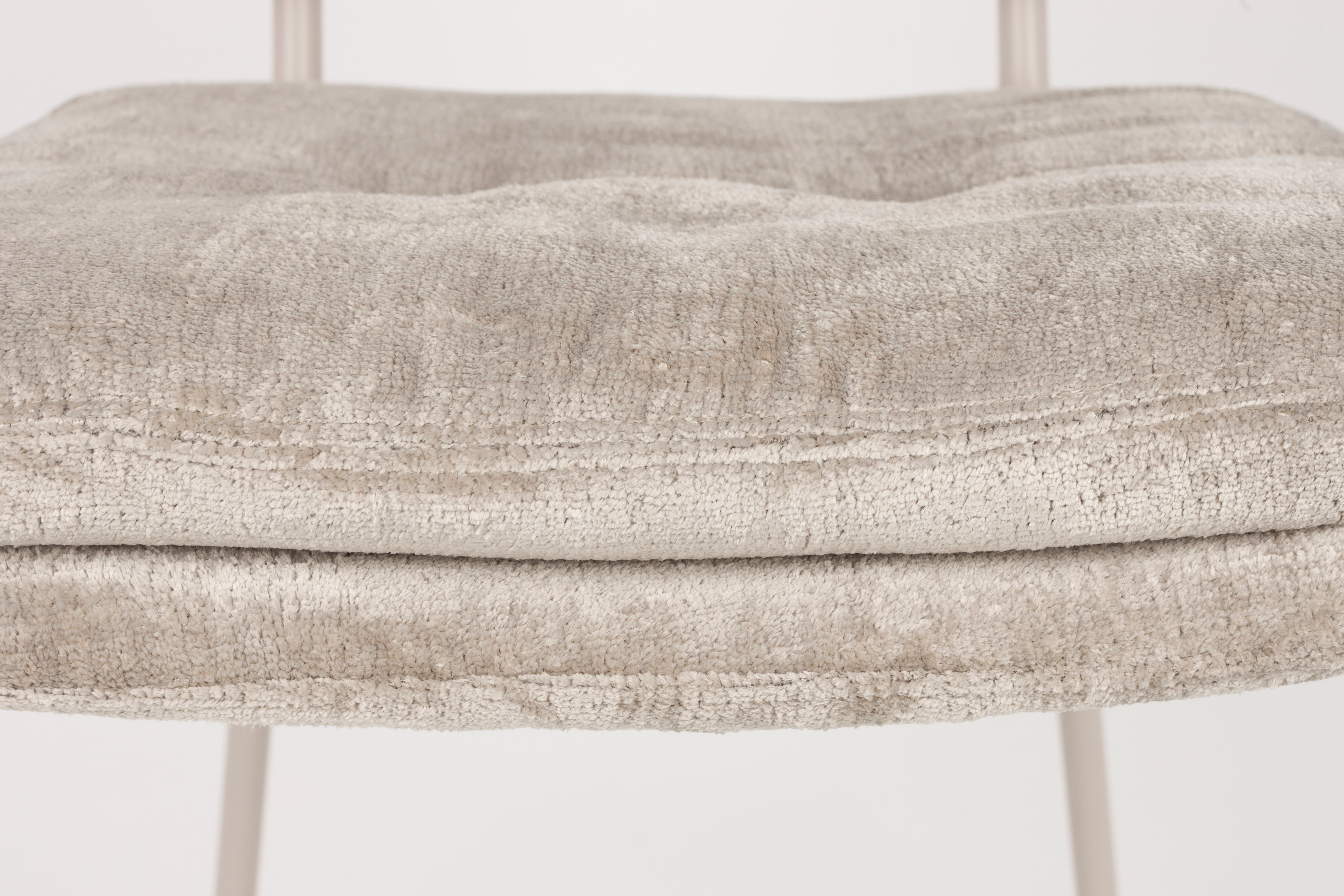 Miękkie, pikowane siedzisko oraz oparcie sprawiają, że to beżowe krzesło wnosi do wnętrza nie tylko elegancję, ale także wyjątkowy komfort. Delikatnie połyskująca tkanina tapicerska z poliestru w połączeniu z jasną stalową podstawą tworzy harmonijną i przytulną całość idealną do salonu, jadalni lub kącika do pracy.
