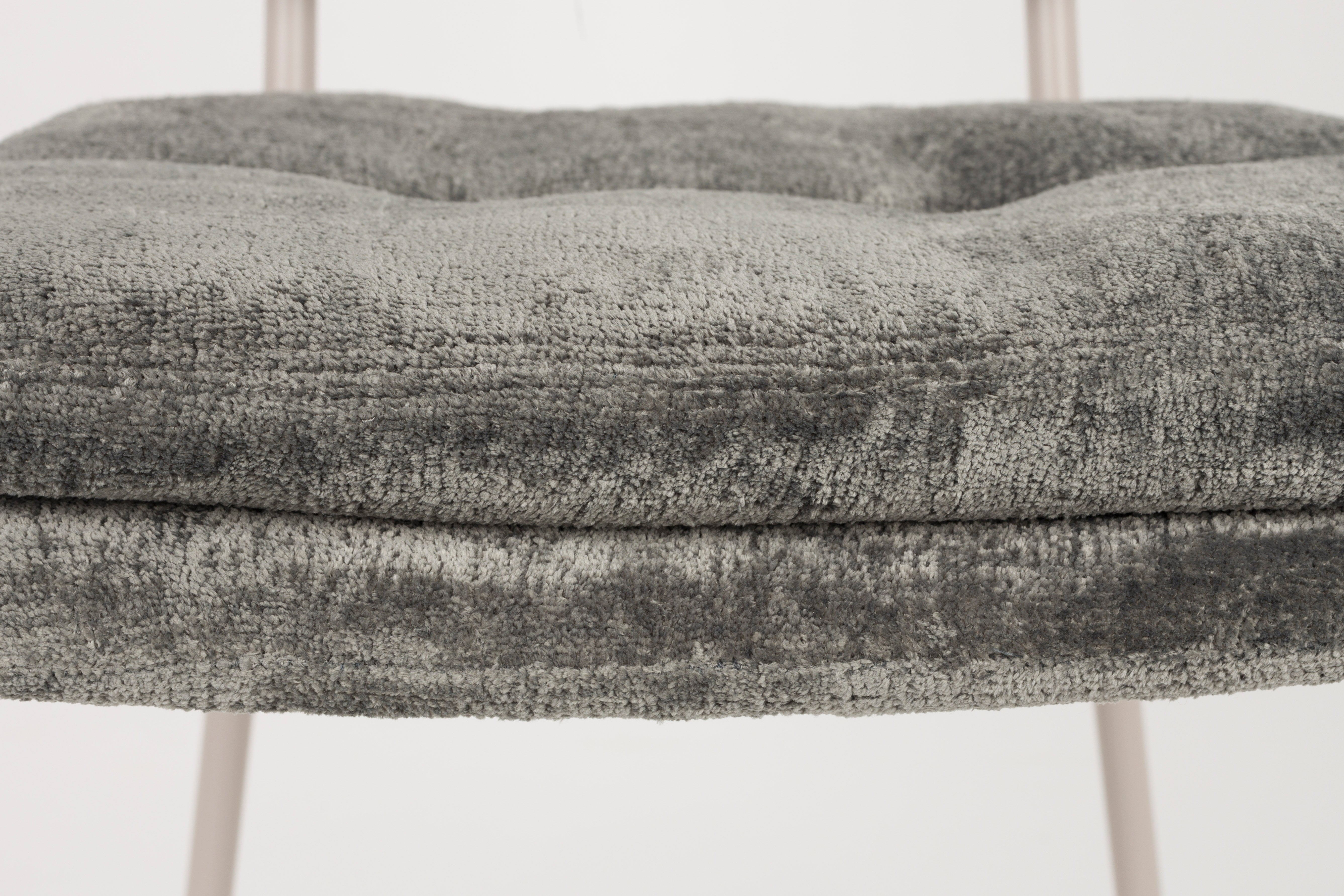 Miękkie, pikowane siedzisko oraz oparcie sprawiają, że to szare krzesło wnosi do wnętrza nie tylko elegancję, ale także wyjątkowy komfort. Delikatnie połyskująca tkanina tapicerska z poliestru w połączeniu z jasną stalową podstawą tworzy harmonijną i przytulną całość idealną do salonu, jadalni lub kącika do pracy.