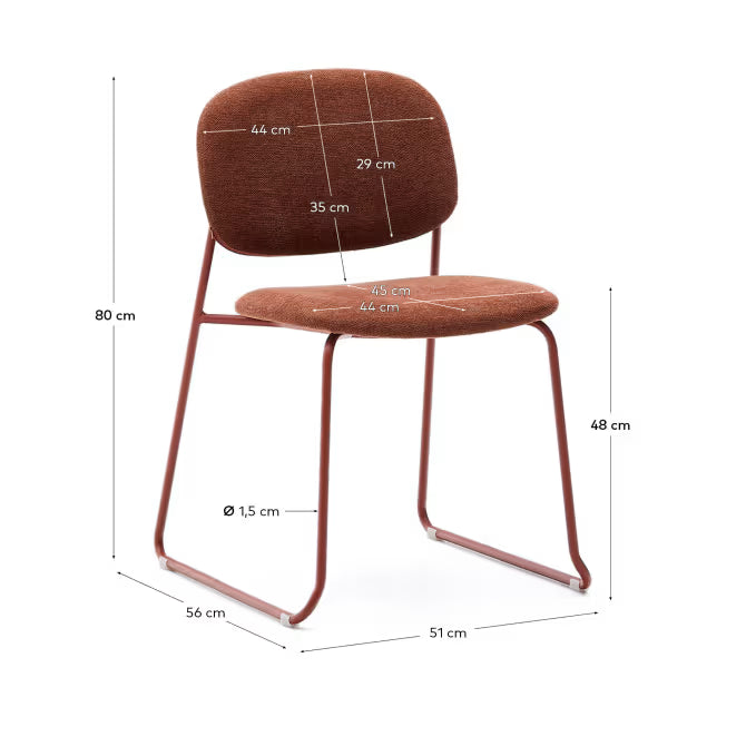 Wewnętrzne wzmocnienie ze sklejki topolowej zwiększa trwałość konstrukcji, a metalowe nogi z mikroteksturowanym wykończeniem w kolorze terakoty nadają całości nowoczesnego, wyrazistego charakteru. Certyfikat OEKO-TEX® STANDARD 100 potwierdza bezpieczną produkcję tkaniny, a drewno z certyfikatem FSC Mix Credit pochodzi z odpowiedzialnie zarządzanych źródeł. To praktyczne krzesło tapicerowane łączy komfort, solidność i designerski detal, a ochraniacze na nogach skutecznie zabezpieczają podłogę przed zarysowaniami.