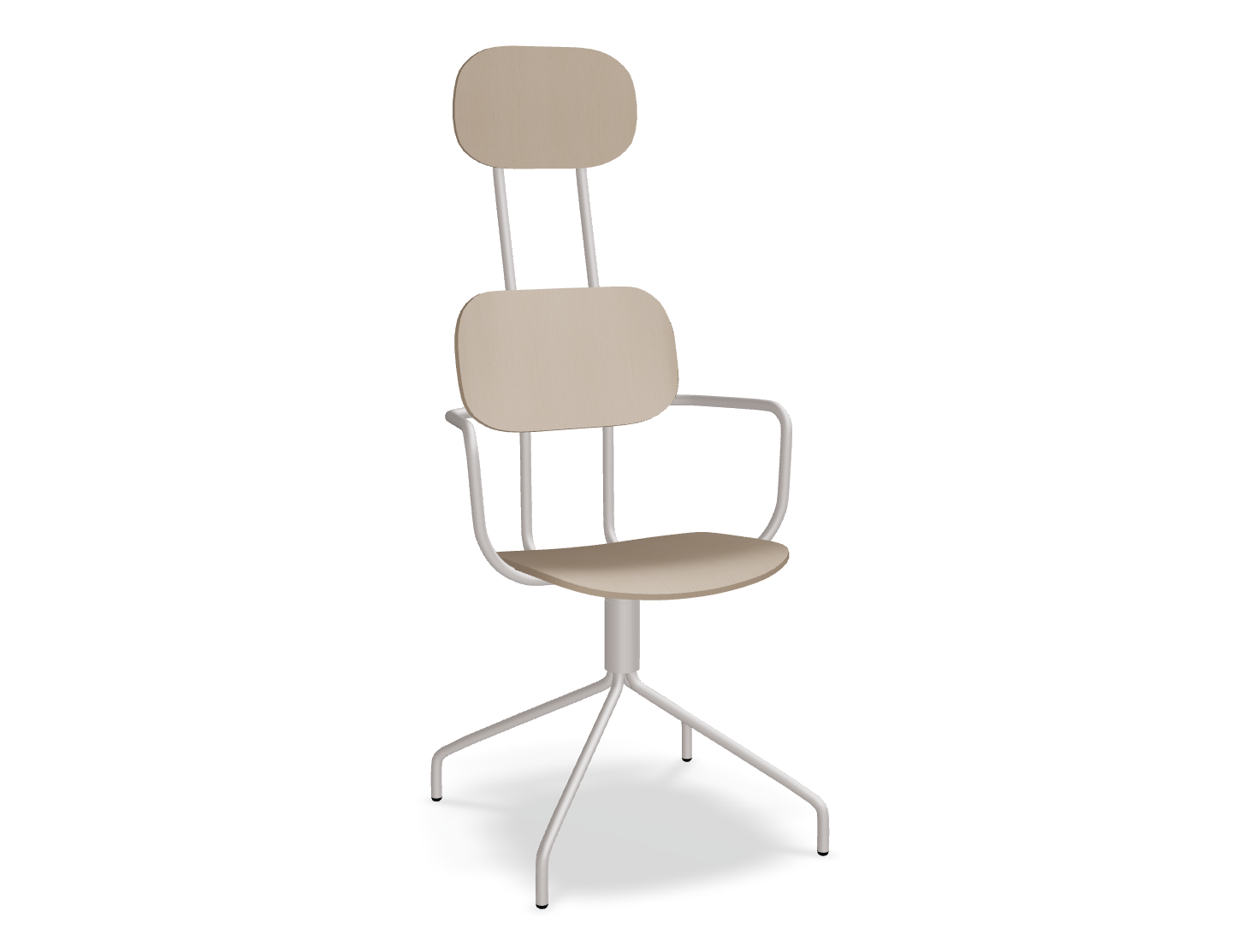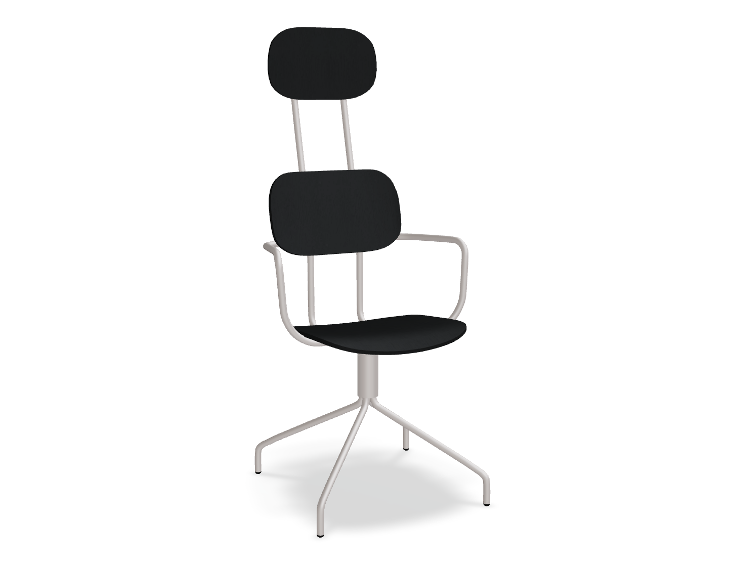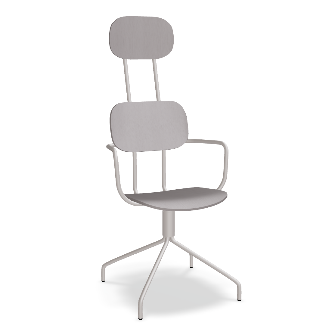 Krzesło obrotowe New School z zagłówkiem, zaprojektowane przez studio Form Us With Love, przyciąga uwagę nowoczesną formą z podwójnym oparciem. Oparcie to nie tylko podkreśla nowoczesny design, ale również zapewnia doskonałe wsparcie dla całych pleców. Podstawa obrotowa gwarantuje swobodę ruchu, a opcjonalne podłokietniki dodatkowo zwiększają komfort użytkowania. Wersja ze sklejki wyróżnia się trwałością i łatwością w pielęgnacji, co czyni ją idealnym wyborem do przestrzeni użytkowanych przez wiele osób.