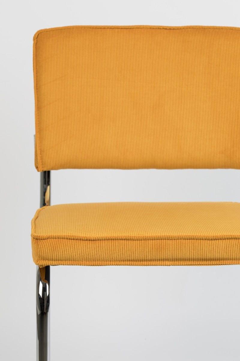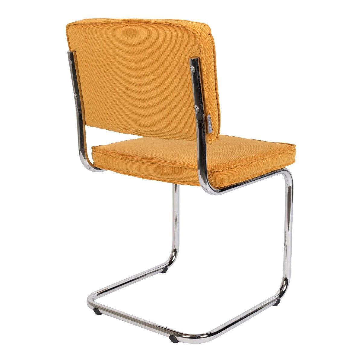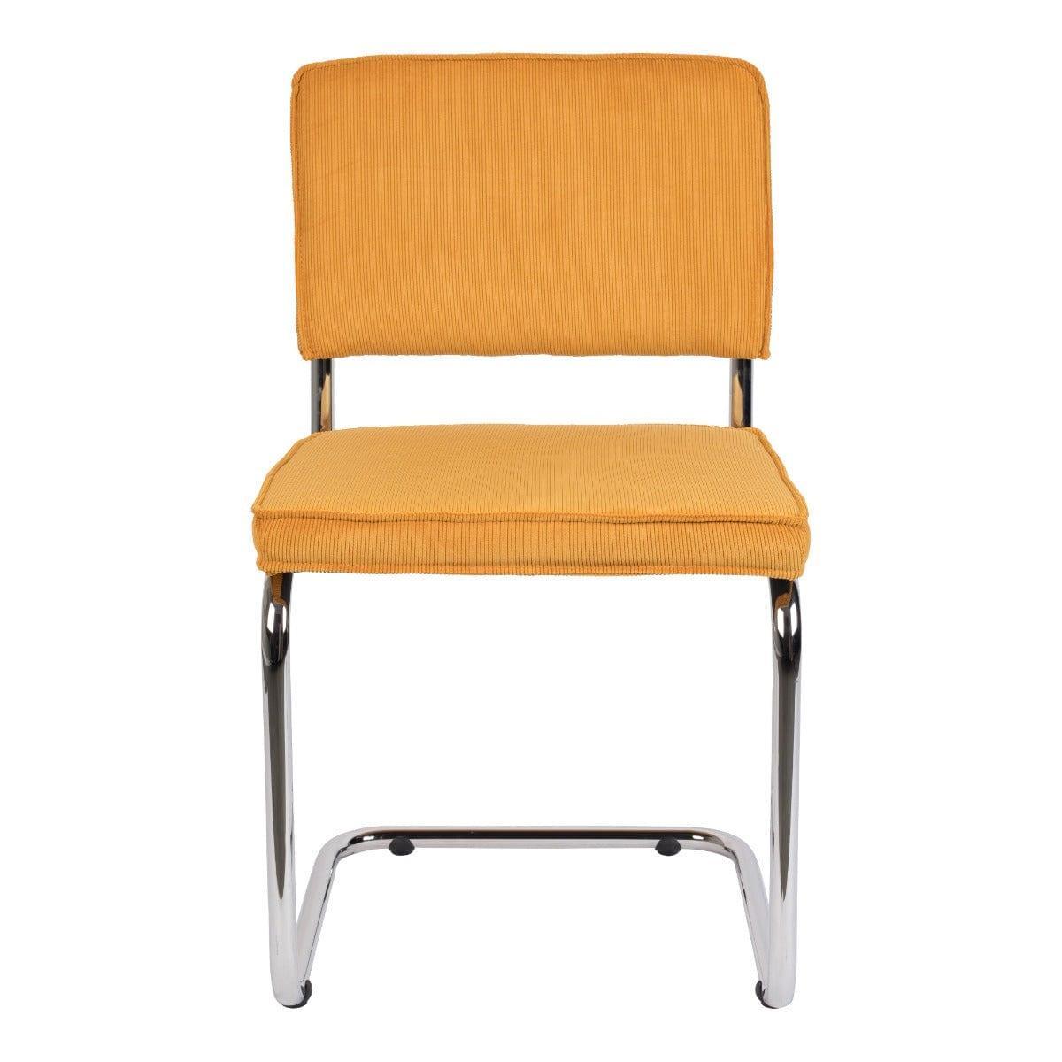 Ridge Rib to ponadczasowe krzesło, które wyróżnia nietypowy stelaż. Sztruksowe, żółte wykończenie i podstawa typu płoza z chromowanego metalu tworzą niesamowite połączenie vintage z nowoczesnym wzornictwem.