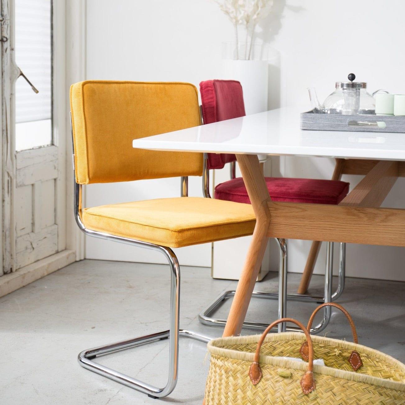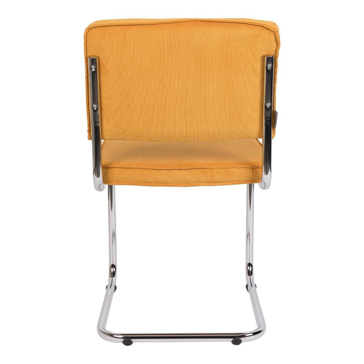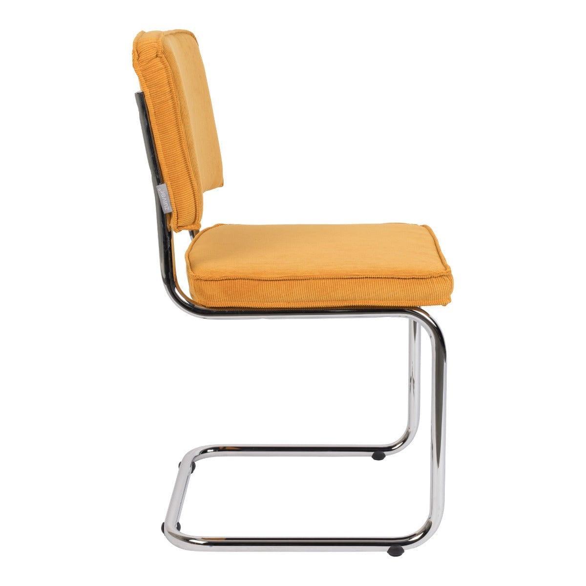 Ridge Rib to ponadczasowe krzesło, które wyróżnia nietypowy stelaż. Sztruksowe, żółte wykończenie i podstawa typu płoza z chromowanego metalu tworzą niesamowite połączenie vintage z nowoczesnym wzornictwem.