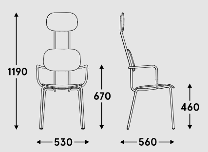 Zagłówek, będący przedłużeniem oparcia, zapewnia podparcie dla całych pleców, zwiększając wygodę użytkownika. Tradycyjna czworonożna forma inspirowana klasycznym krzesłem szkolnym współgra z nowoczesnym, minimalistycznym designem. Wysokiej jakości materiały tapicerskie, z których część pochodzi z recyklingu postkonsumpcyjnego, czynią krzesło nie tylko eleganckim, ale i ekologicznym.