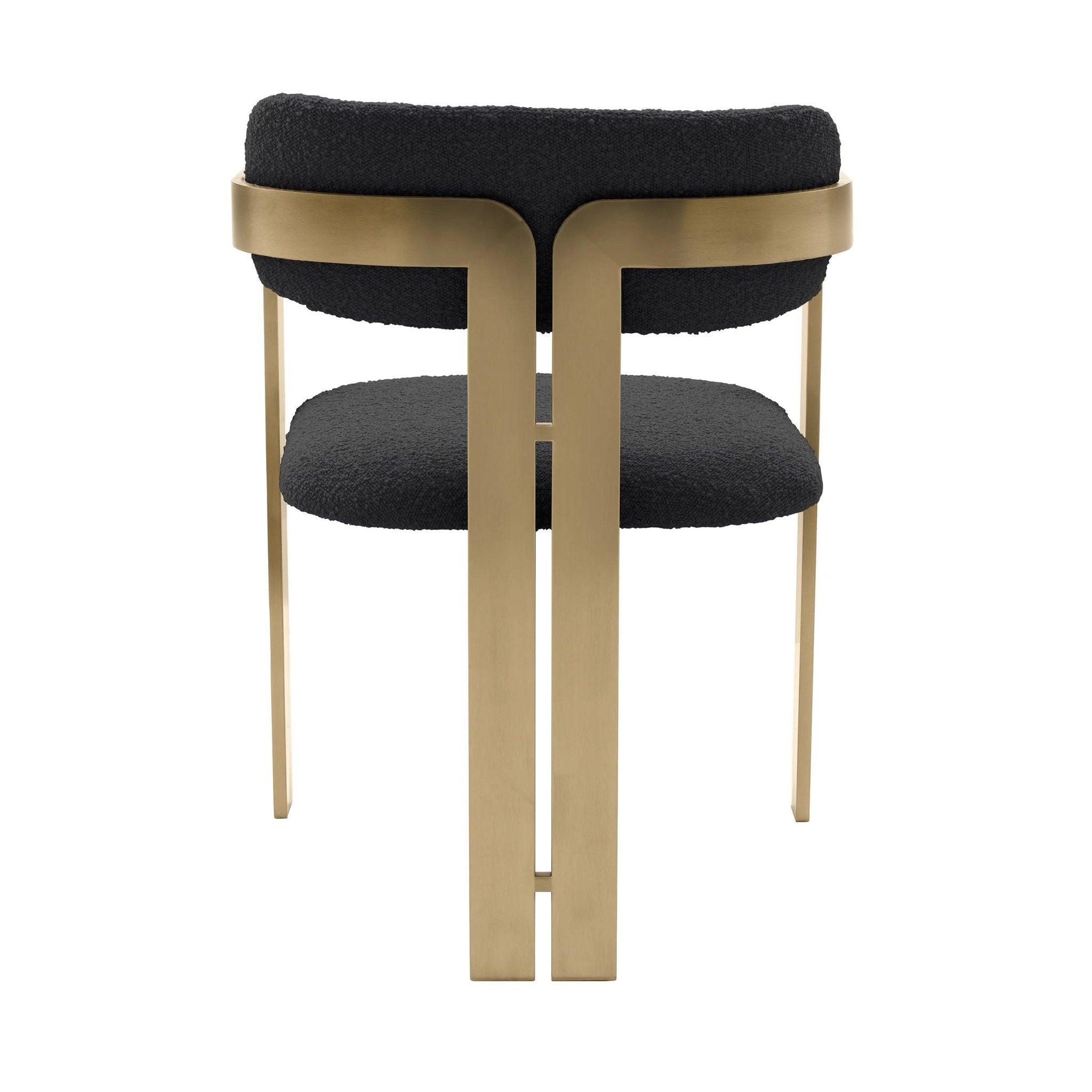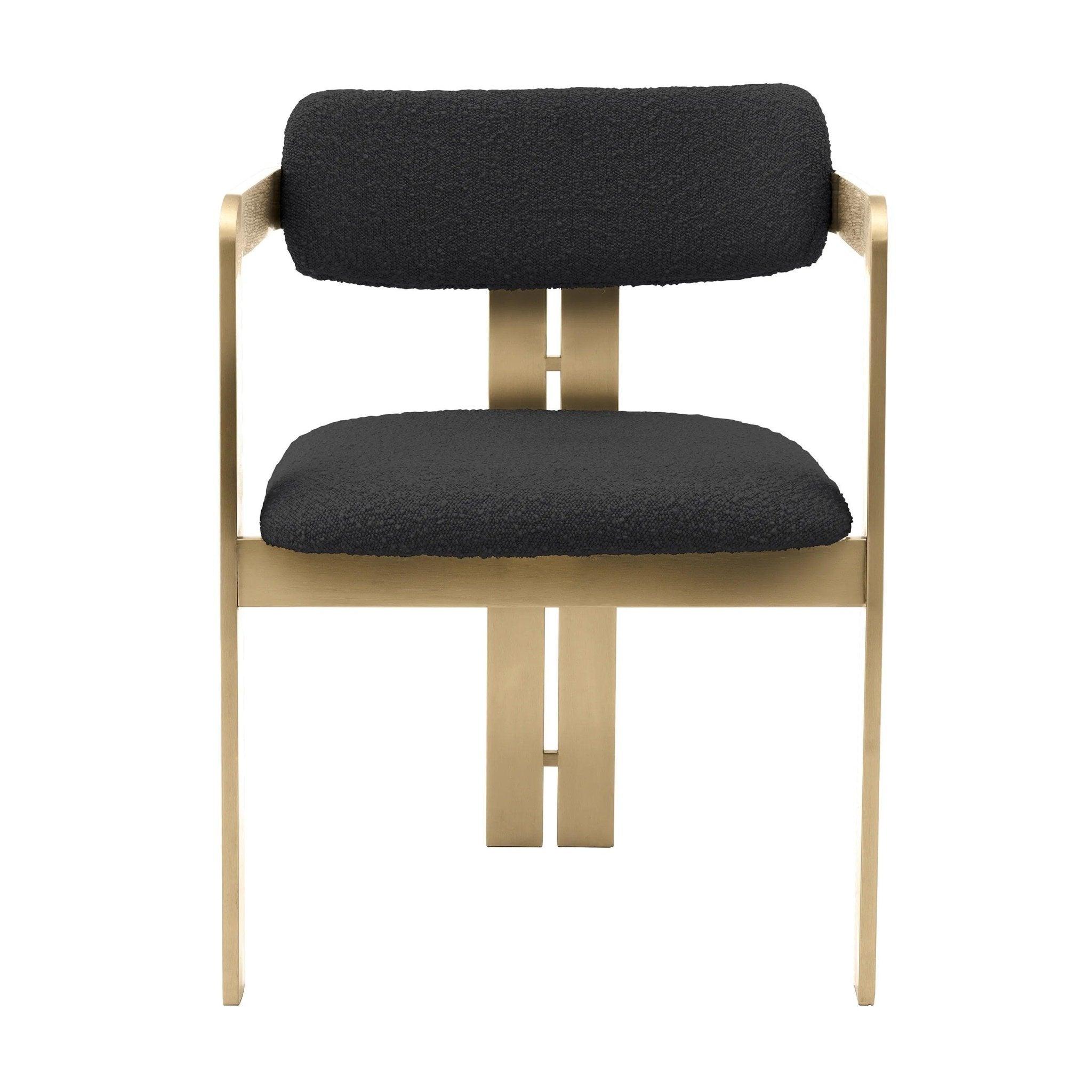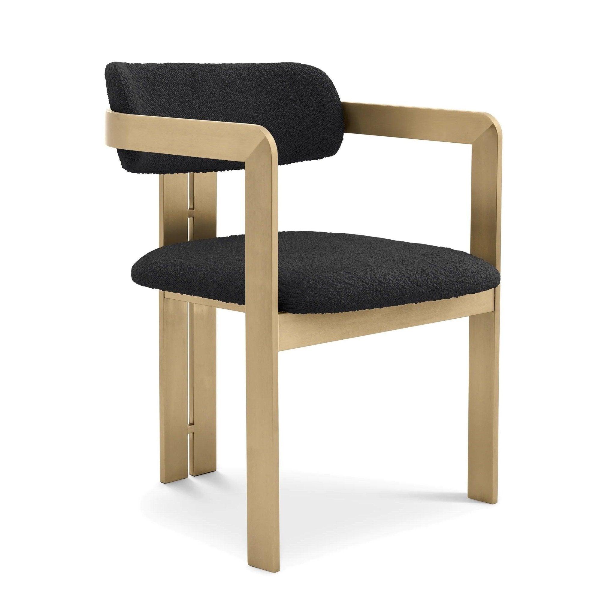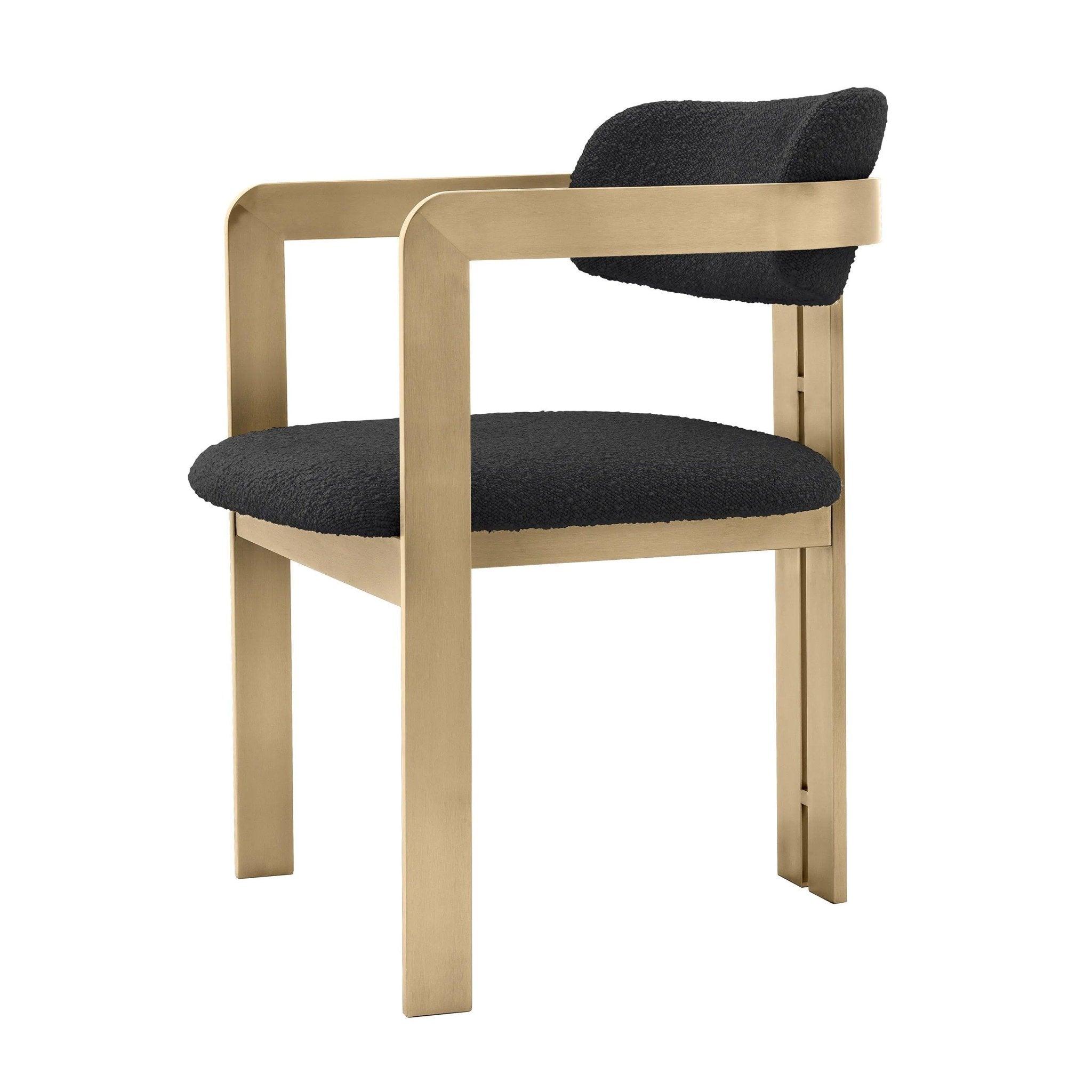 Nieprzeciętne podejście do projektowania widoczne jest w tym, jak podłokietniki biegną płynnie, łącząc się z przednimi nogami. Z kolei tylne nogi z gracją wspierają zaokrąglone oparcie, tworząc harmonijną całość, która jest zarazem praktyczna, jak i estetyczna. Wykończenie ze szczotkowanego mosiądzu dodaje szlachetności, podczas gdy miękka, czarna tapicerka bouclé zachęca do komfortowego wypoczynku i spędzenia długich godzin przy stole w otoczeniu bliskich.