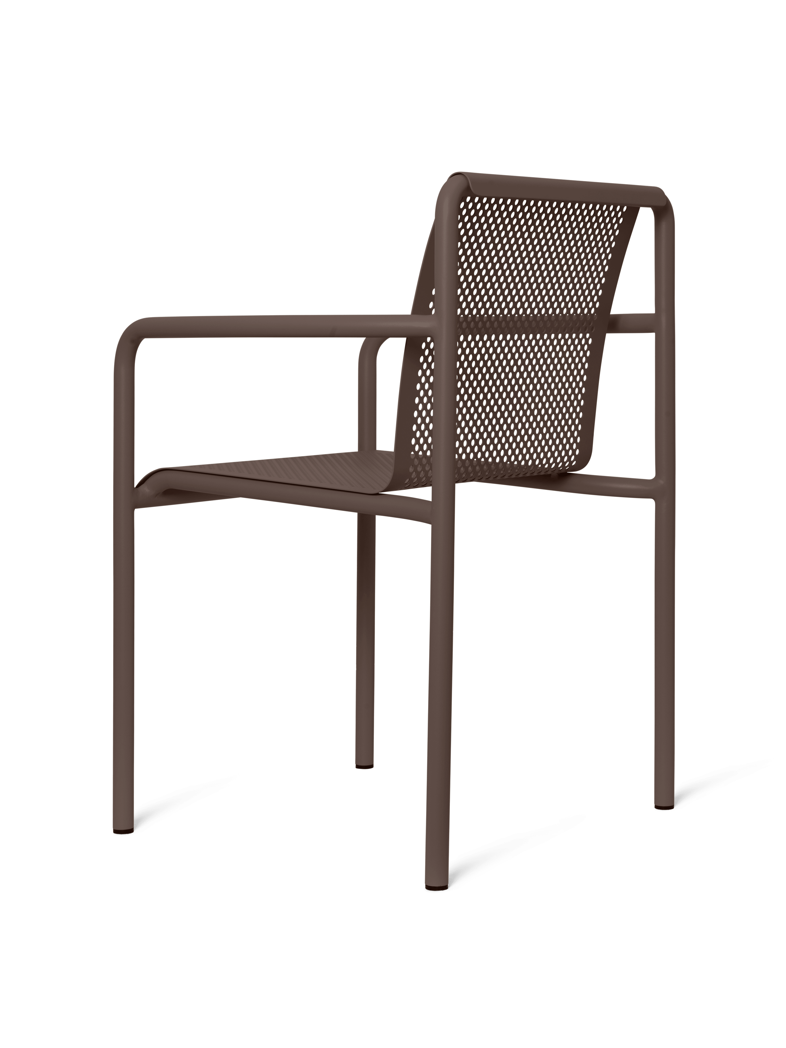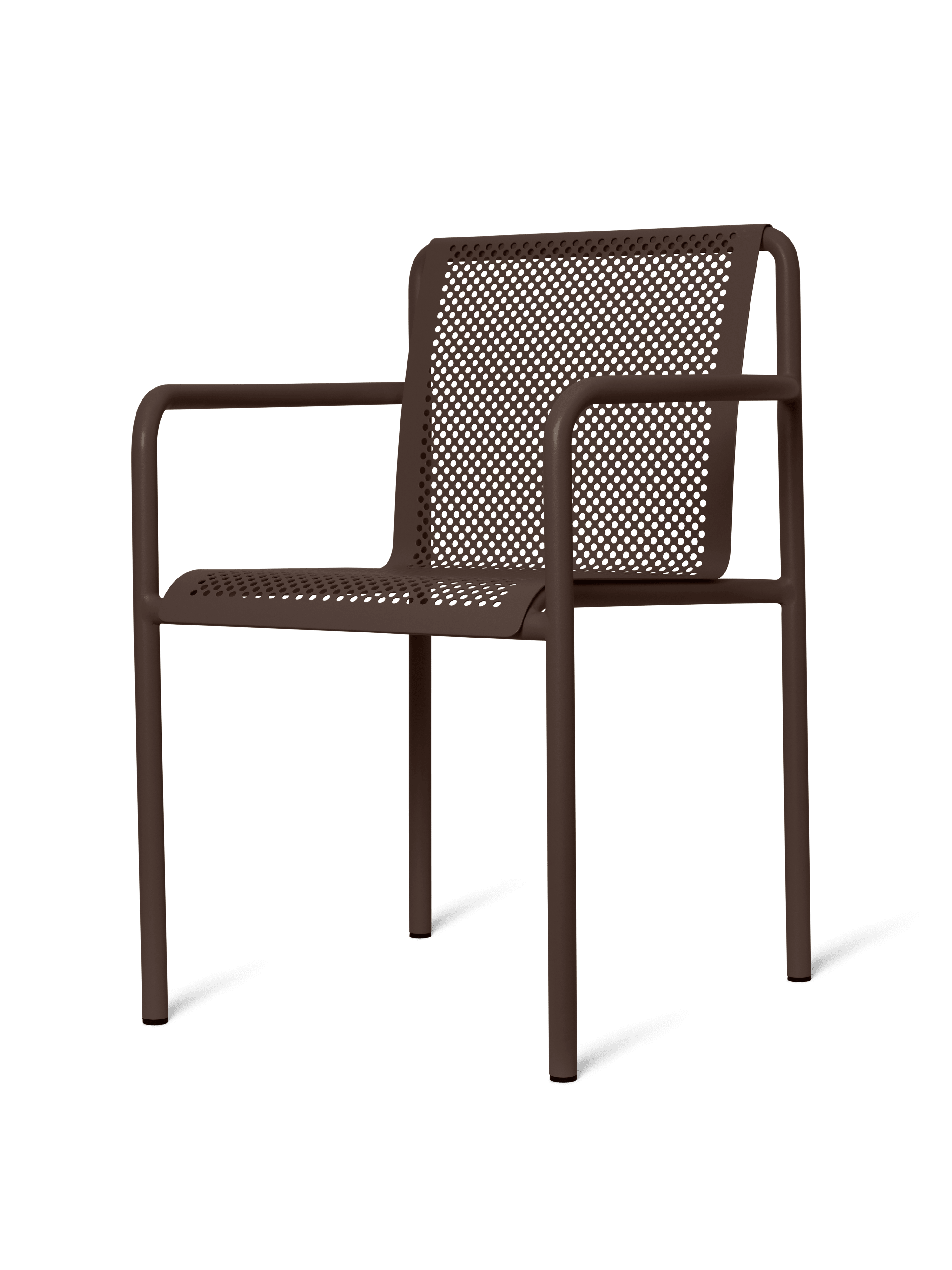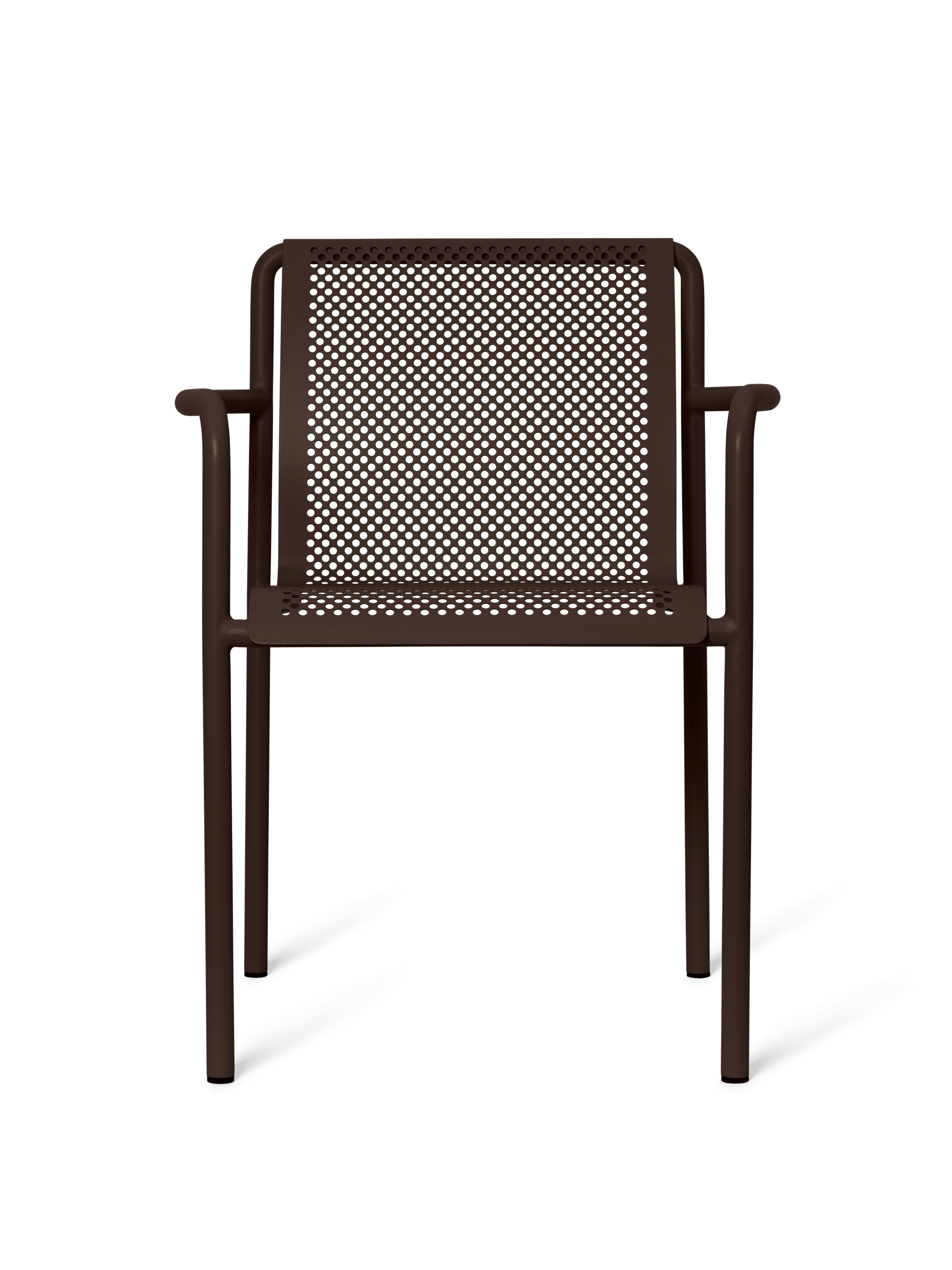 Krzesło z podłokietnikami Dapple to stylowe połączenie funkcjonalności i subtelnego designu inspirowanego grą światła i cienia. Perforowana powierzchnia przypominająca światło prześwitujące przez liście nadaje lekkości i elegancji, jednocześnie zapobiegając gromadzeniu się wody. Dzięki galwanizowanej stali z powłoką proszkową krzesło jest odporne na warunki atmosferyczne – idealne do użytku na tarasie, balkonie czy w ogrodzie.