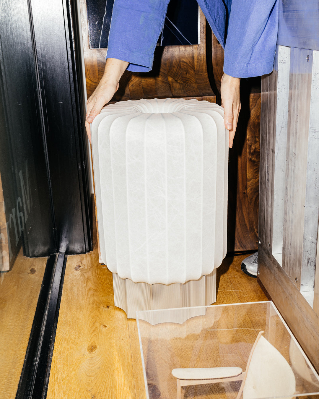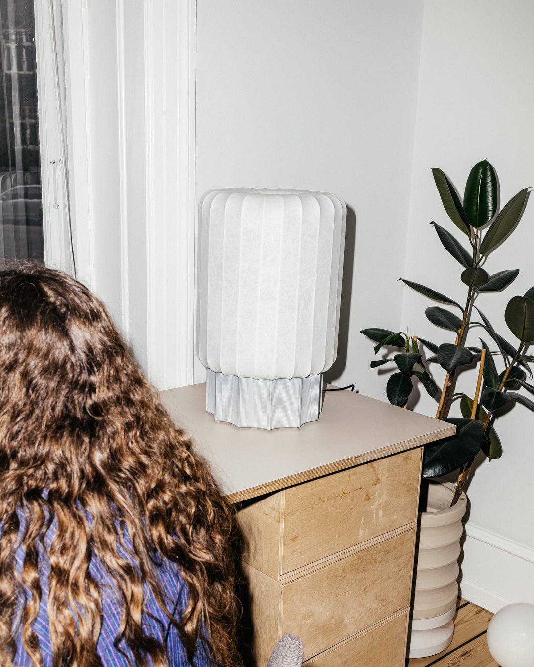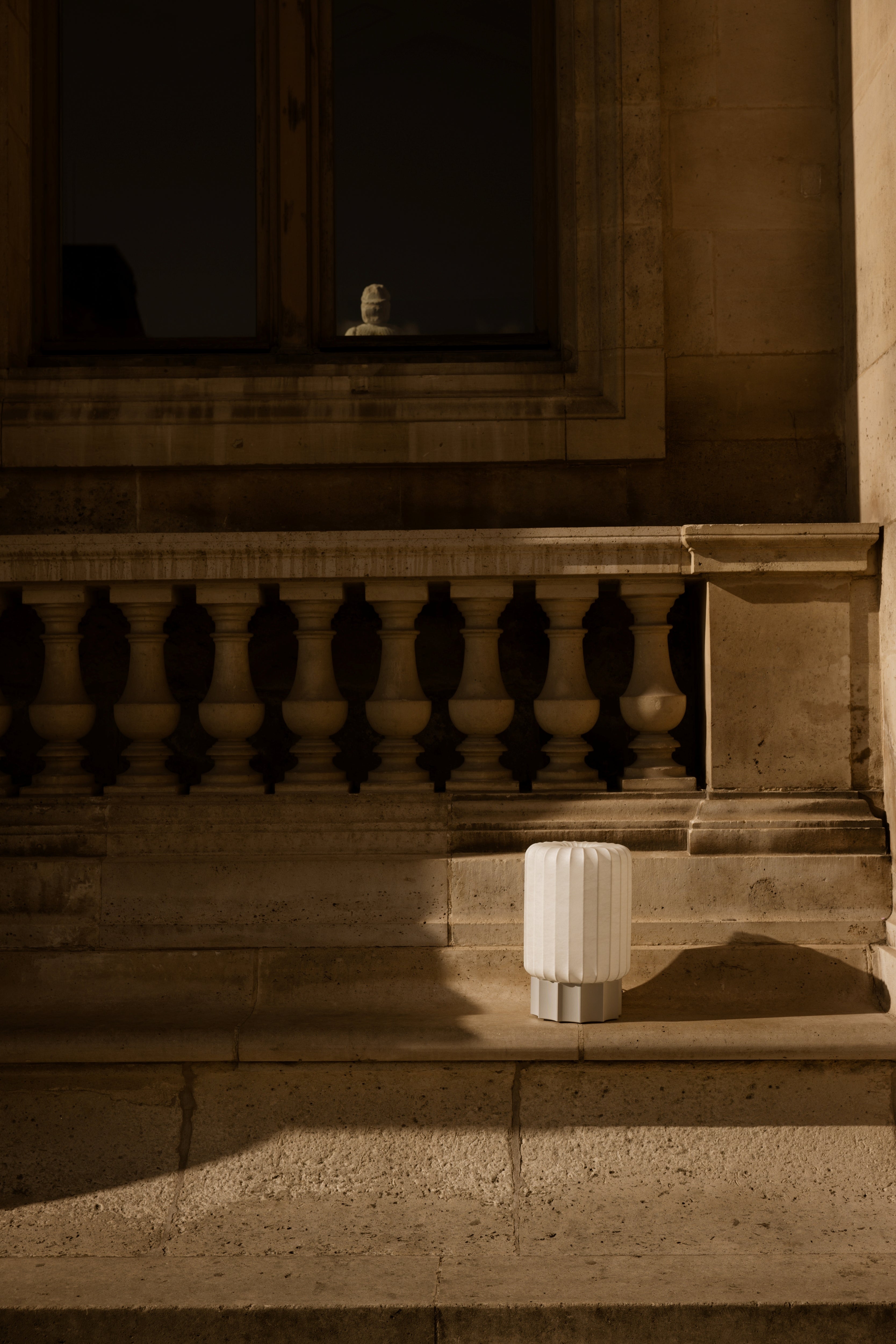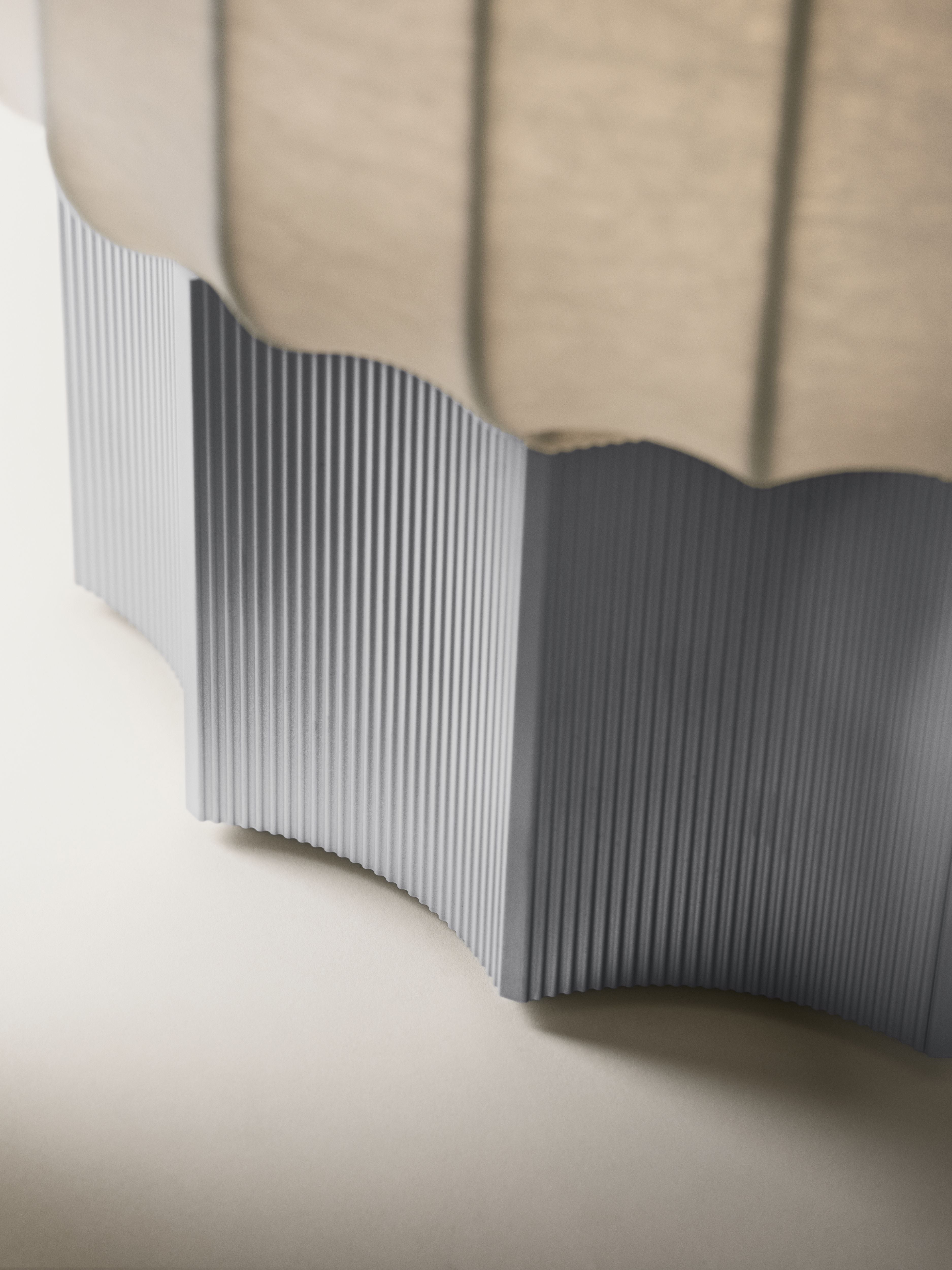 Meter to lampa podłogowa, która przyciąga wzrok swoją architektoniczną formą i subtelnymi detalami. Jej miękka, półprzezroczysta konstrukcja nawiązuje do klasycznych opraw z tkaniny kokonowej, tworząc przytulne i nastrojowe światło. Pofalowany, cylindryczny korpus podstawy kontrastuje z delikatnym kloszem, ukazując przemyślane połączenie surowości i lekkości. Forma lampy opiera się na rytmicznej grze pionowych linii i miękkich zaokrągleń, które nadają całości dynamicznego, rzeźbiarskiego charakteru.