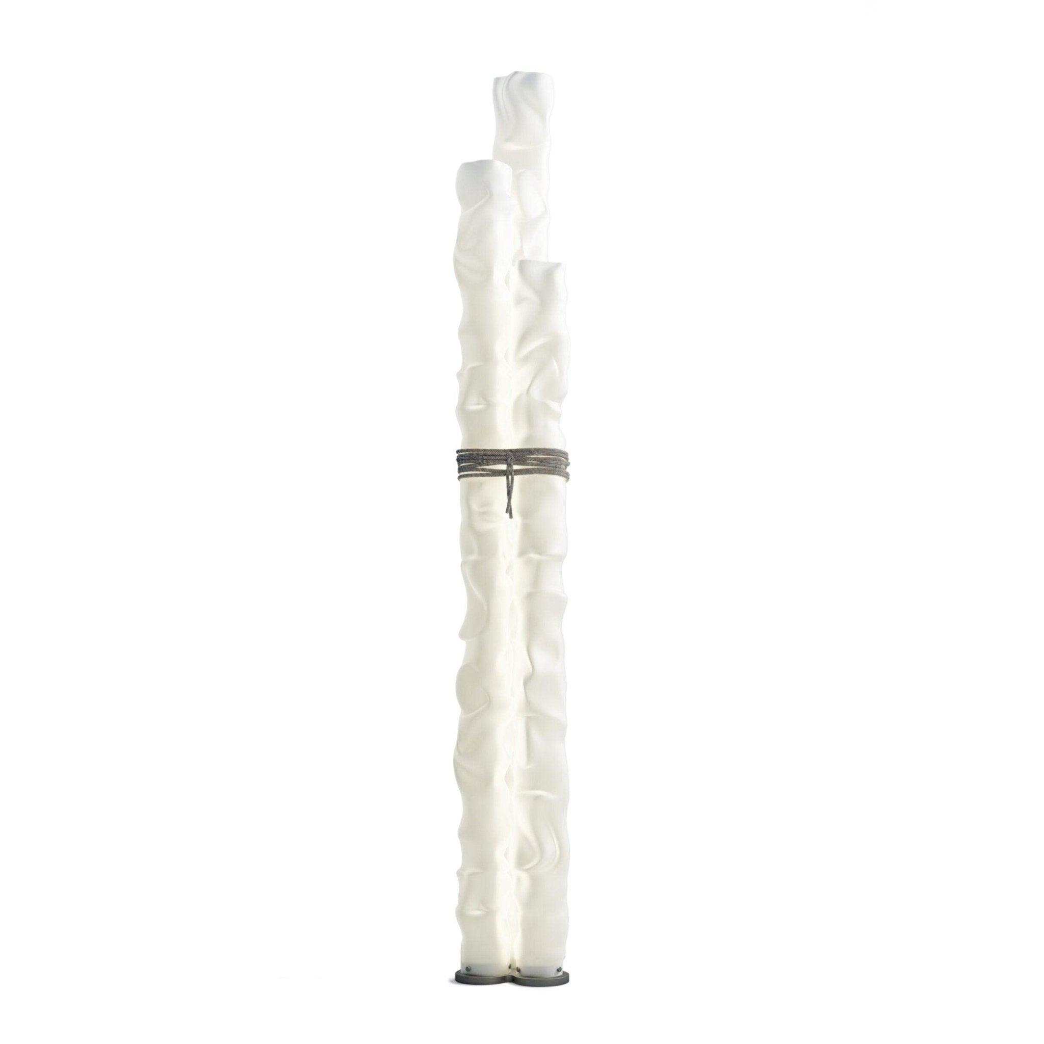 Lampa podłogowa Baggy posiada podwójnie satynowy dyfuzor z poliwęglanu o nieregularnym wyglądzie zmiętej papierowej tuby, a podstawa jest w szarym wykończeniu. To, co czyni Baggy wyjątkowym, to organiczny kształt, zawierający niestandardową diodę LED, która emituje światło w magiczny i nieoczekiwany sposób.