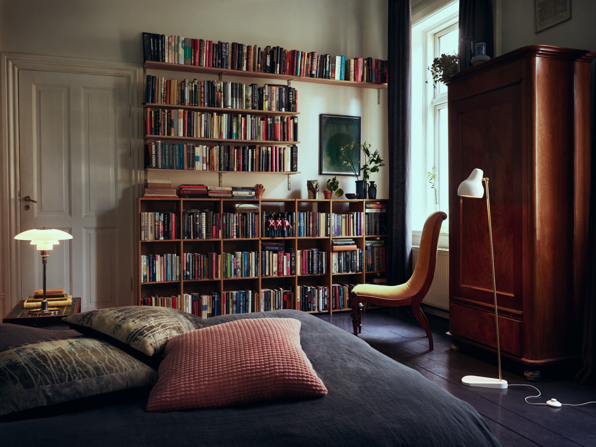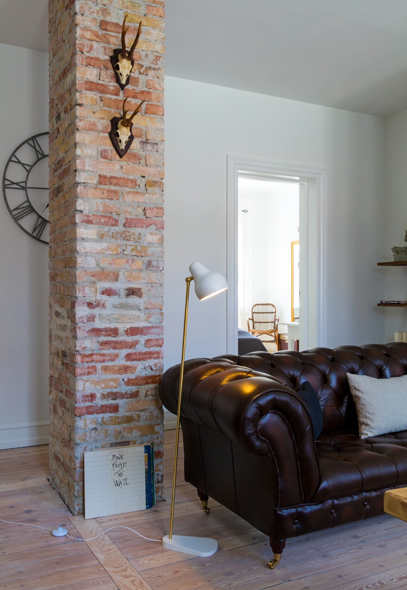 Lampa podłogowa VL 38 zapewnia ciepłe, skierowane w dół światło, idealne do wieczornego czytania lub stworzenia nastrojowej atmosfery w salonie. Wewnętrzna, biała powłoka klosza rozprasza światło w sposób subtelny i naturalny, a regulowany kąt nachylenia umożliwia dopasowanie oświetlenia do potrzeb. Z biegiem czasu mosiężne elementy pokrywają się delikatną patyną, dzięki czemu każda lampa podłogowa nabiera niepowtarzalnego charakteru.