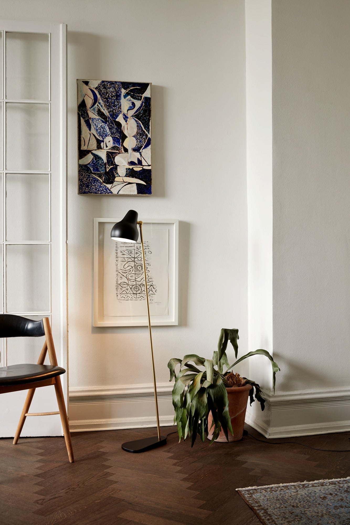 Lampa podłogowa VL 38 zapewnia ciepłe, skierowane w dół światło, idealne do wieczornego czytania lub stworzenia nastrojowej atmosfery w salonie. Wewnętrzna, biała powłoka klosza rozprasza światło w sposób subtelny i naturalny, a regulowany kąt nachylenia umożliwia dopasowanie oświetlenia do potrzeb. Z biegiem czasu mosiężne elementy pokrywają się delikatną patyną, dzięki czemu każda lampa podłogowa nabiera niepowtarzalnego charakteru.