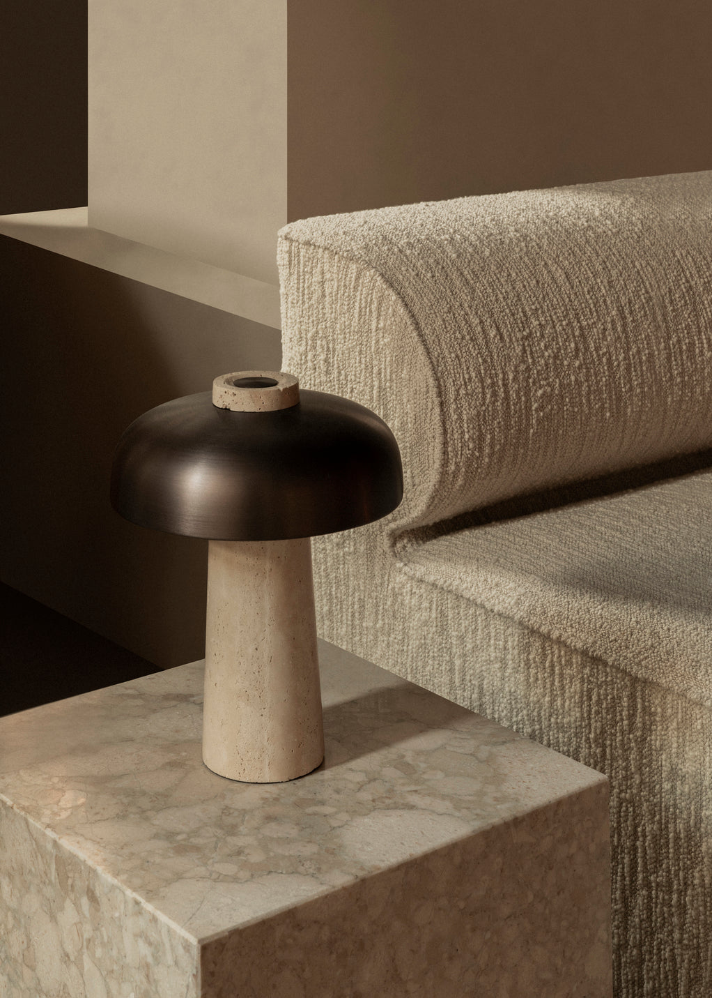 Lampa stołowa Reverse to ponadczasowa forma o wyjątkowej obecności we wnętrzu, inspirowana włoskim designem lat 70. Jej charakterystyczna konstrukcja opiera się na surowej podstawie z trawertynu oraz wygiętym, aluminiowym kloszu w kolorze brązu. Geometryczna gra kontrastów między stożkową bryłą a opływowym kloszem nadaje lampie elegancki, architektoniczny wyraz.