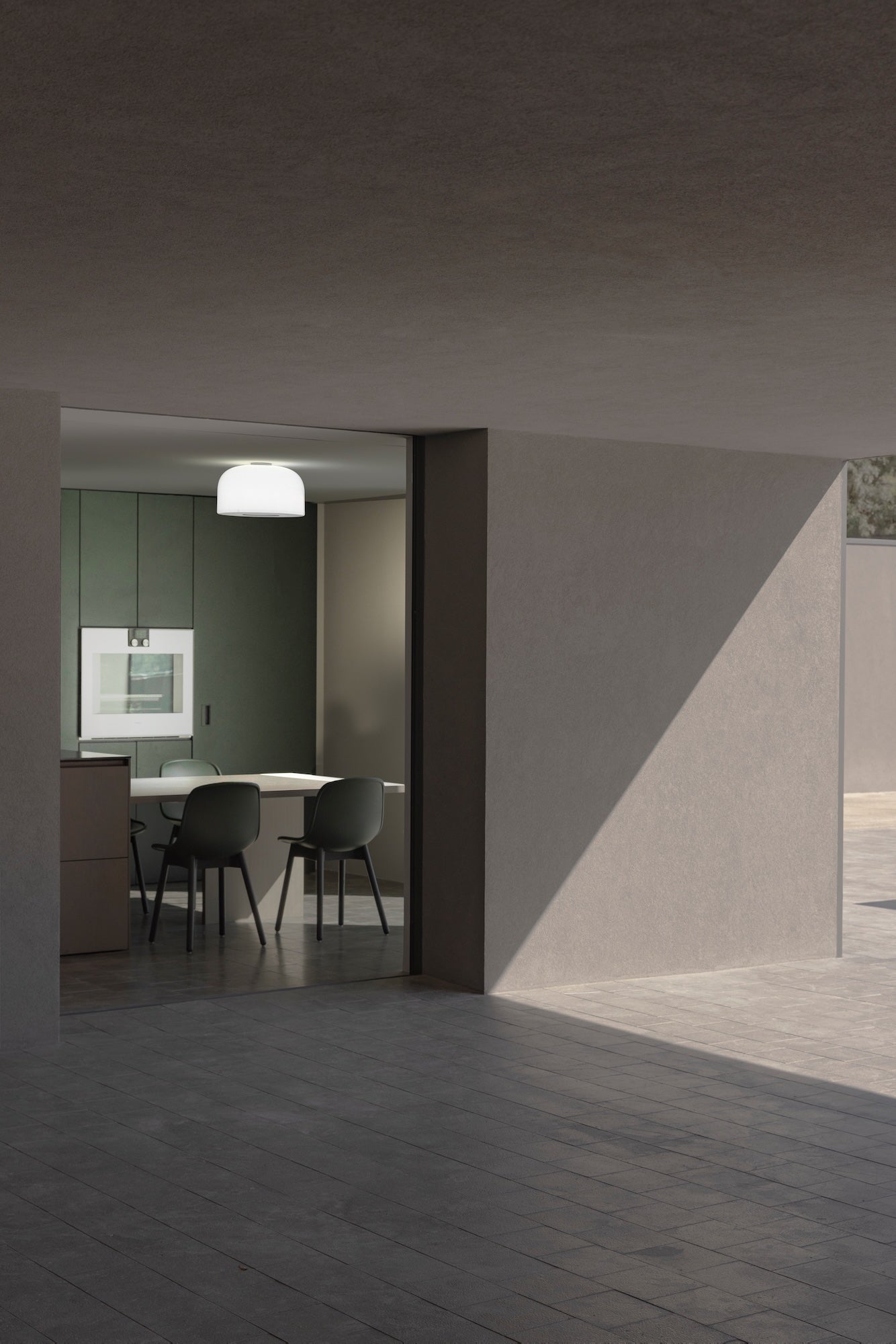 Dolny otwór lampy, otoczony kolorowym aluminiowym pierścieniem, został zaprojektowany tak, by precyzyjnie ukierunkować światło na powierzchnię pod lampą, jednocześnie chroniąc wzrok przed olśnieniem. Tworzy to klarowny stożek świetlny, który naturalnie wyznacza przestrzeń funkcjonalną – nad stołem, wyspą kuchenną czy recepcją. Lampa sufitowa Bellhop Glass harmonijnie łączy estetykę z technologią, oferując światło tam, gdzie jest najbardziej potrzebne.