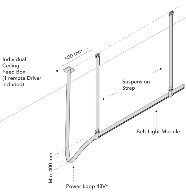 Montaż lampy odbywa się za pomocą pasków przeciąganych przez metalowe klamry, pełniące funkcję zaczepów sufitowych. Regulacja długości pasków pozwala dopasować kompozycję do różnych układów przestrzennych. Zasilanie oraz system sterowania ukryto wewnątrz pasków, co zapewnia czystość formy i maksymalną estetykę. Każde źródło światła można kontrolować niezależnie dzięki wbudowanemu systemowi CASAMBI, obsługiwanemu z poziomu dedykowanej aplikacji. Belt to oświetlenie, które zachwyca zarówno formą, jak i funkcjonalnością.