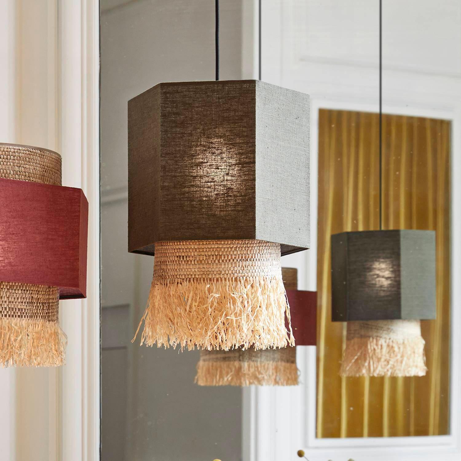 Lampa wisząca Marrakech w oliwkowym odcieniu to ośmiokątny wiszący element, który składa się z trzech abażurów wykonanych z delikatnego, spranego lnu oraz cylindrów z bananowca i rafii, ozdobionych frędzlami. Prezentuje się niezwykle efektownie i charakteryzuje się unikalnym wzornictwem, nawiązującym do klimatu tradycyjnych rzemieślniczych prac znanych z marokańskich rynków.