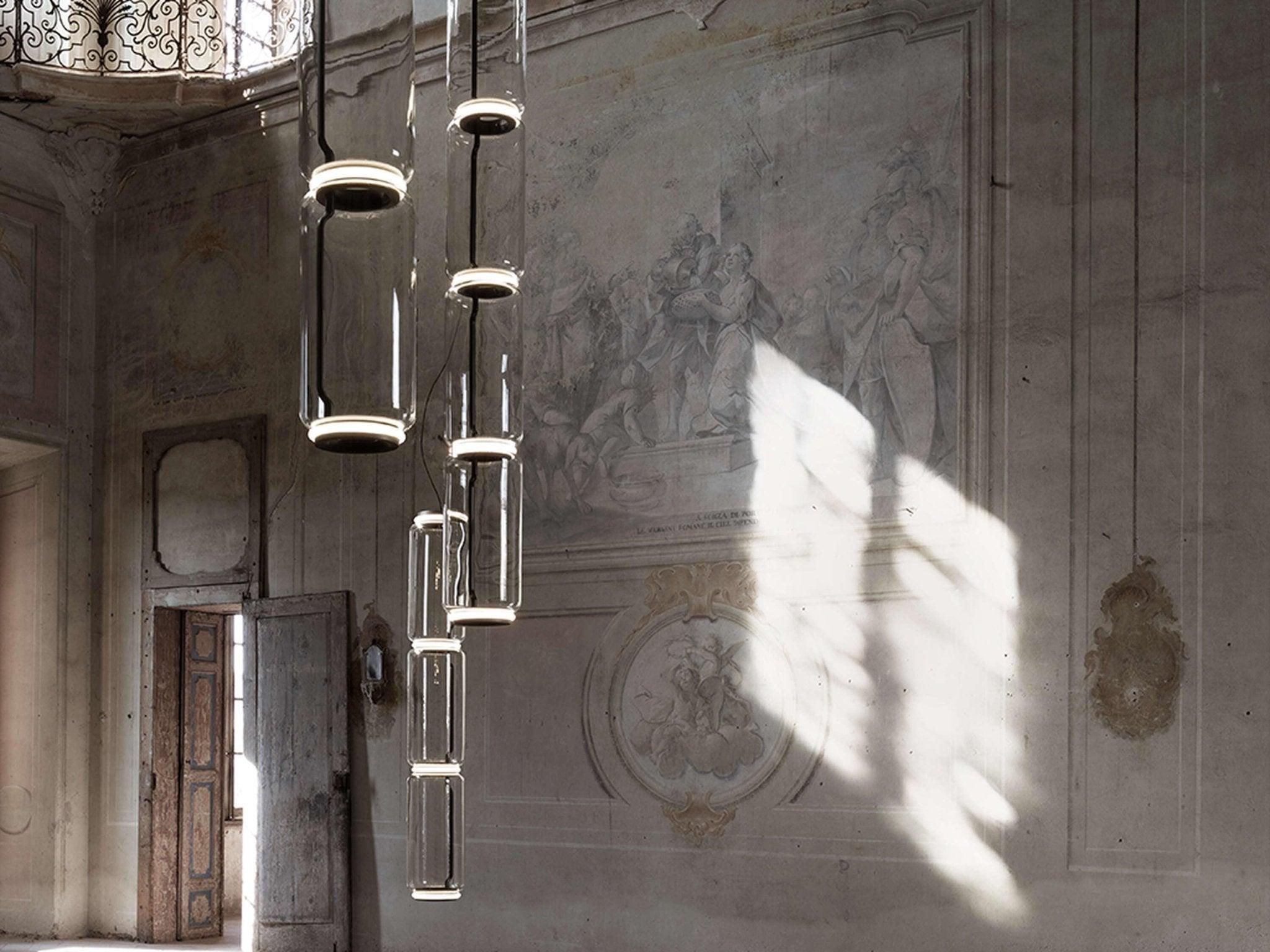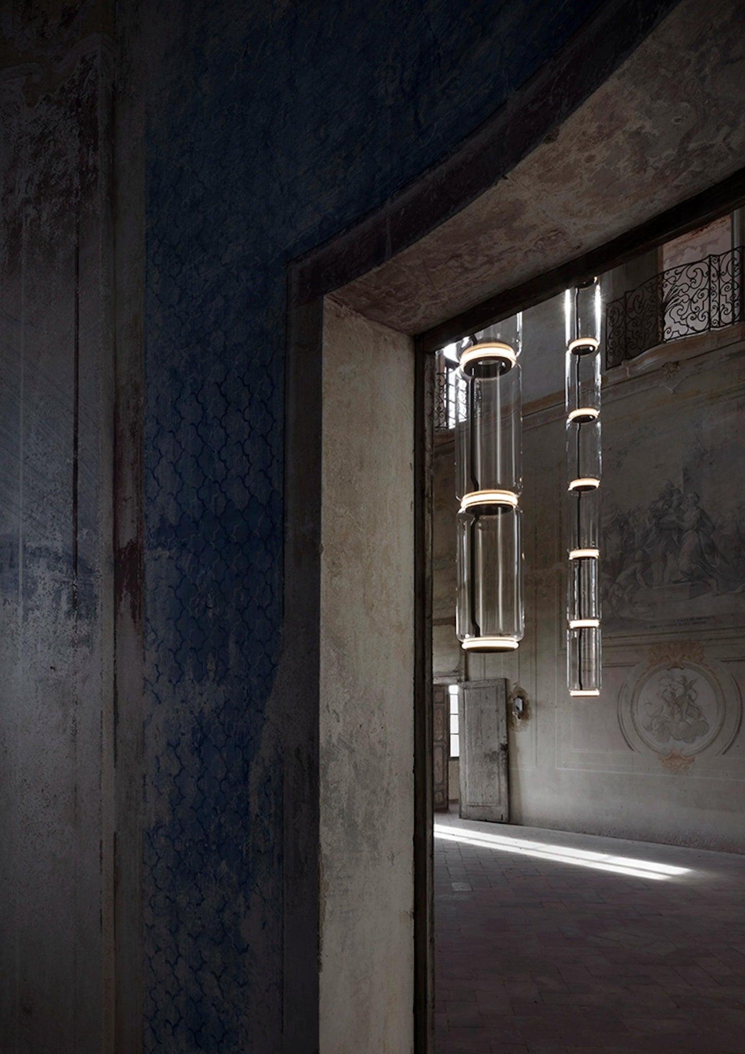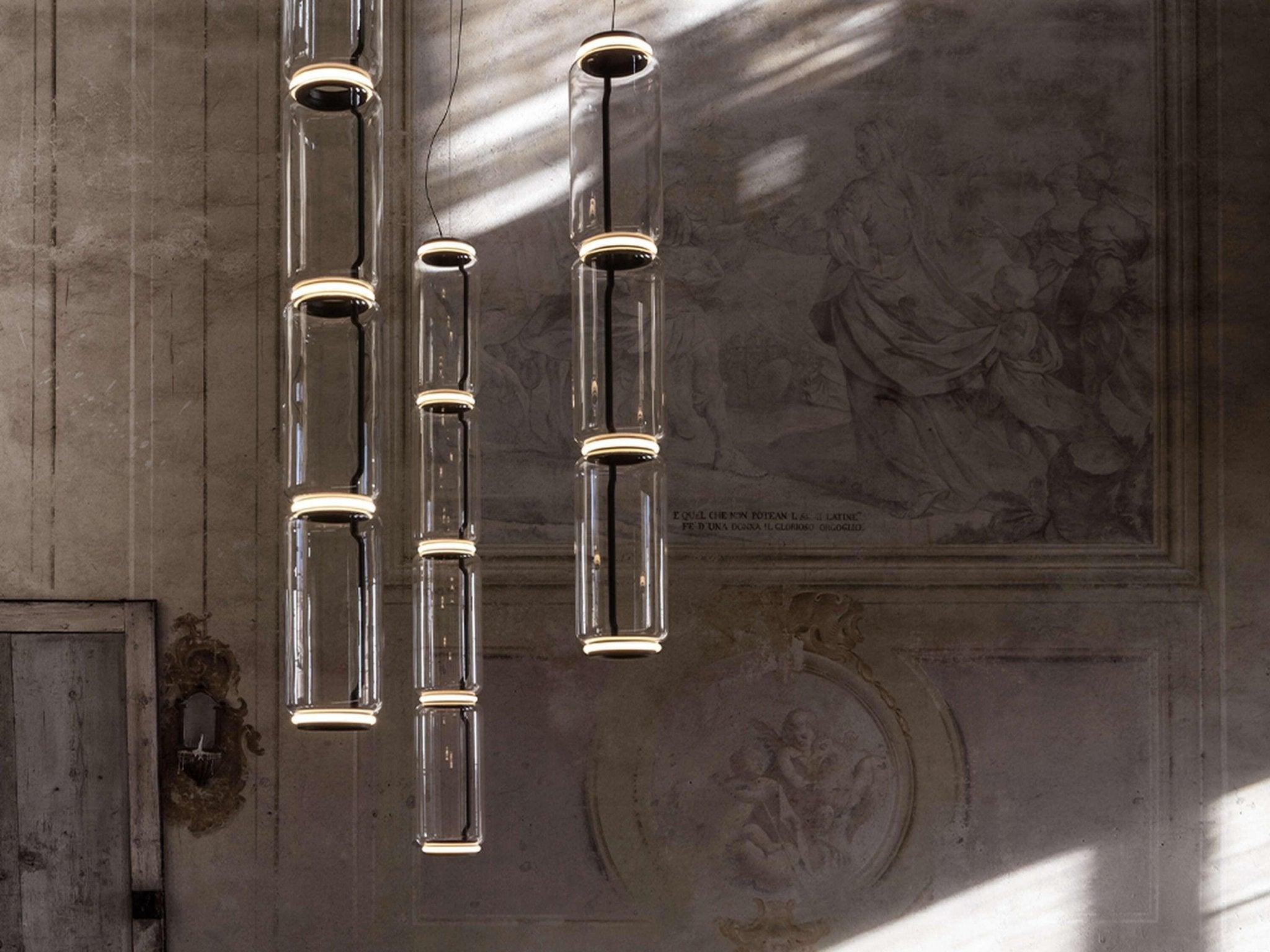 Lampa wisząca Noctambule to harmonijne połączenie urzekającego uroku i estetycznego piękna w doskonale przemyślanym designie. Ta wyjątkowa lampa wisząca, uosabiająca elegancję, charakteryzuje się cylindrami z dmuchanego szkła, co nadaje jej subtelny i stylowy charakter. Dodatkowo lampa jest wyposażona w pierścienie, które są źródłem światła i nadają nowoczesności całej konstrukcji. To rozwiązanie, które nie tylko doskonale oświetla wnętrze, ale także stanowi designerski element, nadający charakter każdemu pomieszczeniu.