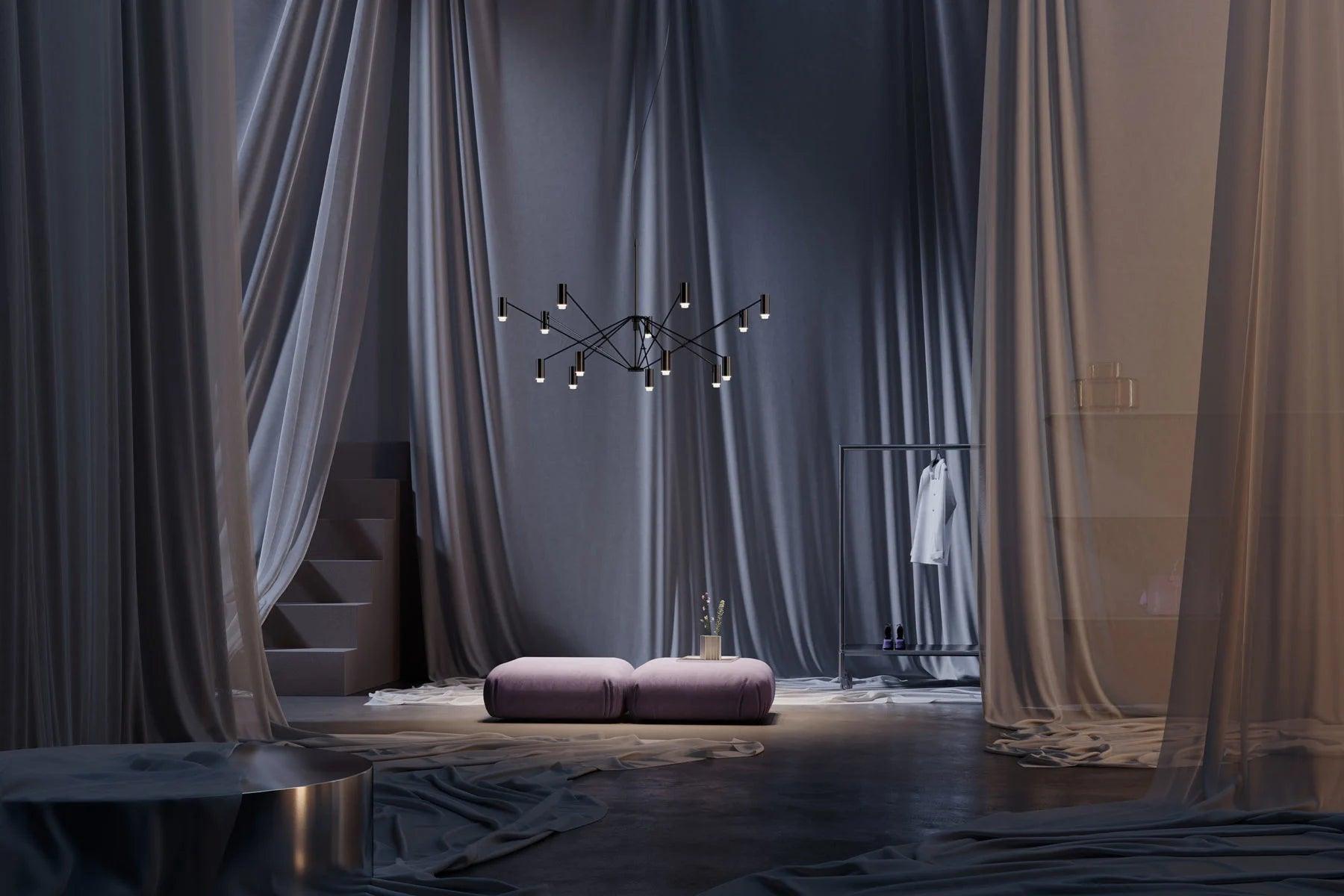 Duża czarna pionowa struktura jest głównym trzonem, z którego wyłania się szereg prętów; niektóre można przesuwać w górę, aby rozszerzyć światło, a inne w dół, aby je skupić. Wszystkie pręty mają zawieszony reflektor, który emituje światło w dół lub w postaci dużej, ostrej wiązki. Cylindryczne reflektory - z wewnętrznym pierścieniem w kolorze kości słoniowej, terakoty lub złota - równomiernie rozprowadzają światło.