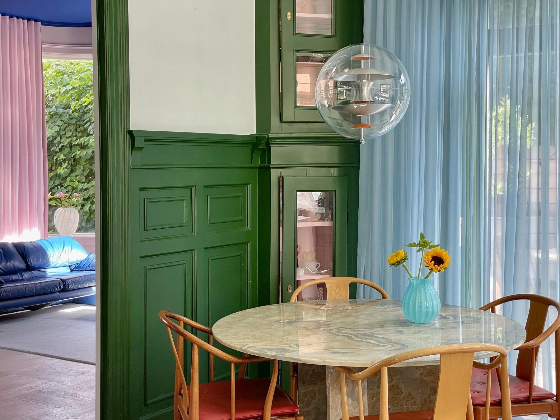 Wyjątkową cechą lampy w kolorze szczotkowanego aluminium VP Globe wykonanej z kolorowego szkła jest jej zdolność do przyciągania uwagi i jednoczenia pomieszczenia, niezależnie od tego, czy wisi pojedynczo, czy w grupach. Lampy wiszące VP Globe mogą być używane jako element dekoracyjny w różnych pomieszczeniach, takich jak jadalnie, przedpokoje, długie korytarze, a nawet jako rzeźbiarski element w rogu. Wszystko dzięki wyjątkowemu designowi, który Pantona nazwał "DNA wzornictwa Panton".