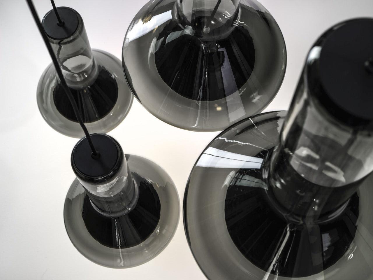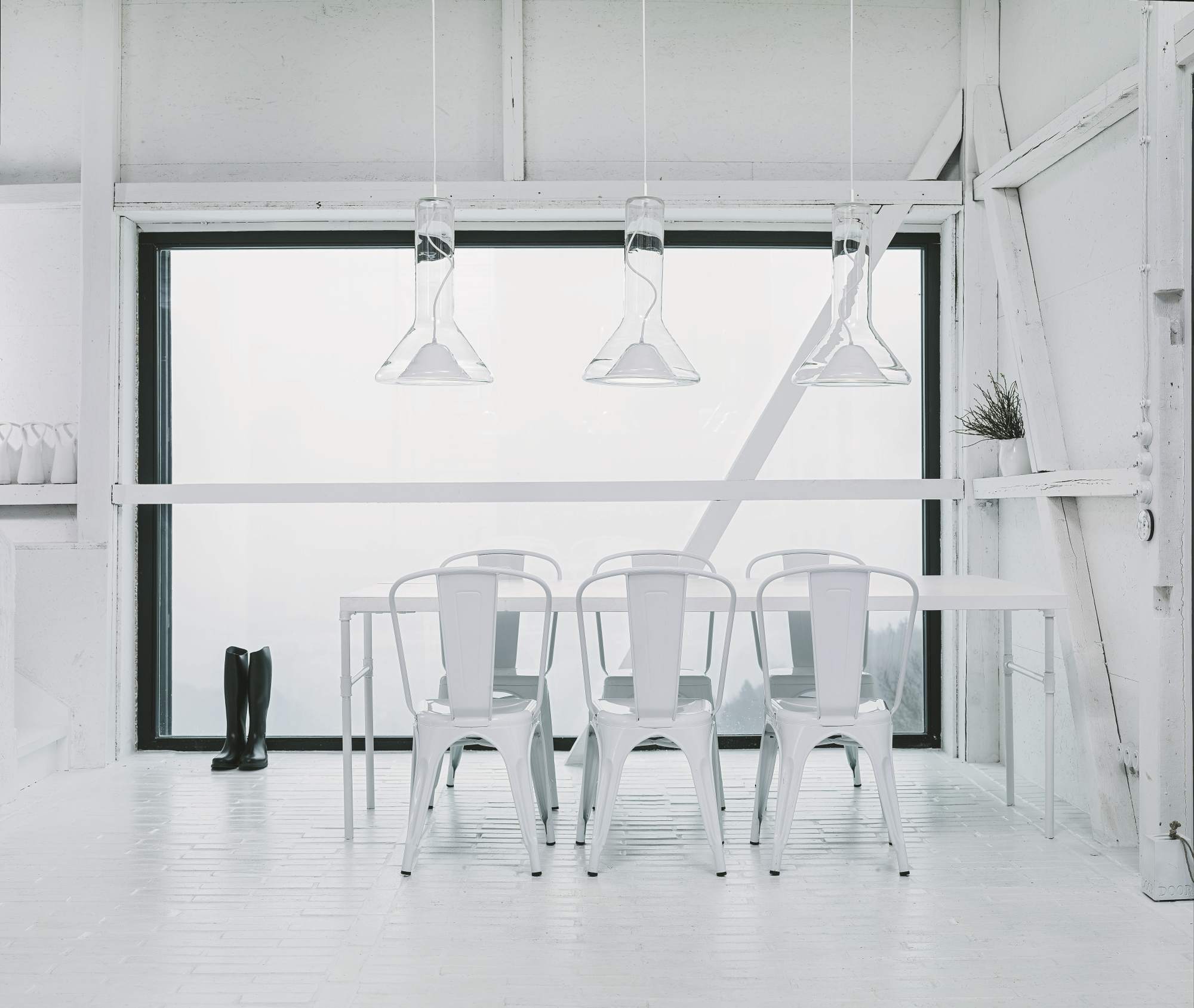 Lampa wisząca Whistle, inspirowana narzędziem szklarzy – dmuchawką, znana w języku czeskim jako gwizdek szklarza, charakteryzuje się przejrzystą bryłą formującą stożek światła. Centralny punkt lampy stanowi wyraźny reflektor z ręcznie tłoczoną metalową osłoną, a jej prosta, techniczna forma jest podkreślona przez goły kabel, wijący się w górę.