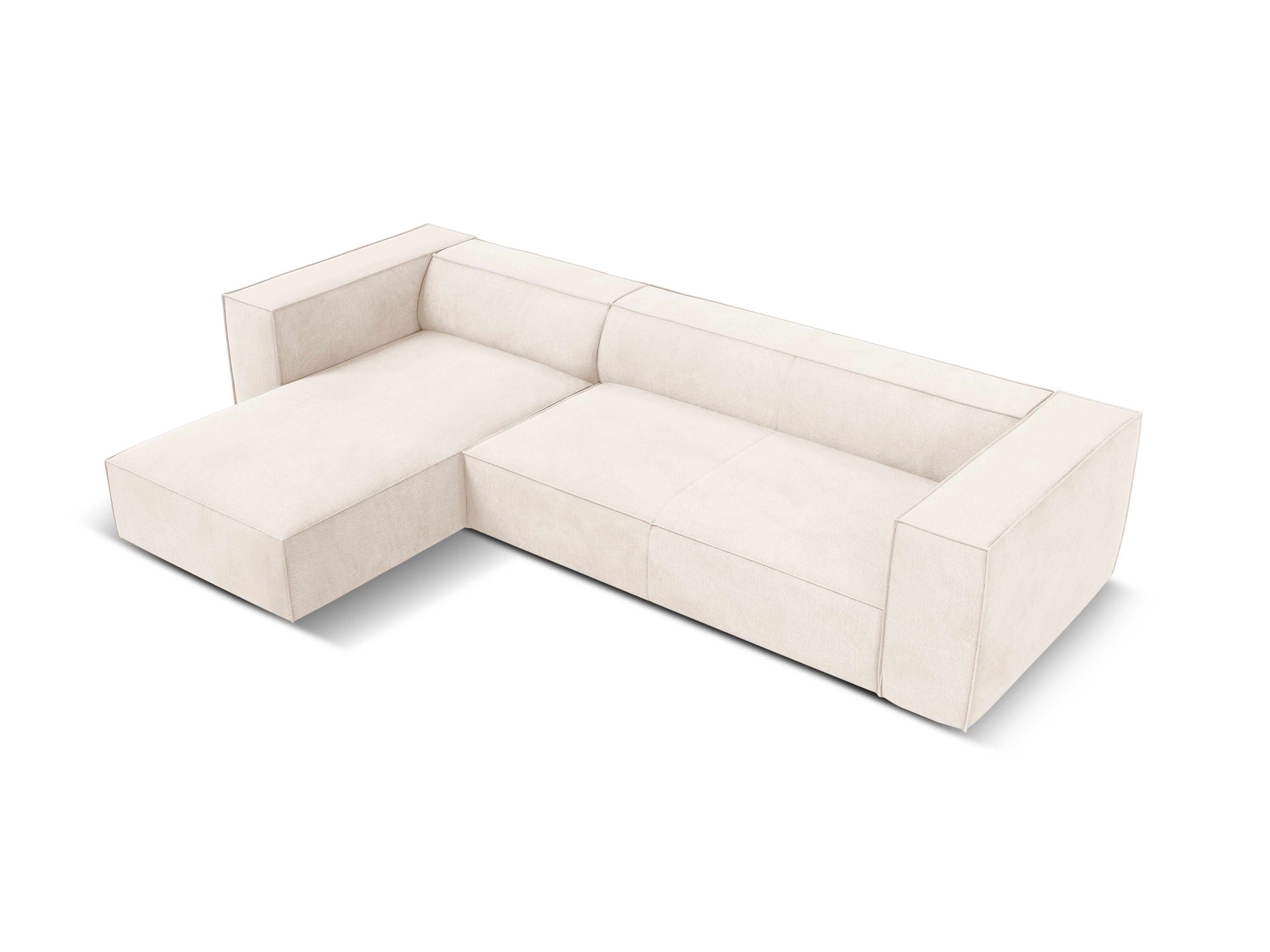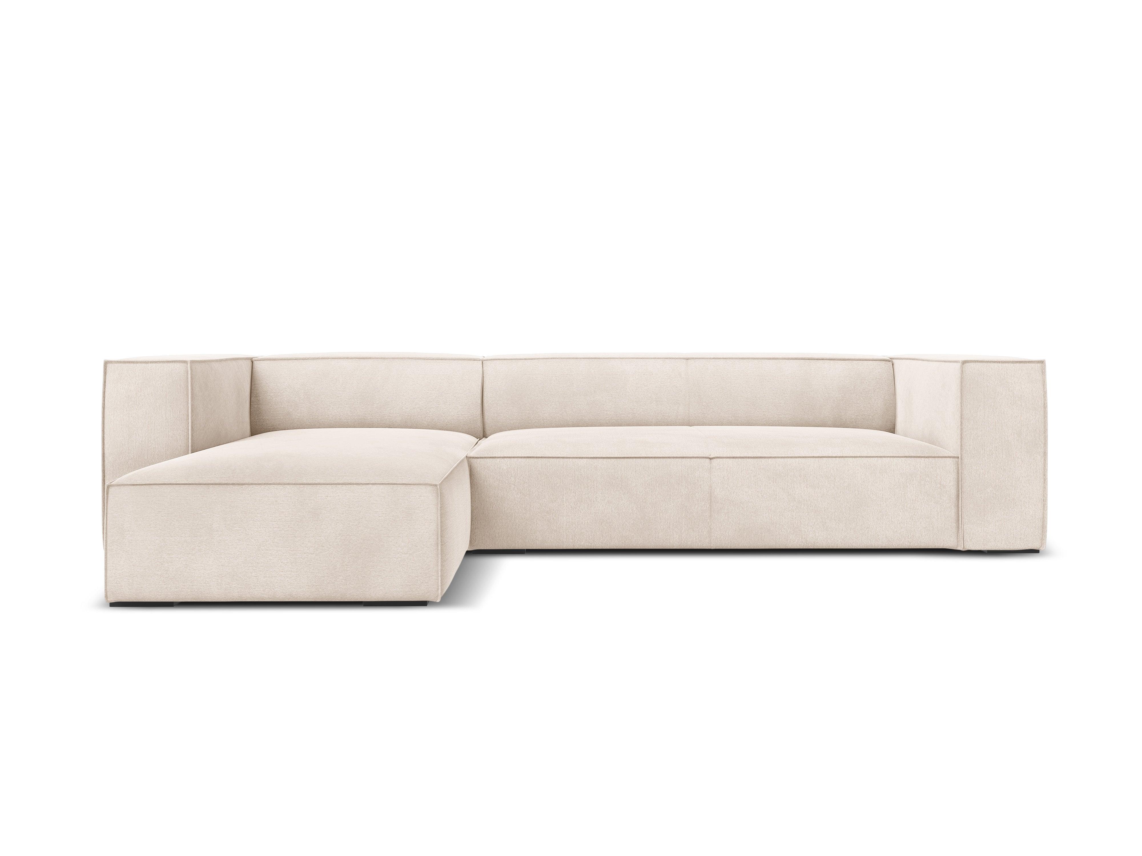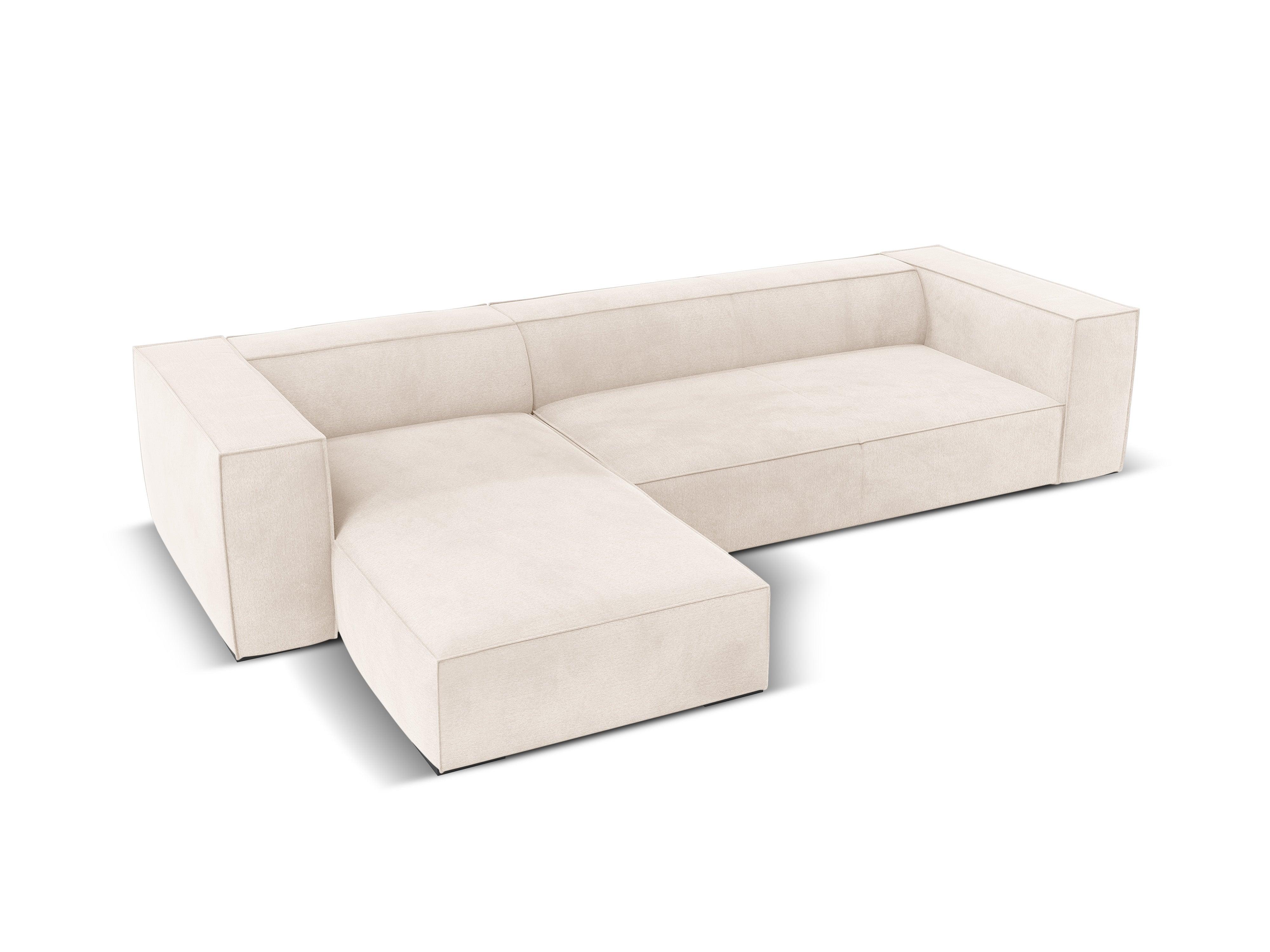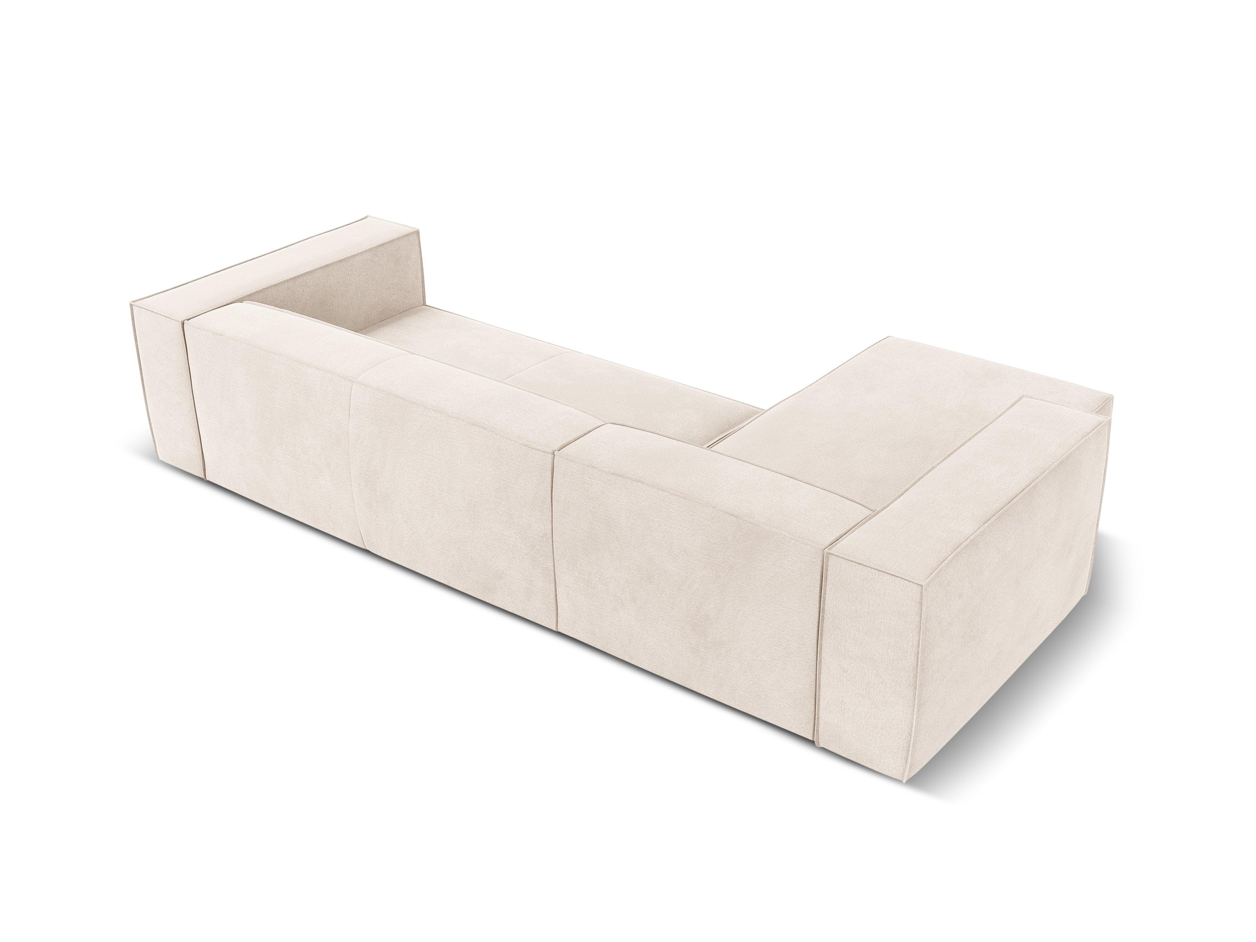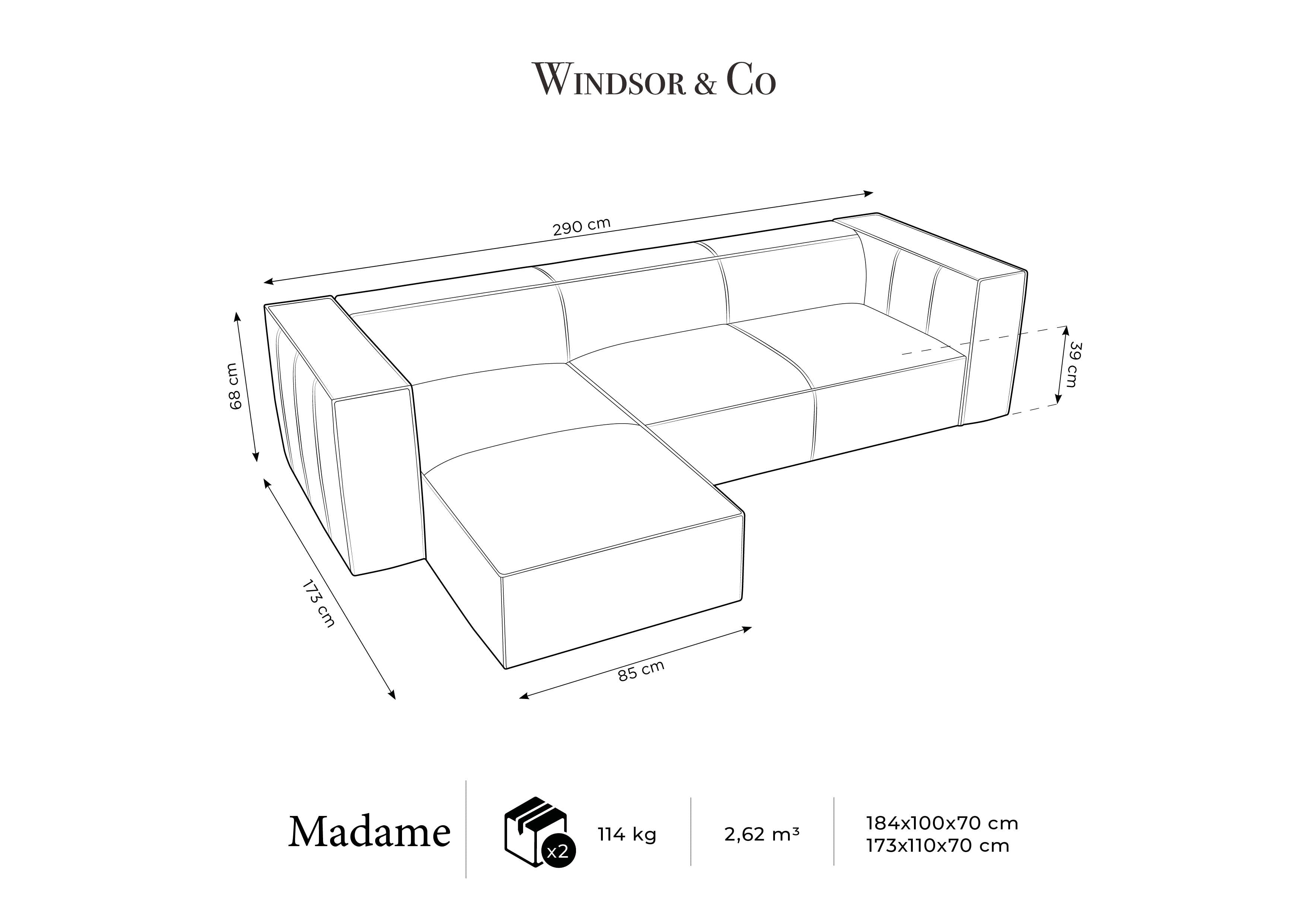 Narożnik dla czterech osób Madame o wyrazistym charakterze i eleganckim wykończeniu to doskonały wybór do nowoczesnego salonu. Głębokie siedzisko jest zarówno idealne do spotkań towarzyskich, jak i do chwil relaksu po ciężkim dniu. Pozwala wygodnie odpoczywać w swobodnych pozycjach. Z nisko osadzoną sylwetką, szerokimi podłokietnikami i oparciami tworzy przytulną bryłę.
