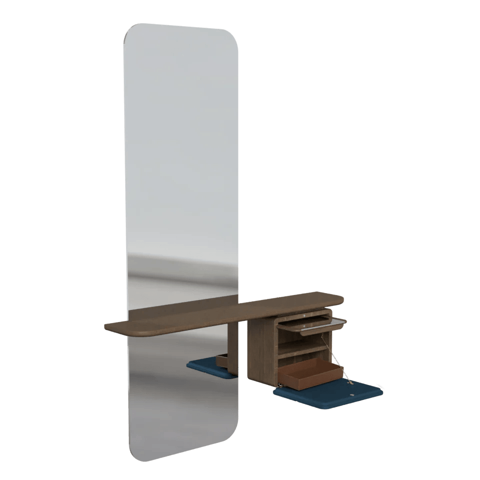 Dzięki odpowiedniej wysokości lustro zapewnia odbicie na całej swojej długości, co umożliwia perfekcyjne przygotowanie się przed wyjściem z domu. Dodatkowo, lustro wyposażone jest w półkę oraz małą szafkę z praktycznym lusterkiem i skórzaną tacką – idealne rozwiązanie do przechowywania codziennych przedmiotów, takich jak klucze, kosmetyki, okulary przeciwsłoneczne czy zapasowe monety.