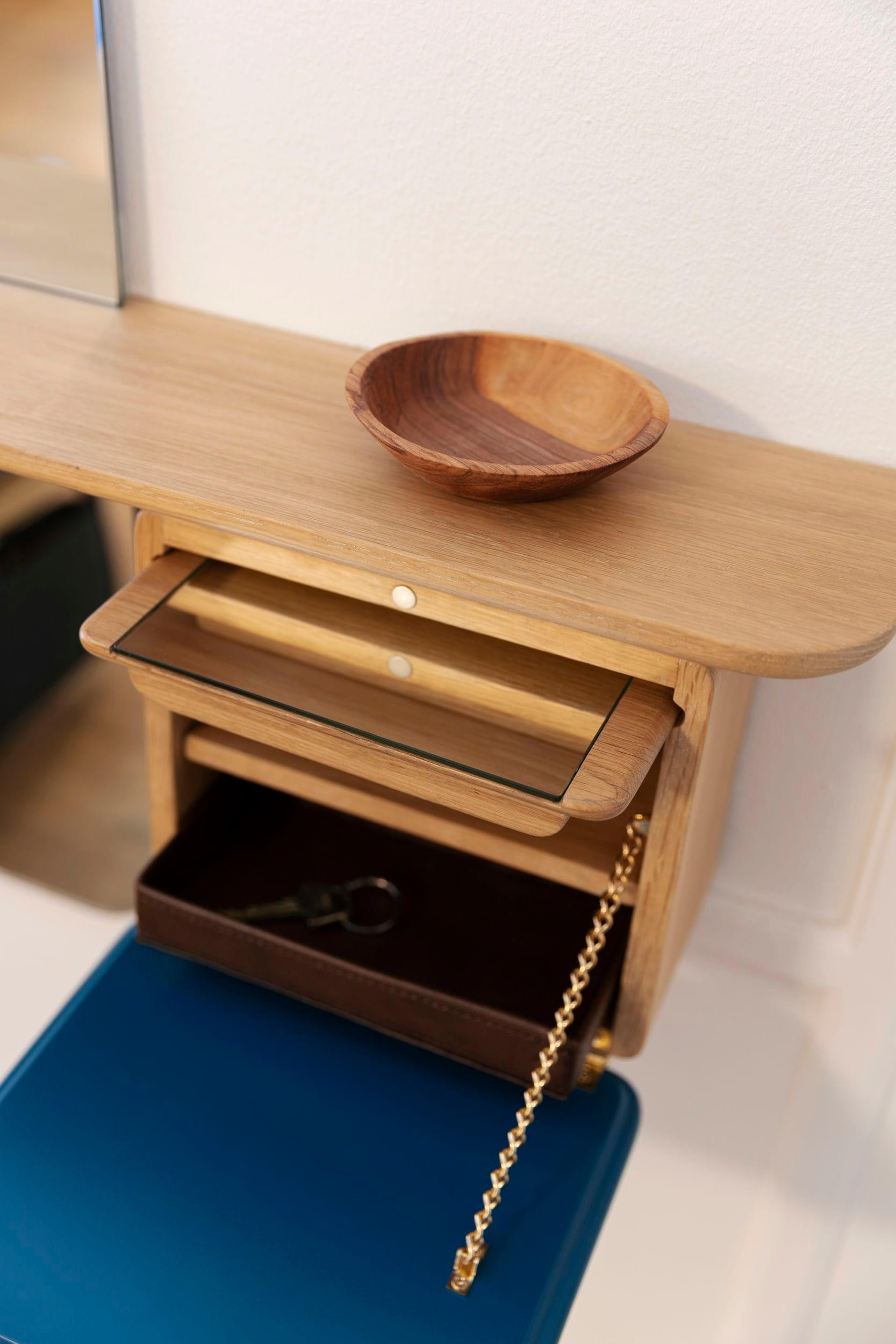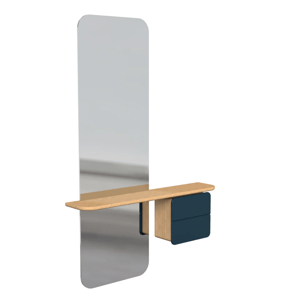 Dzięki odpowiedniej wysokości lustro zapewnia odbicie na całej swojej długości, co umożliwia perfekcyjne przygotowanie się przed wyjściem z domu. Dodatkowo, lustro wyposażone jest w półkę oraz małą szafkę z praktycznym lusterkiem i skórzaną tacką – idealne rozwiązanie do przechowywania codziennych przedmiotów, takich jak klucze, kosmetyki, okulary przeciwsłoneczne czy zapasowe monety.