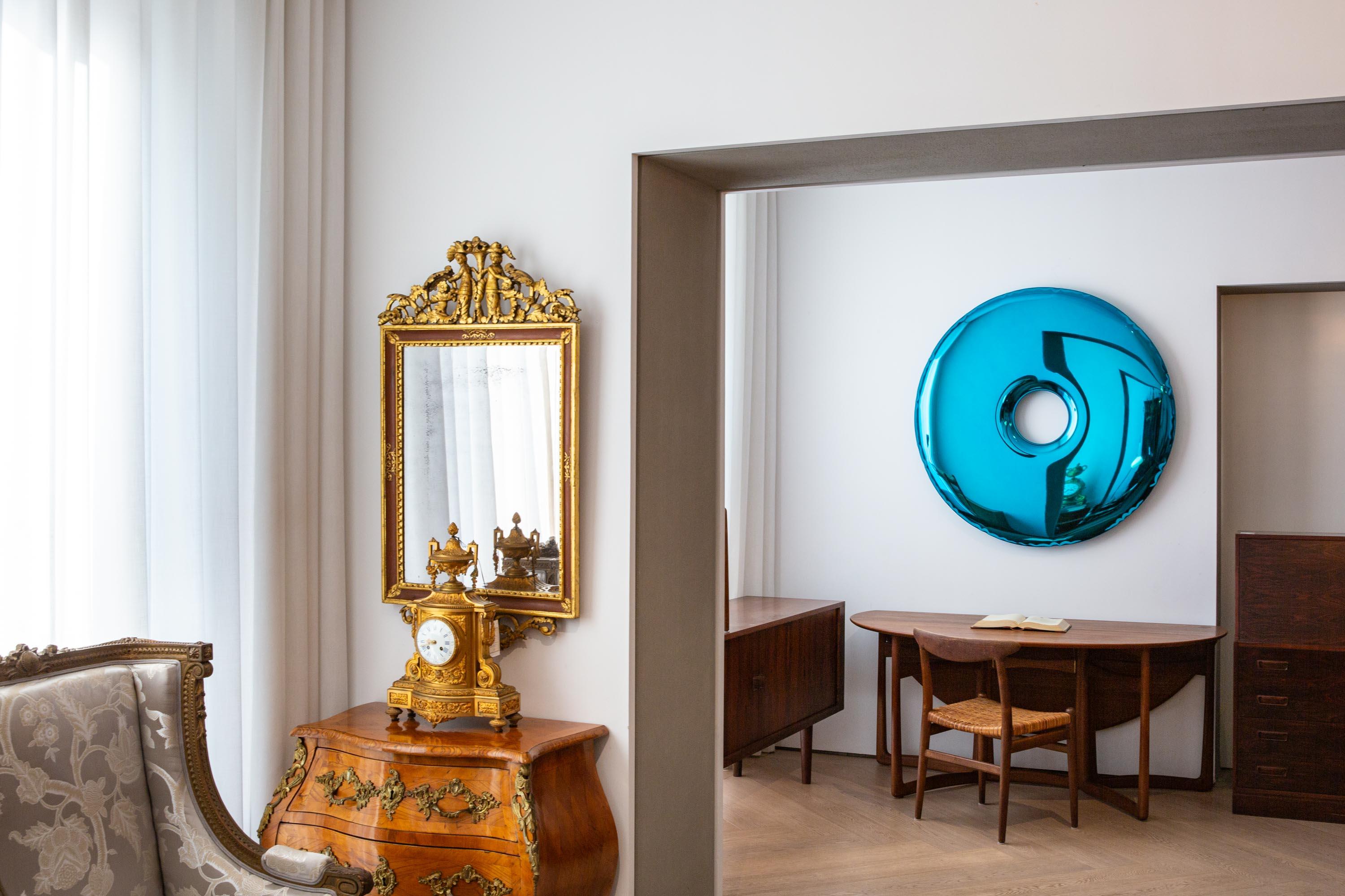 Rondo, to szafirowe lustro, które wznosi się ponad tradycyjne pojęcie lustra, łącząc funkcjonalność z artystycznym wyrazem. Ten nadmuchany obiekt ze stali przenosi nas w świat narracji, odkrywając swój potencjał projektowy dzięki innowacyjnej technologii produkcji FiDU.