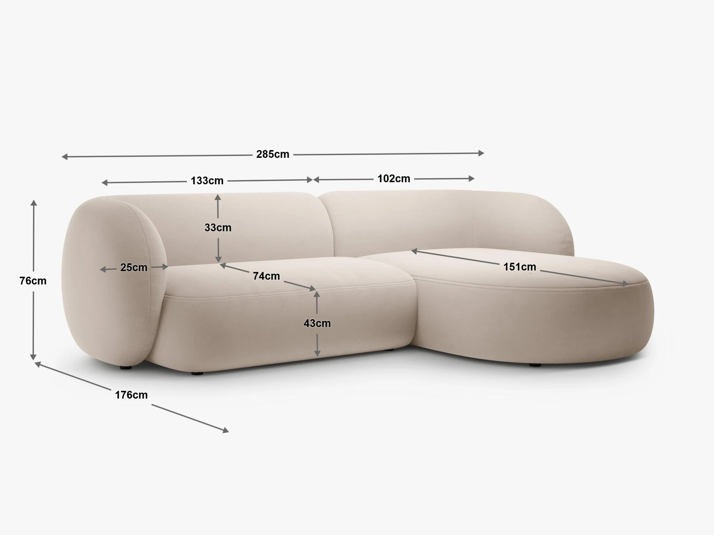 Narożnik Kate łączy elegancję inspirowaną stylem mid-century z wygodą codziennego użytkowania. Jego obła, rzeźbiarska forma sprawia, że staje się wyjątkową ozdobą salonu, a miękka tapicerka i sprężyste wypełnienie zapewniają komfortowy odpoczynek. Przemyślany układ w kształcie litery L z szezlongiem oferuje dodatkową przestrzeń, czyniąc narożnik idealnym miejscem zarówno do relaksu, jak i spotkań w gronie bliskich.
