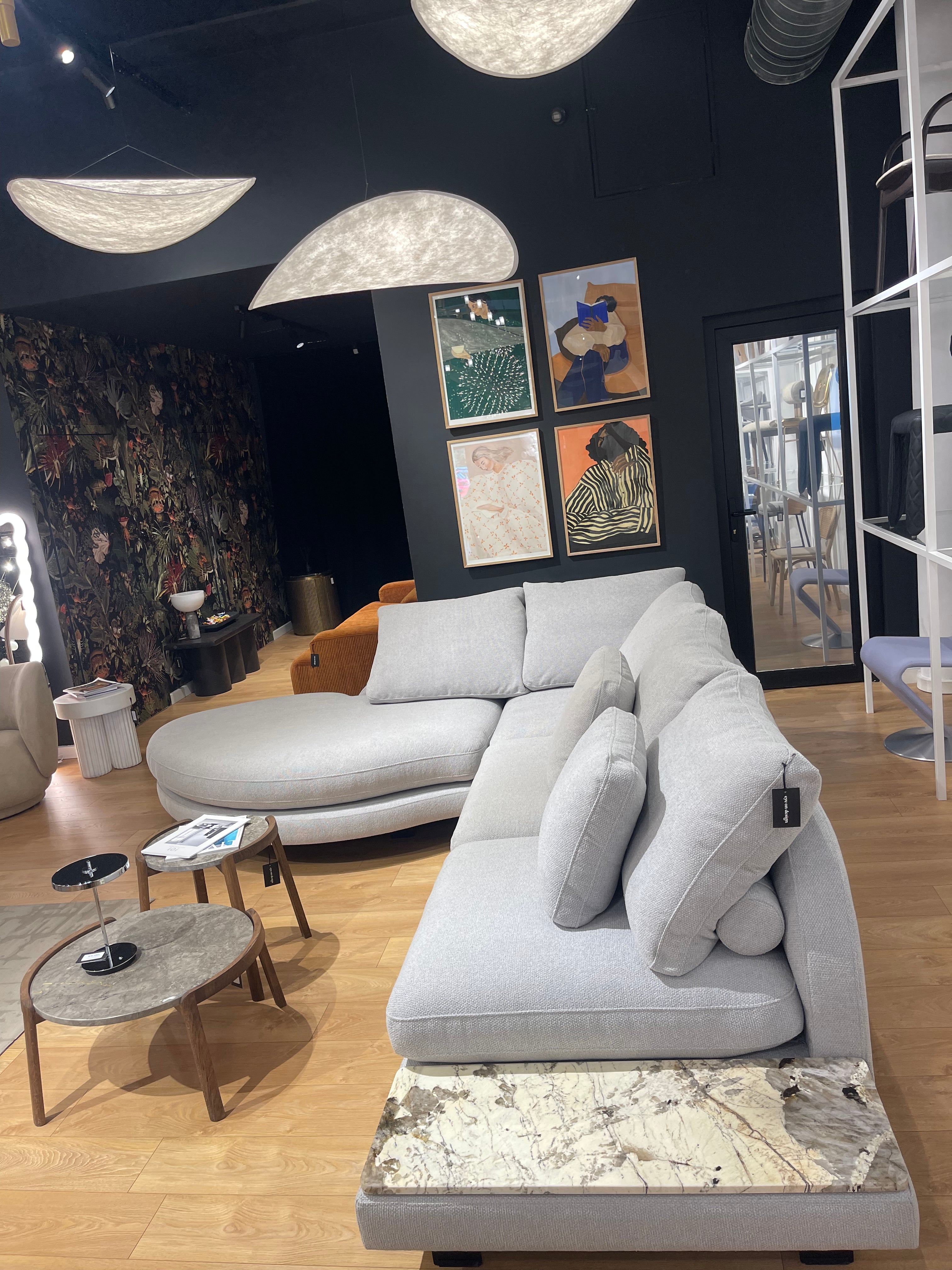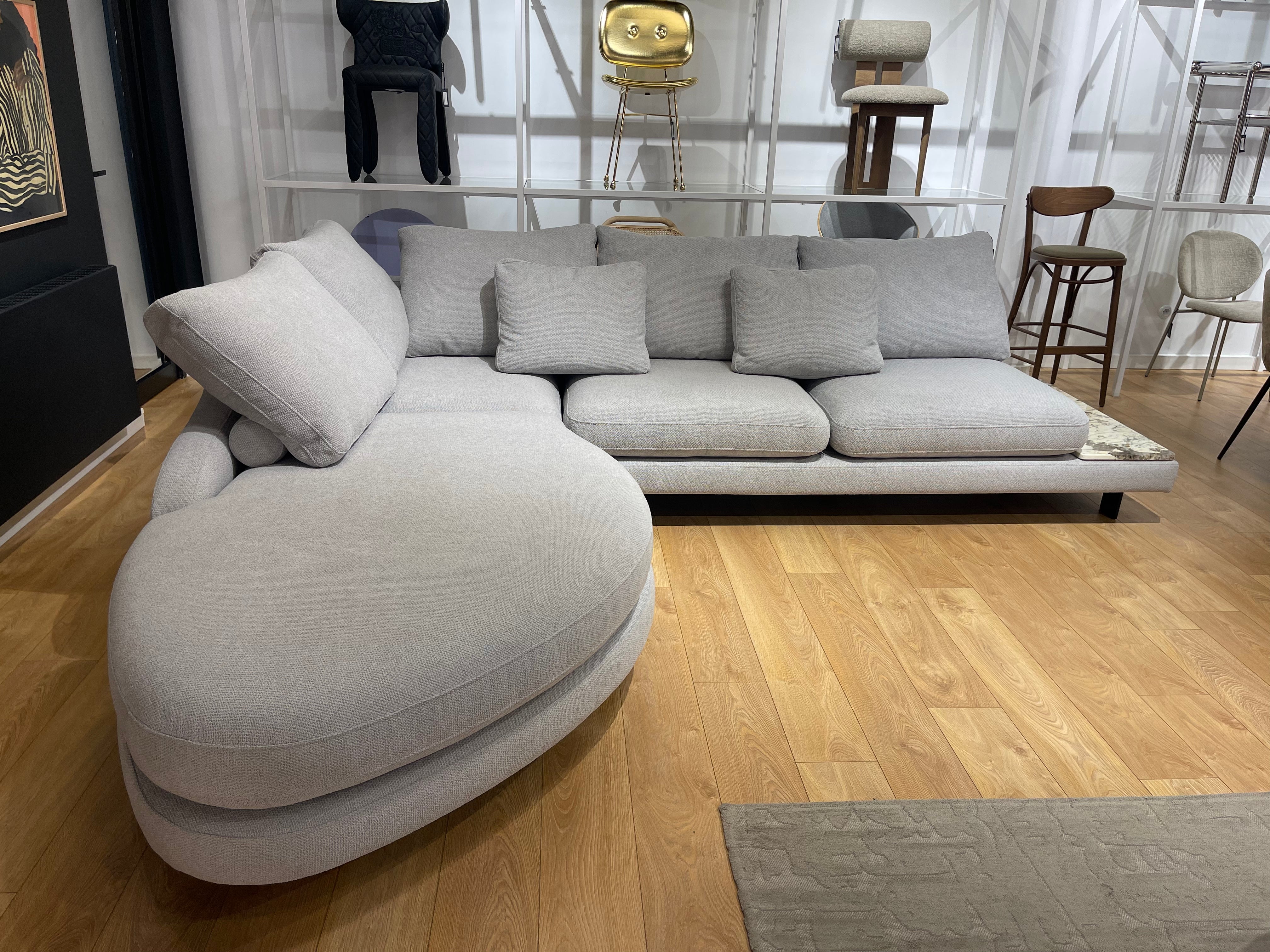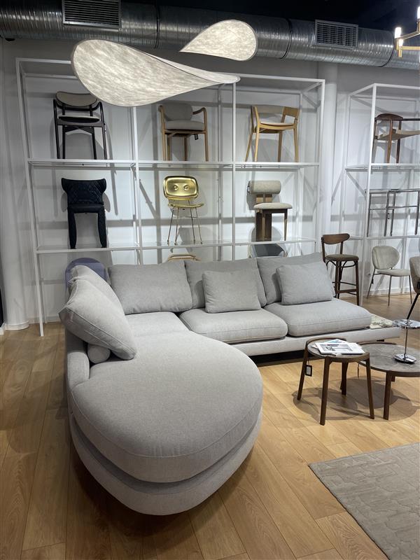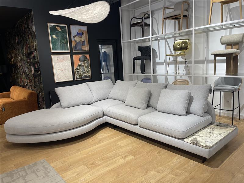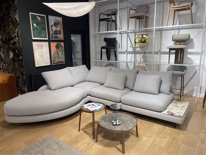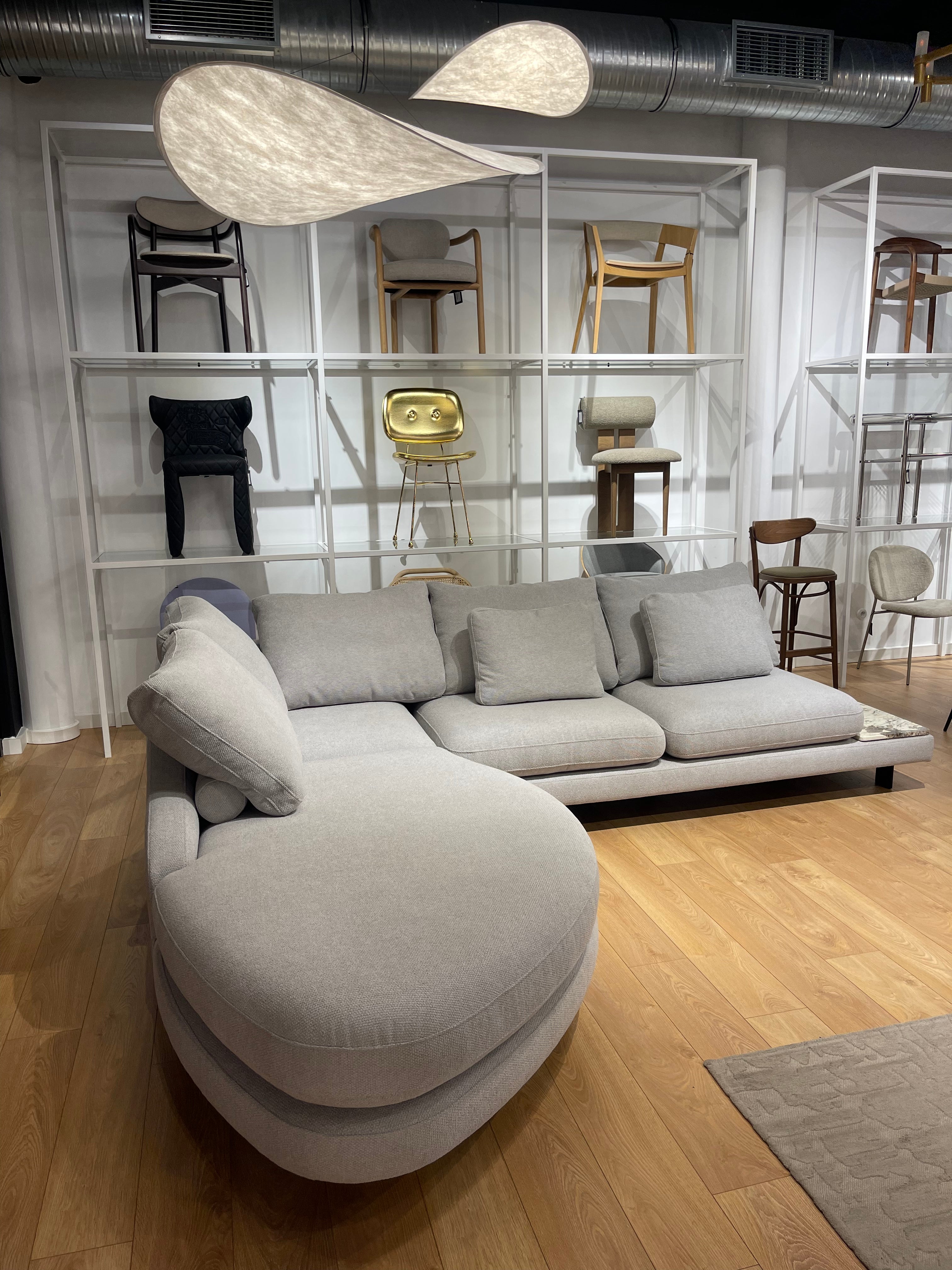 Narożnik Dumbo widoczny na zdjęciu to model poekspozycyjny, dostępny w odcieniu szarym, w tkaninie Telone 24 (2). Jego organiczna forma inspirowana była… uszami słonia. Projektanci tworzyli zainspirowani naturą – nieregularna linia, morficzne kształty, miękkie łuki i płynne przejścia kojarzące się z owalem księżyca czy kształtem kamieni, zestawione zostały z kontrastującą geometrią. To projekt, w którym nowoczesność spotyka klasykę w zupełnie nowej formie.