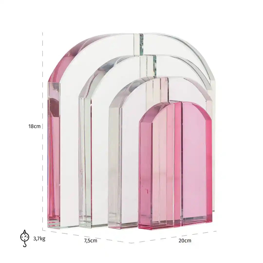 Nowoczesna podpórka do książek Alissia w formie transparentnych łuków z różowym akcentem to wyjątkowy dodatek, który łączy funkcjonalność z dekoracyjnym charakterem. Wykonane ze szkła, pięknie odbijają światło i wnoszą do wnętrza lekkość oraz elegancję. Ich geometryczna forma sprawia, że doskonale pasują do nowoczesnych i minimalistycznych aranżacji.