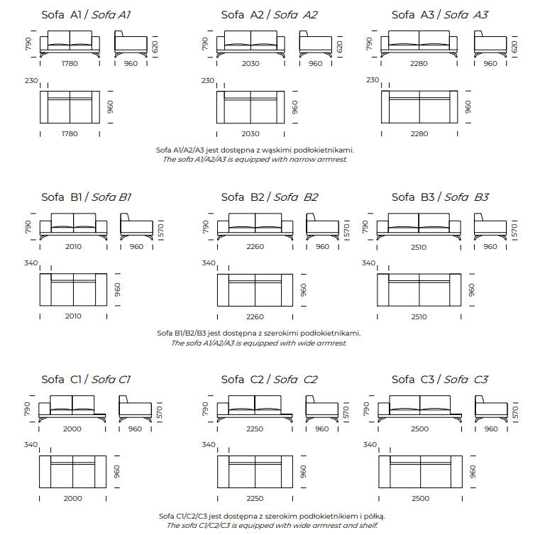 Szerokość całkowita z szerokim podłokietnikiem i półką: 200 / 225 / 250 cm