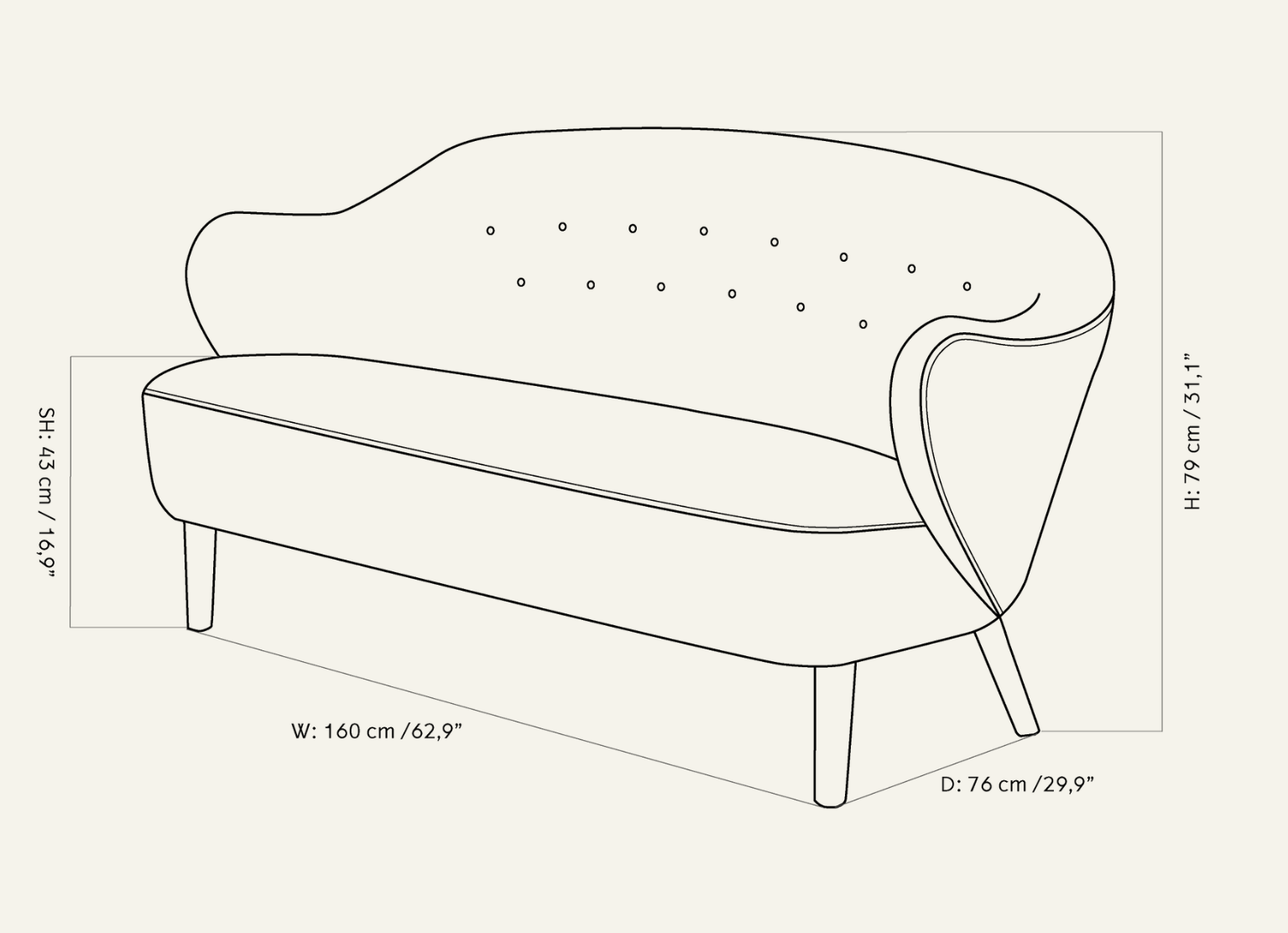 Charakterystyczne, zaokrąglone podłokietniki, pikowane oparcie i smukłe drewniane nogi tworzą harmonijną całość, która łączy przytulność z elegancją. Sofa, mimo kompaktowych wymiarów, oferuje wyjątkowy komfort i głębokie siedzisko, zachowując wizualną lekkość. W połączeniu z pasującym fotelem z tej samej kolekcji tworzy spójny i stylowy duet, idealny do nowoczesnych i klasycznych wnętrz.