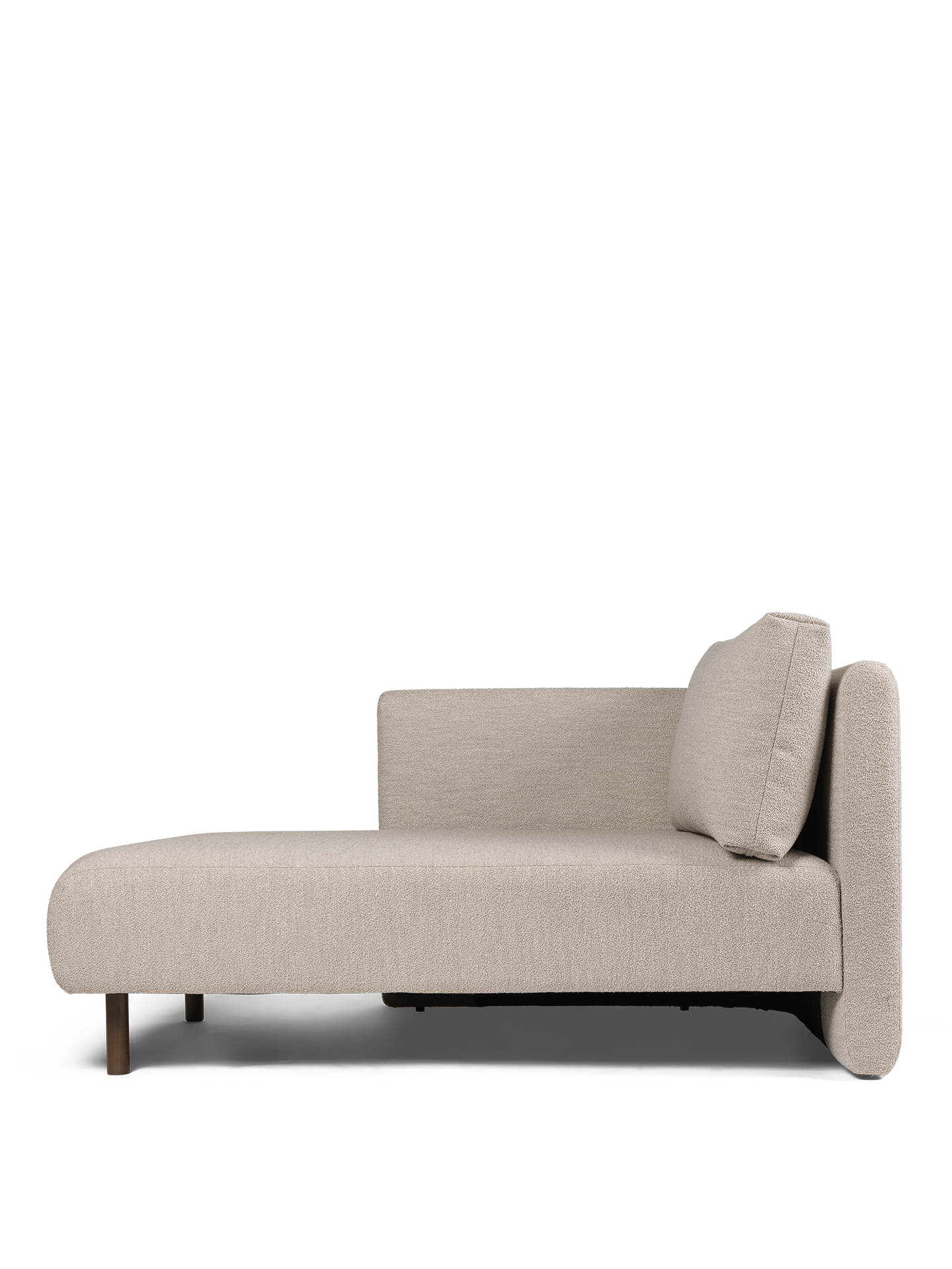 Solidna konstrukcja z certyfikatem FSC™ gwarantuje trwałość i stabilność, a opcja wyboru między tapicerowanymi a drewnianymi nogami pozwala na personalizację designu. Jako element kolekcji Made to Order, szezlong oferuje szeroką gamę tkanin i kolorów, umożliwiając stworzenie unikalnego, dopasowanego do wnętrza mebla.
