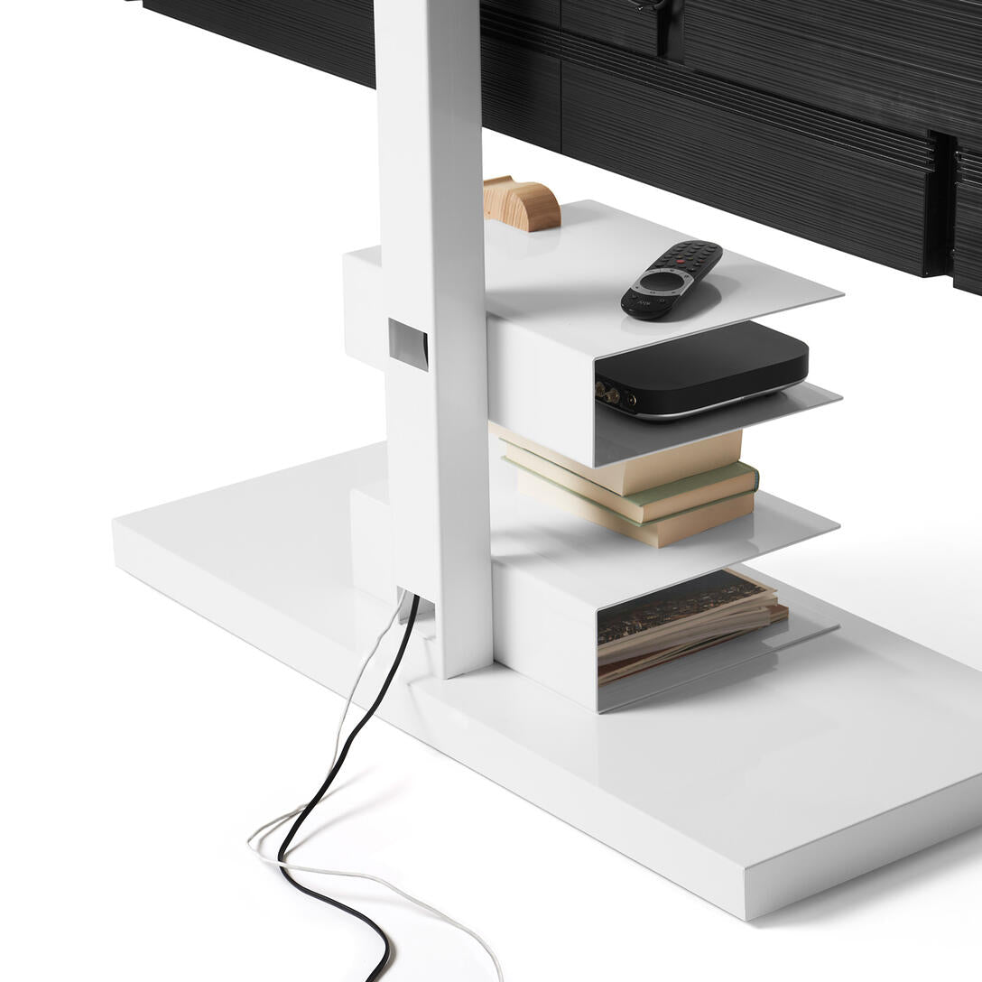 Ptolomeo Tv Smart – nowoczesny stojak pod telewizor z designerskim charakterem. Projekt autorstwa Bruno Rainaldiego to elegancka i funkcjonalna odpowiedź na potrzeby współczesnych użytkowników multimediów. Lakierowana konstrukcja ze stali mieści telewizory o przekątnej od 43 do 82 cali (standard VESA), oferując jednocześnie estetyczne zarządzanie kablami oraz dwie stalowe półki na akcesoria RTV.