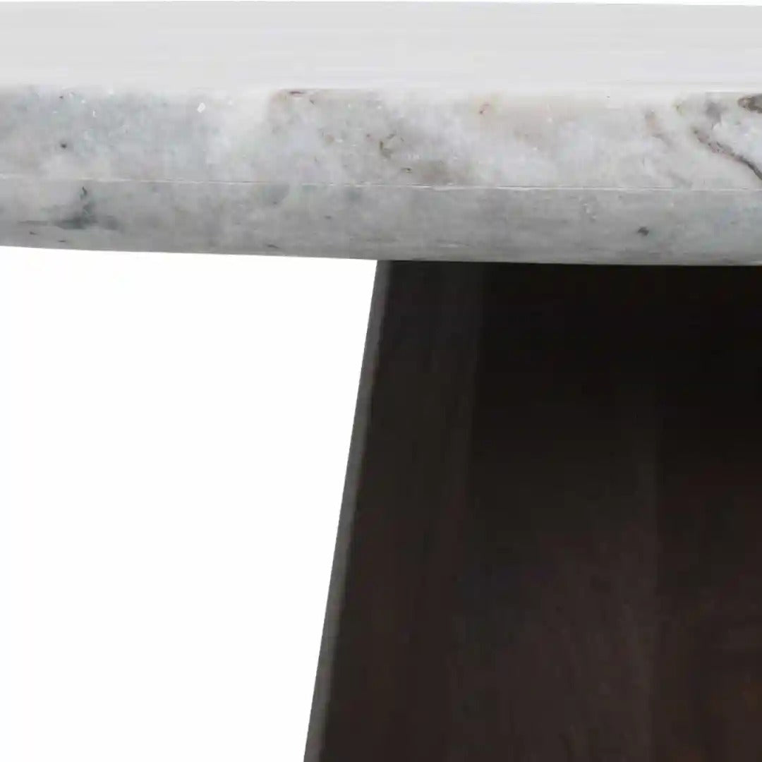 Okrągły stół jadalniany Oberoy z marmurowym blatem i masywną podstawą z drewna mango przyciąga wzrok eleganckim kontrastem kolorystycznym. Jasny, lekko przecierany marmur Toronto tworzy wyjątkową strukturę powierzchni, która pięknie komponuje się z ciemnym, geometrycznie wyprofilowanym trzonem.