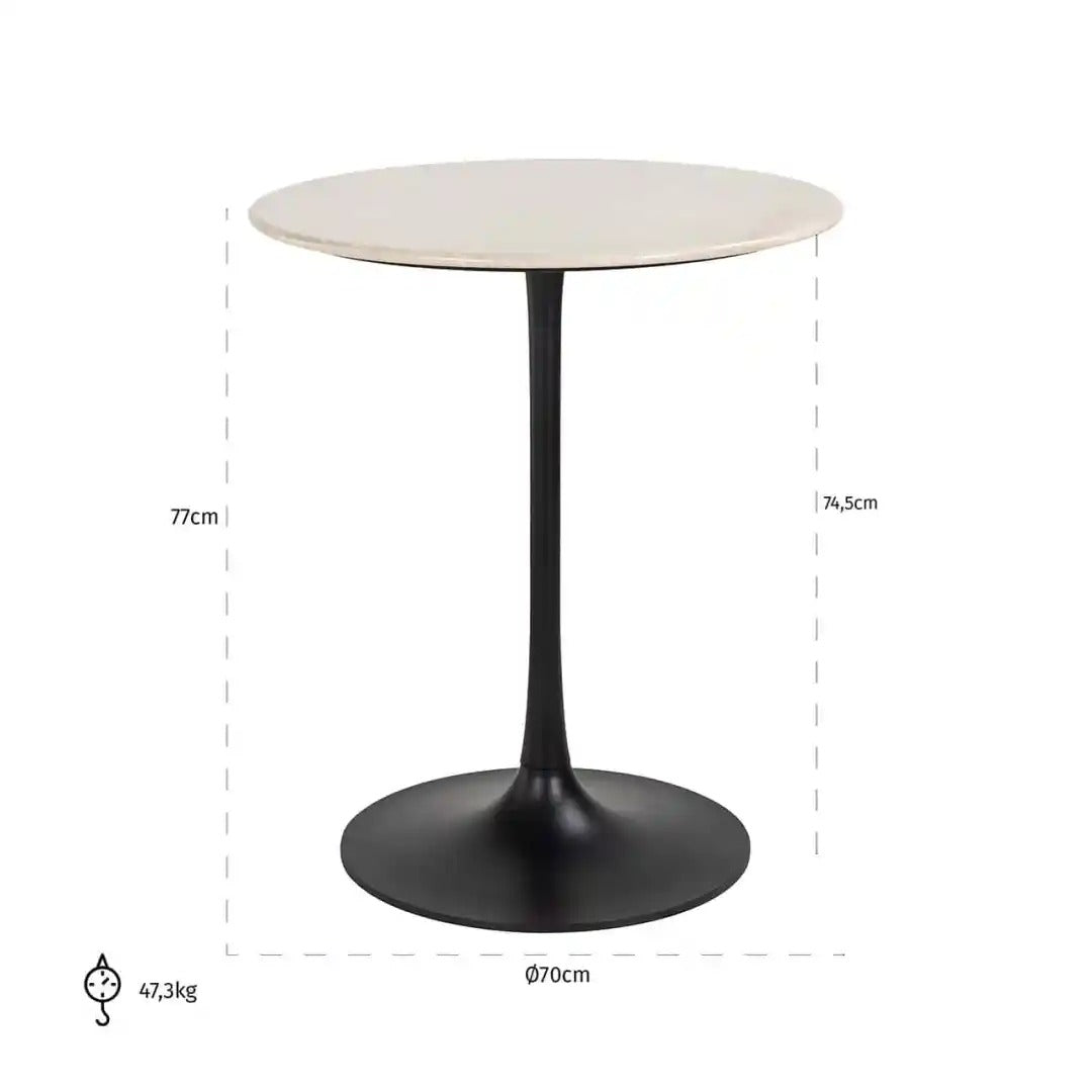Dzięki kompaktowym wymiarom stolik sprawdzi się doskonale w kuchni, jadalni czy kawiarni, dodając elegancji i wyrafinowania każdej aranżacji. Wysokiej jakości marmur w połączeniu z solidną konstrukcją żelazną gwarantuje trwałość, a jednocześnie unikalny charakter, który podkreśli wyjątkowy klimat wnętrza.