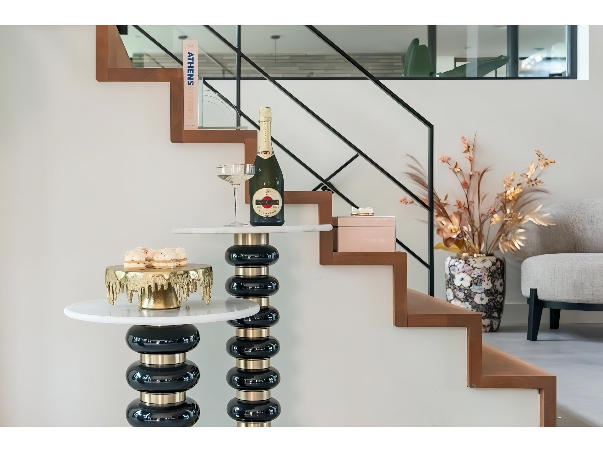 Elegancki stolik boczny Barbara w unikatowej formie łączy w sobie luksus i nowoczesny design. Podstawa z kulistych elementów w bieli i złocie tworzy wyrazisty akcent, a jasny blat z marmuru White Banswara dodaje całości subtelnej elegancji. To mebel, który zachwyca formą i przyciąga uwagę, stając się wyjątkową dekoracją wnętrza.