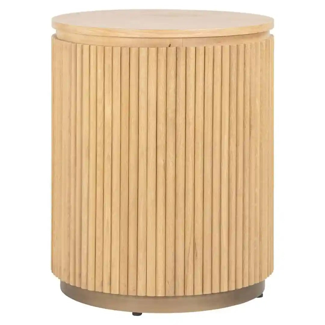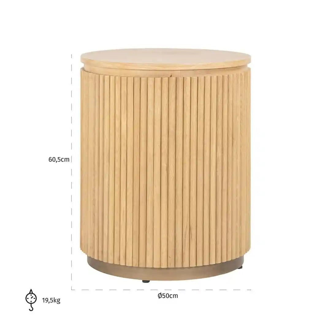 Elegancki stolik boczny Belfort o cylindrycznym kształcie to wyjątkowe połączenie funkcjonalności i dekoracyjnej formy. Jego ryflowana powierzchnia w naturalnym wybarwieniu drewna dodaje wnętrzu przytulności i subtelnej struktury. Kompaktowa forma sprawia, że idealnie sprawdzi się jako stolik boczny przy sofie, stolik nocny lub stylowy akcent w przedpokoju.