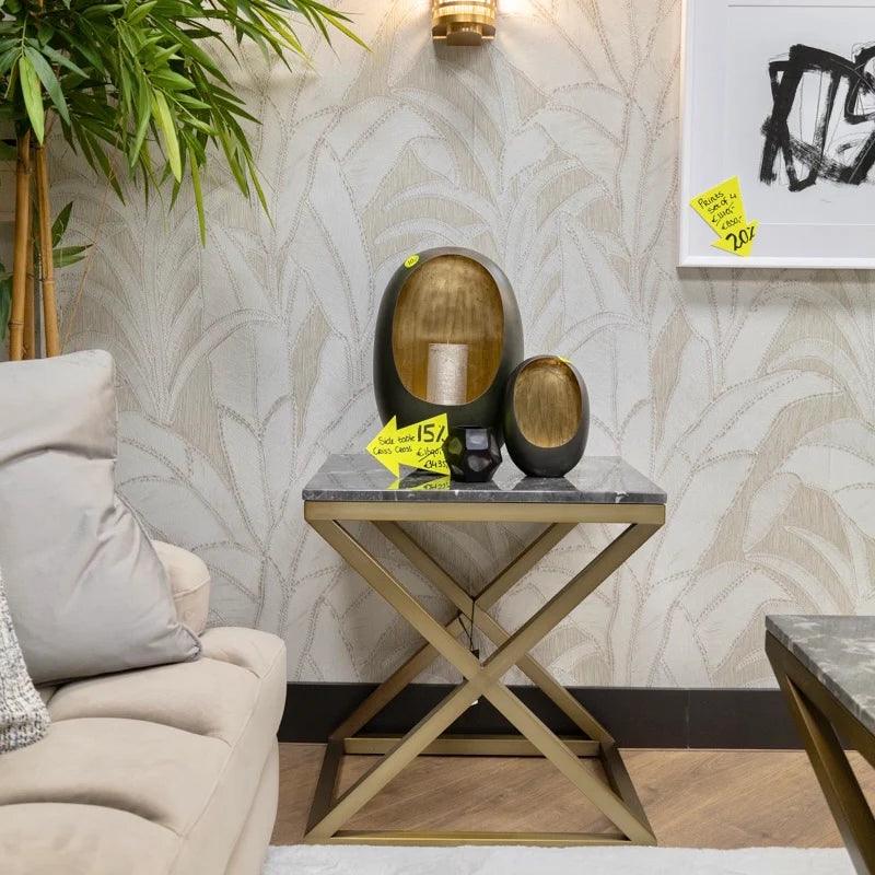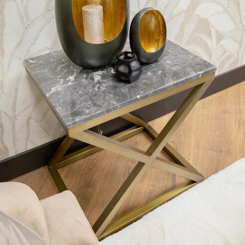Stolik boczny Criss Cross to doskonałe połączenie nowoczesnego designu z klasyczną elegancją. Jego charakterystyczna rama w kształcie litery X nie tylko zapewnia stabilność, ale również dodaje stolikowi unikalnego, modnego charakteru. Wykończenie ze szczotkowanego mosiądzu nadaje mu subtelny blask, który pięknie kontrastuje z chłodnymi tonami szarego marmuru na blacie.