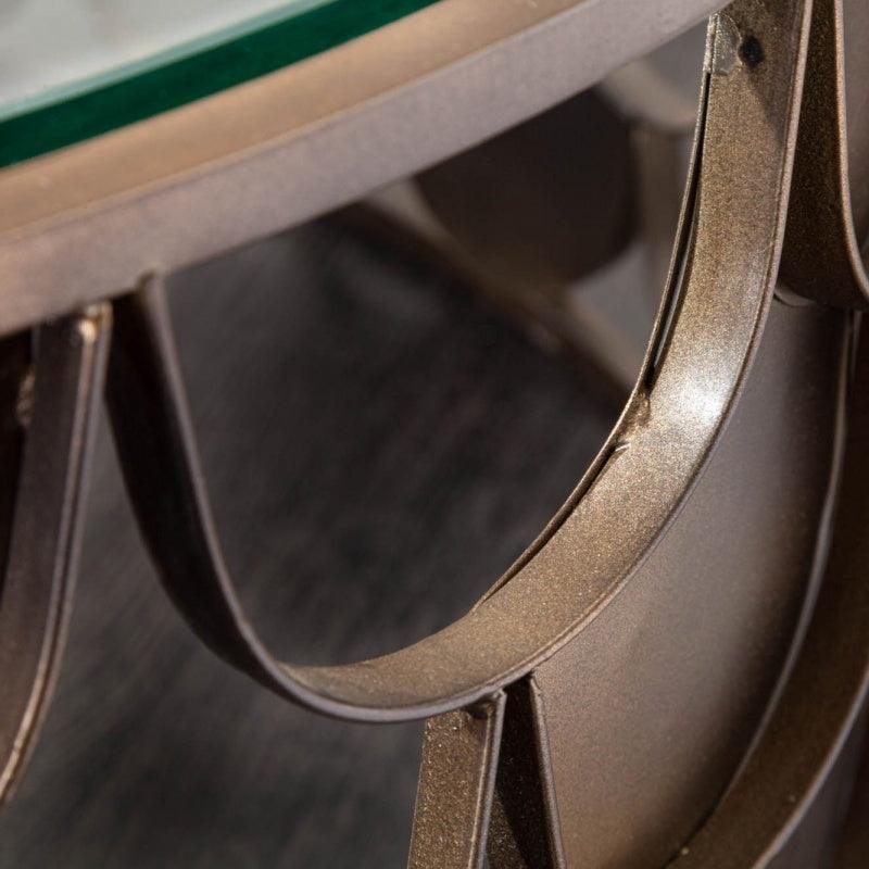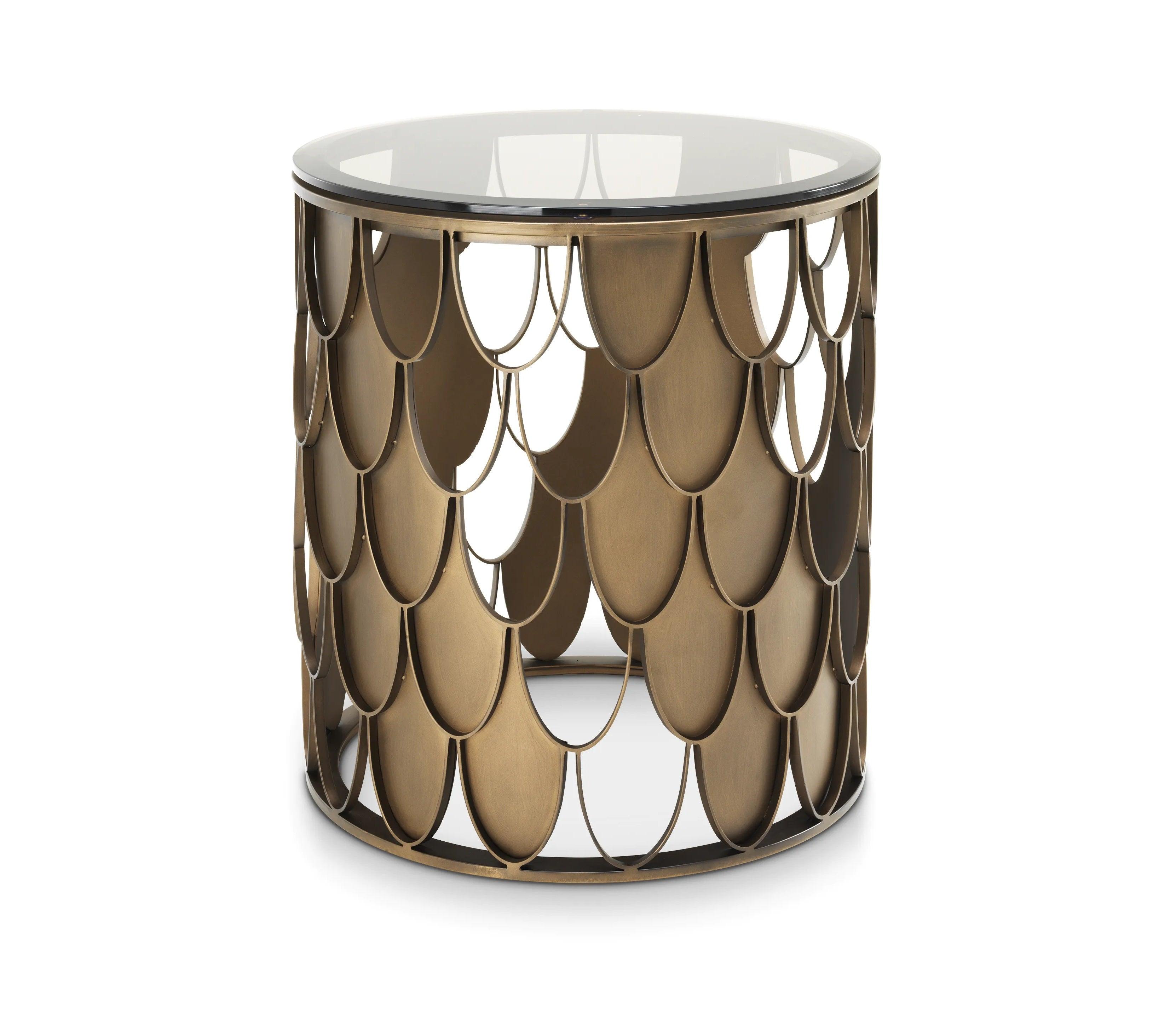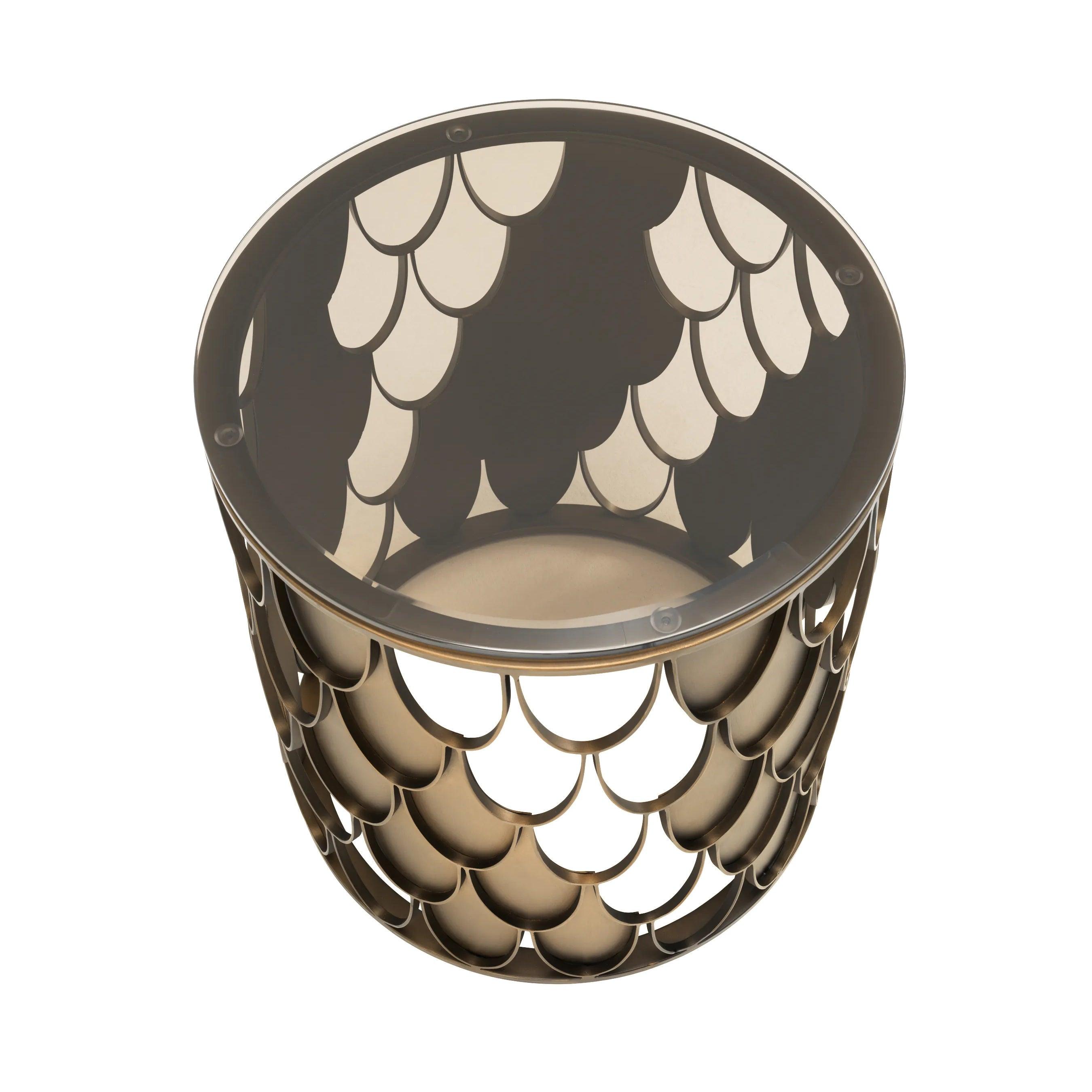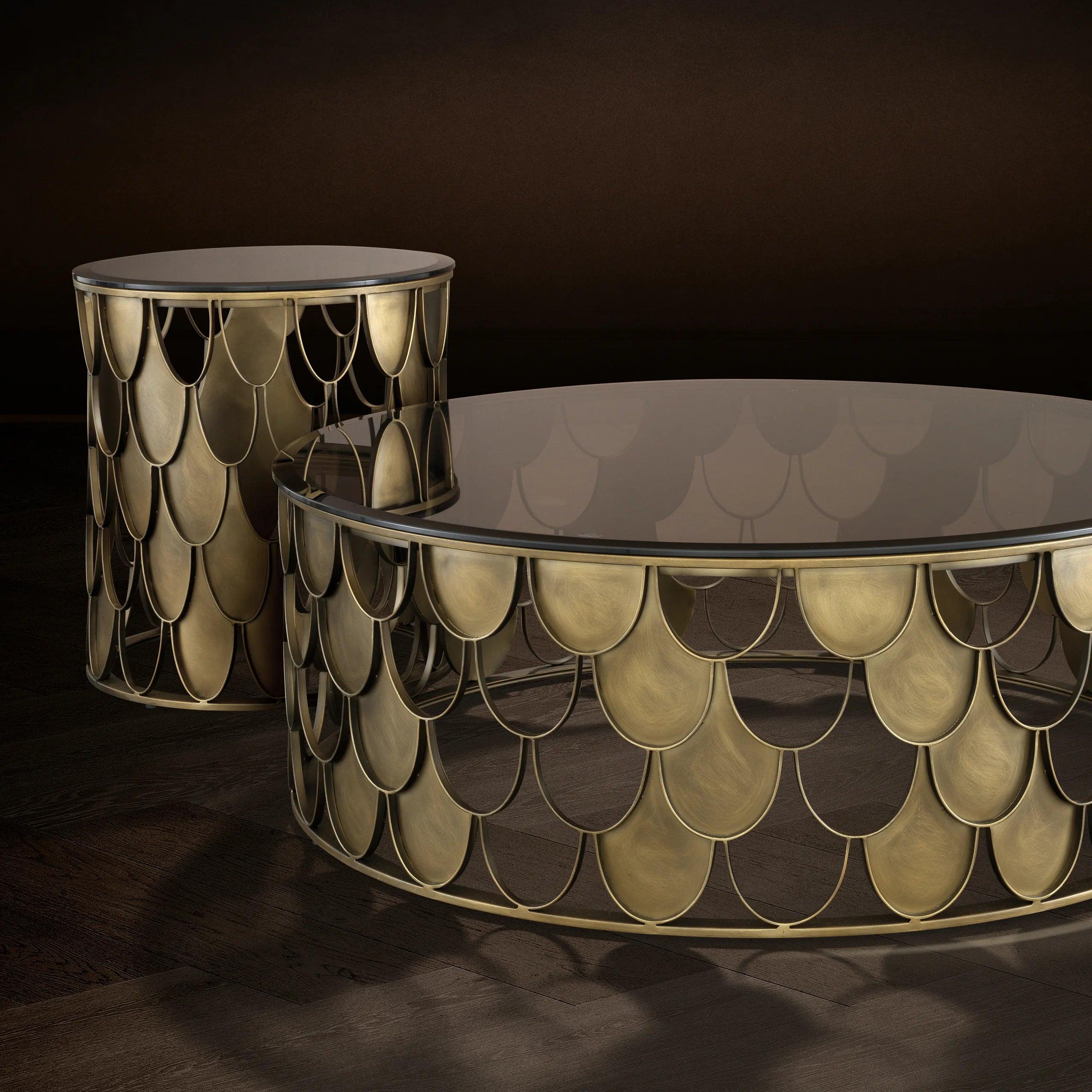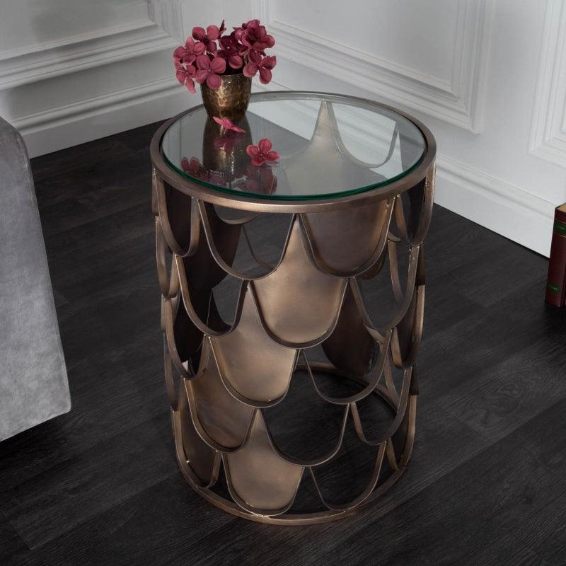Zanurz się w głęboką magię wschodnich tradycji z naszym stolikiem bocznym L'indiscret. Jak koi, płynący majestatycznie w stawie, ten wyjątkowy, m stolik sprawi, że Twoje wnętrze będzie emanować spokojem i głębokim znaczeniem. Jego konstrukcja przypomina srebrzyste łuski karpia koi, które delikatnie odbijają światło w antycznym miedzianym wykończeniu. Natomiast płowy szklany blat przypomina wodne odbicie, dodając subtelnego, niemal eterycznego uroku.