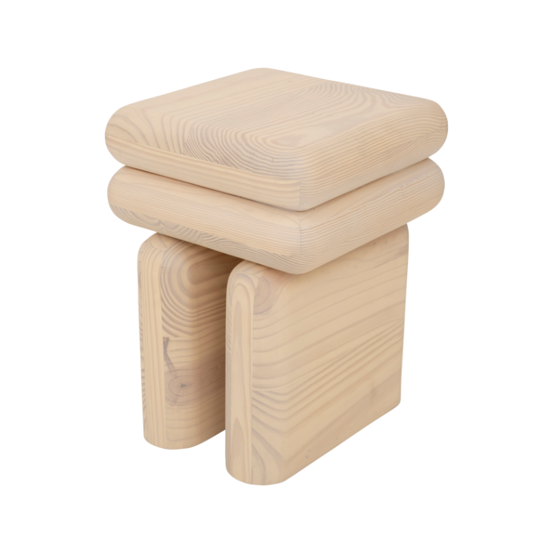 Stolik boczny Mono wyróżnia się masywną, miękko zaokrągloną formą, która nadaje mu przyjazny i rzeźbiarski charakter. Ten drewniany stolik boczny wykonany z drewna sosnowego eksponuje naturalne usłojenie, wprowadzając do wnętrza ciepło i autentyczność.