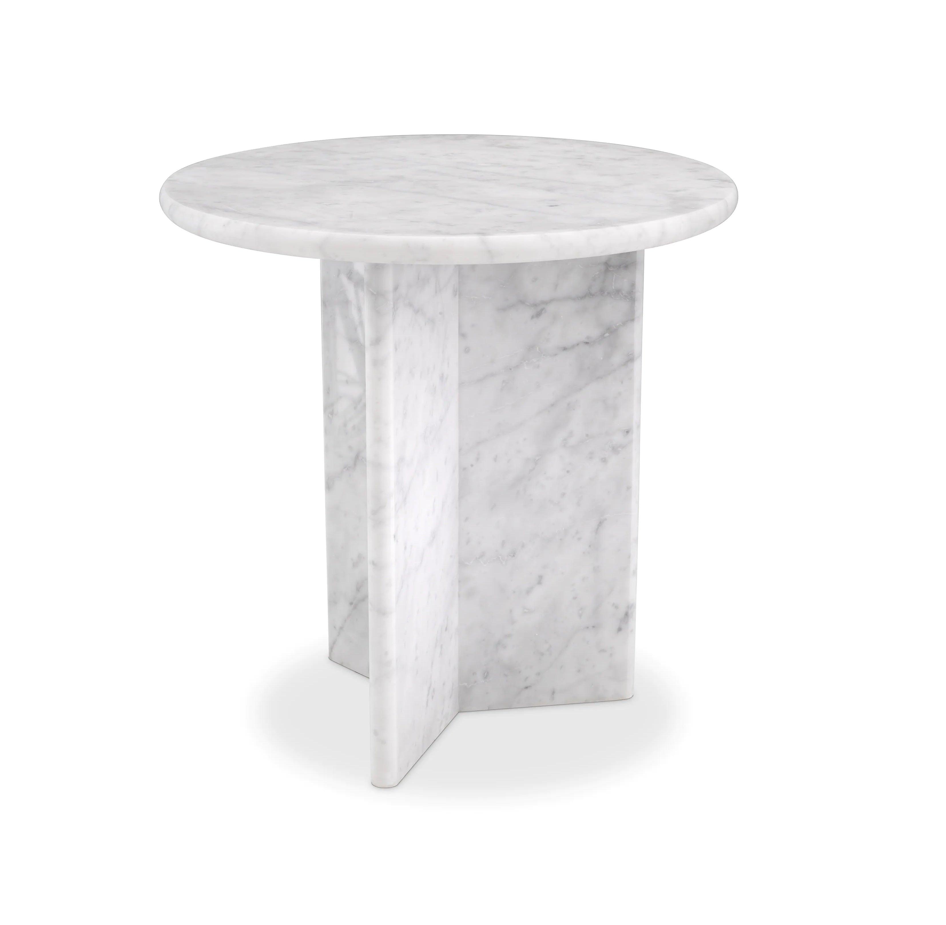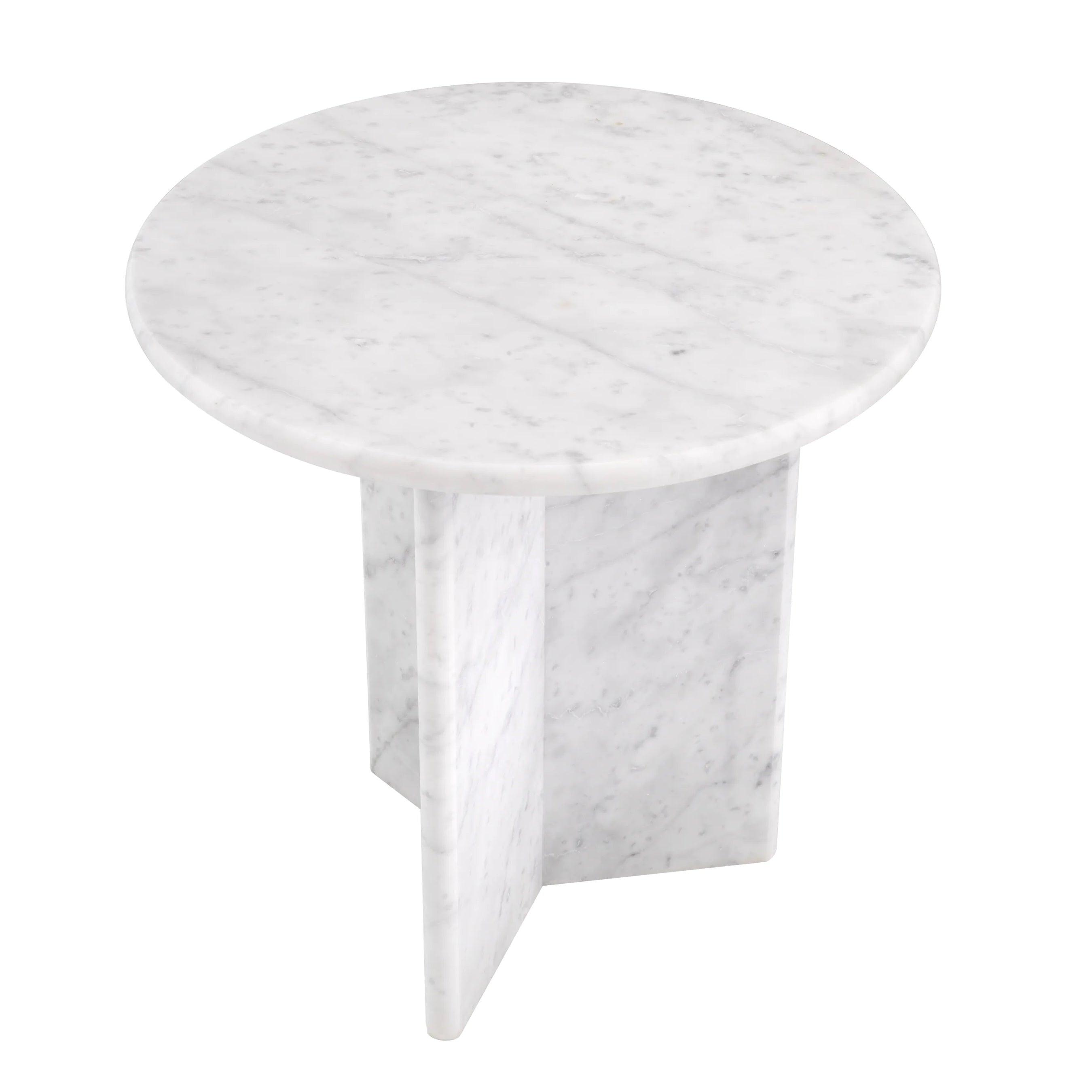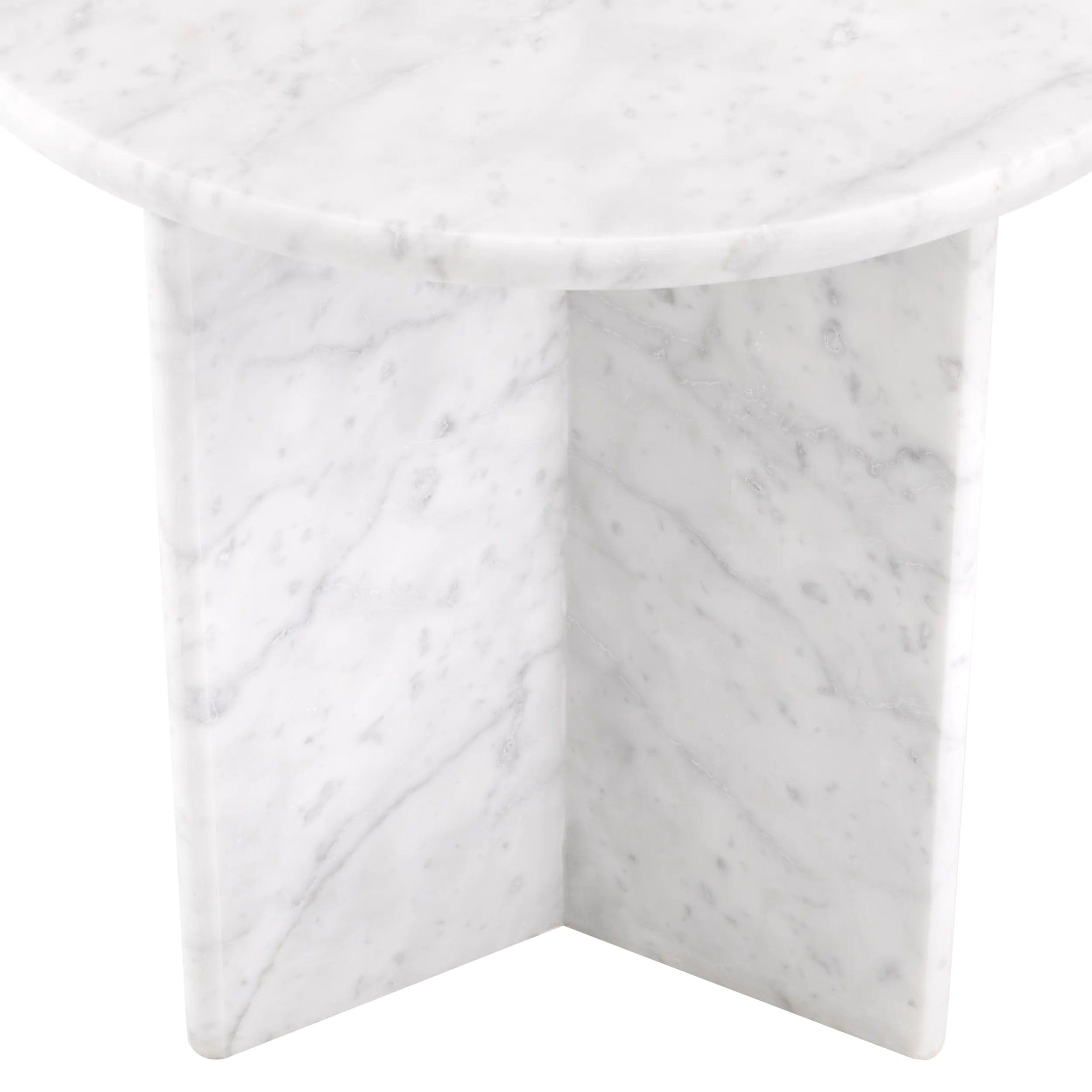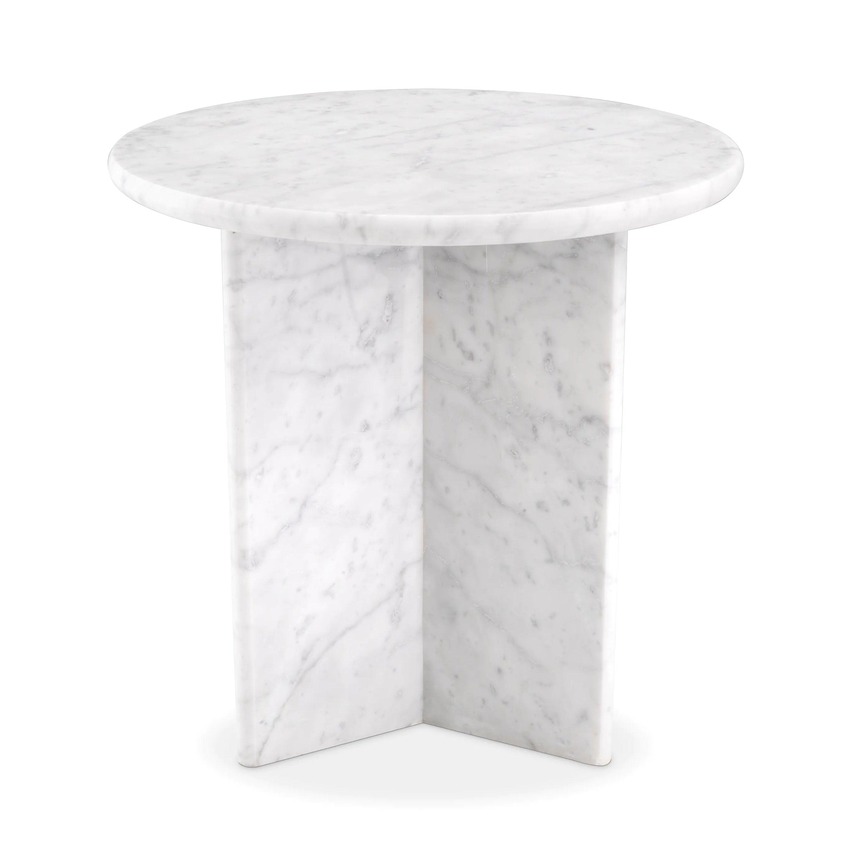 Stół zaskakuje swoją trójnożną podstawą, której linie płynnie przechodzą w gładką, okrągłą powierzchnię blatu. Biały marmur, z którego został stworzony, emanuje chłodem i elegancją, jednak jego delikatne żyłkowanie dodaje mu ciepła, czyniąc go jednocześnie intymnym i luksusowym. Te subtelne wzory przypominają mgliste krajobrazy, które zmieniają się w zależności od kąta padania światła, co sprawia, że stolik żyje wraz z przestrzenią wokół siebie.